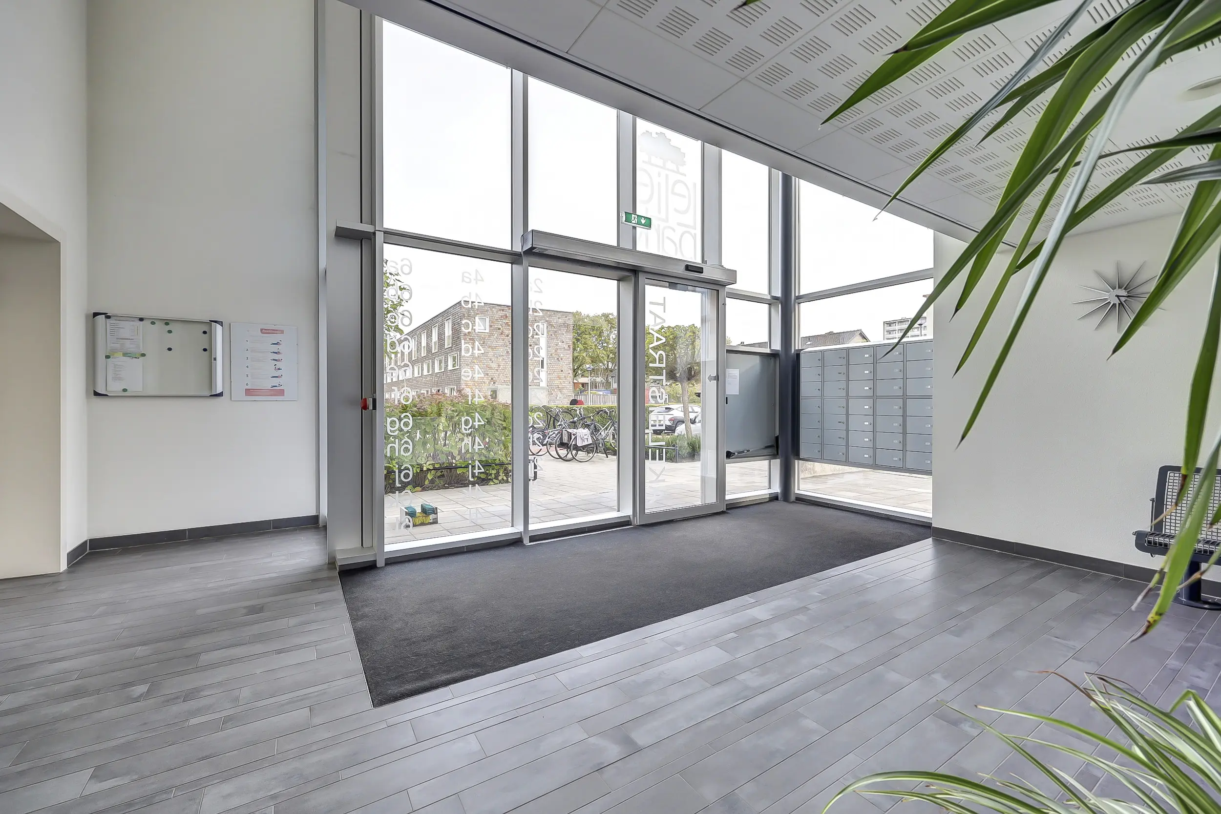 Binnenkomst in de centrale hal met hoog plafond en grote raampartijen met veel daglichttoetreding.