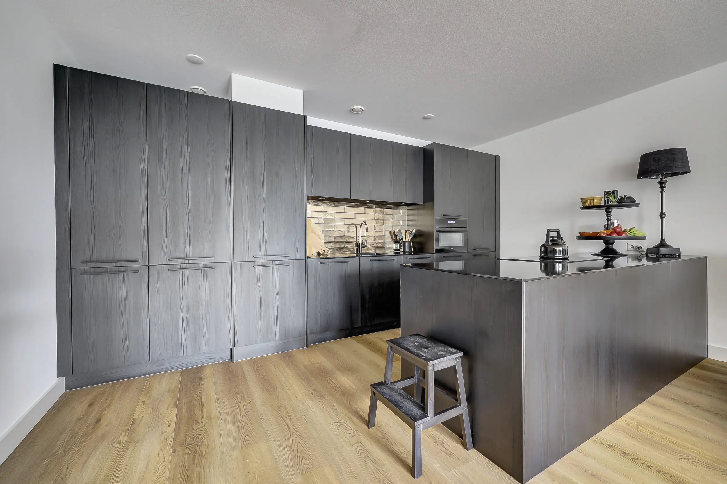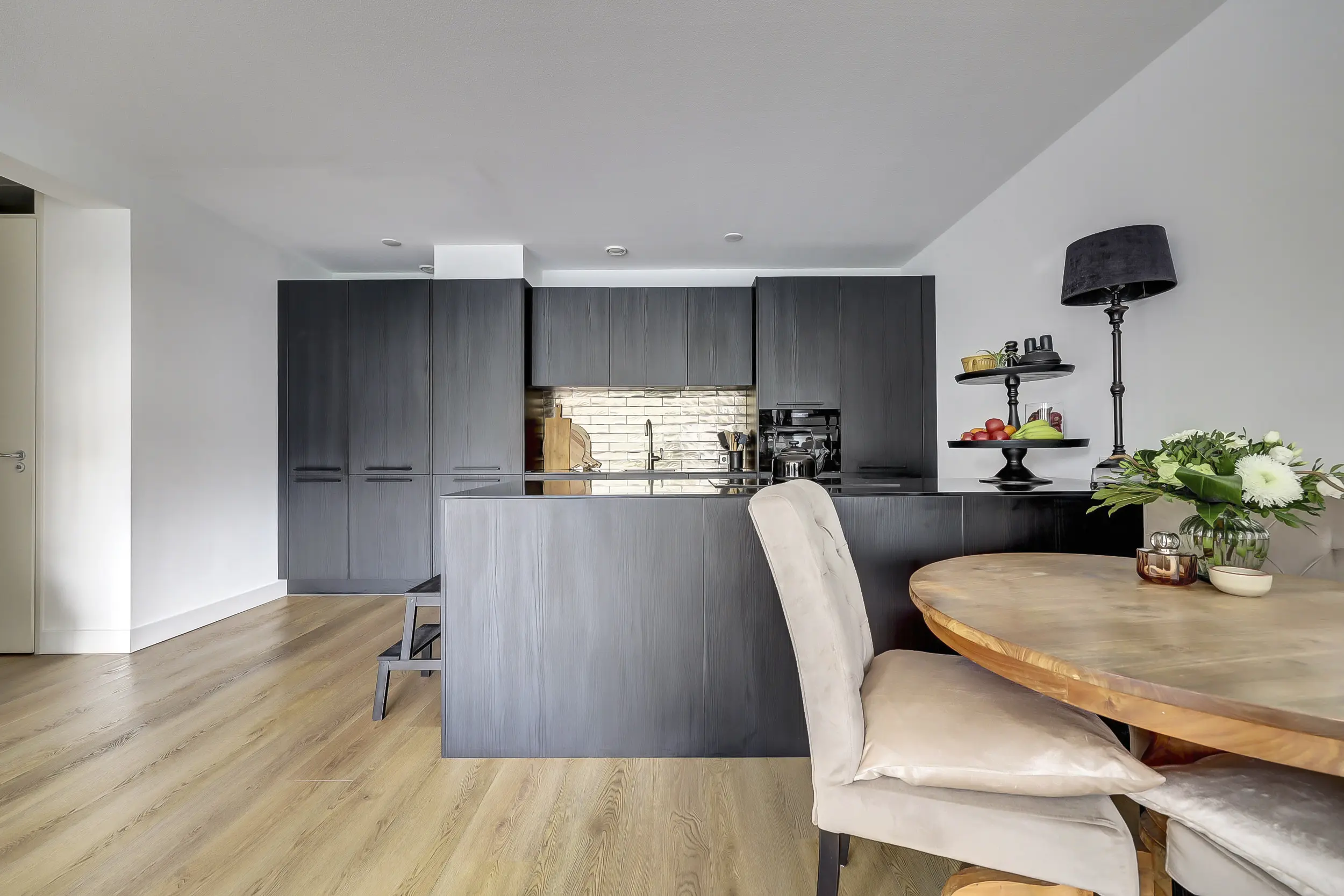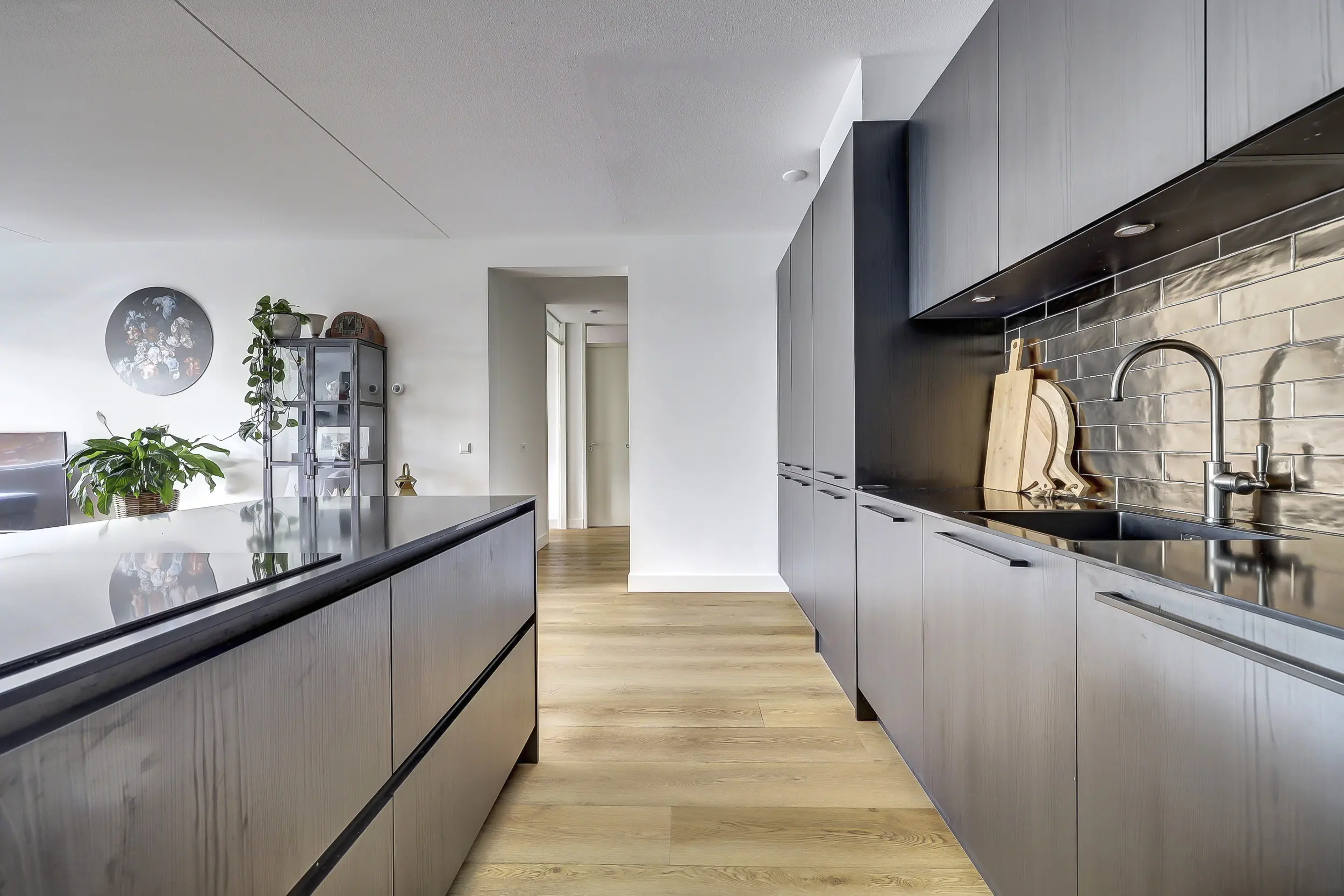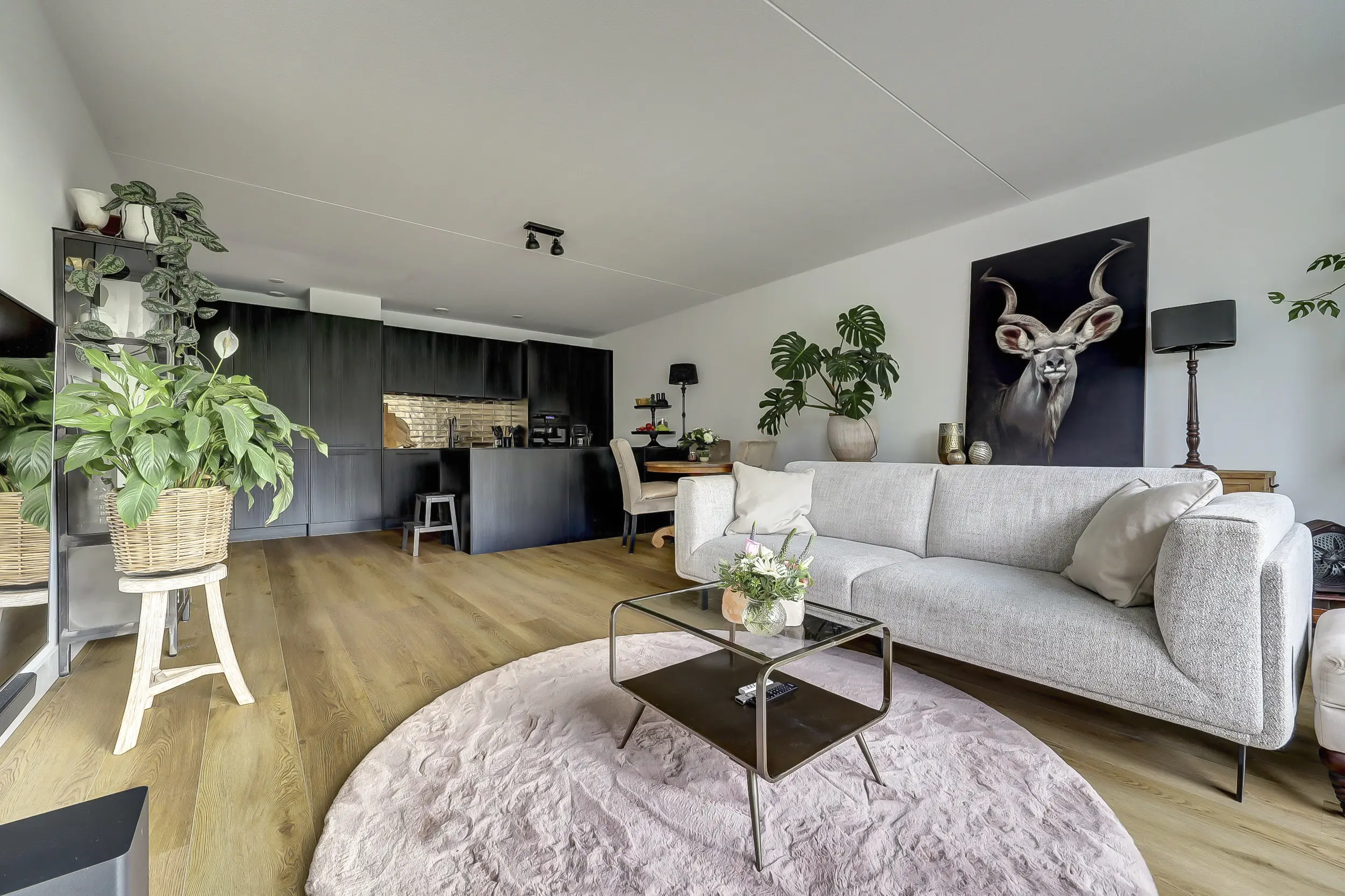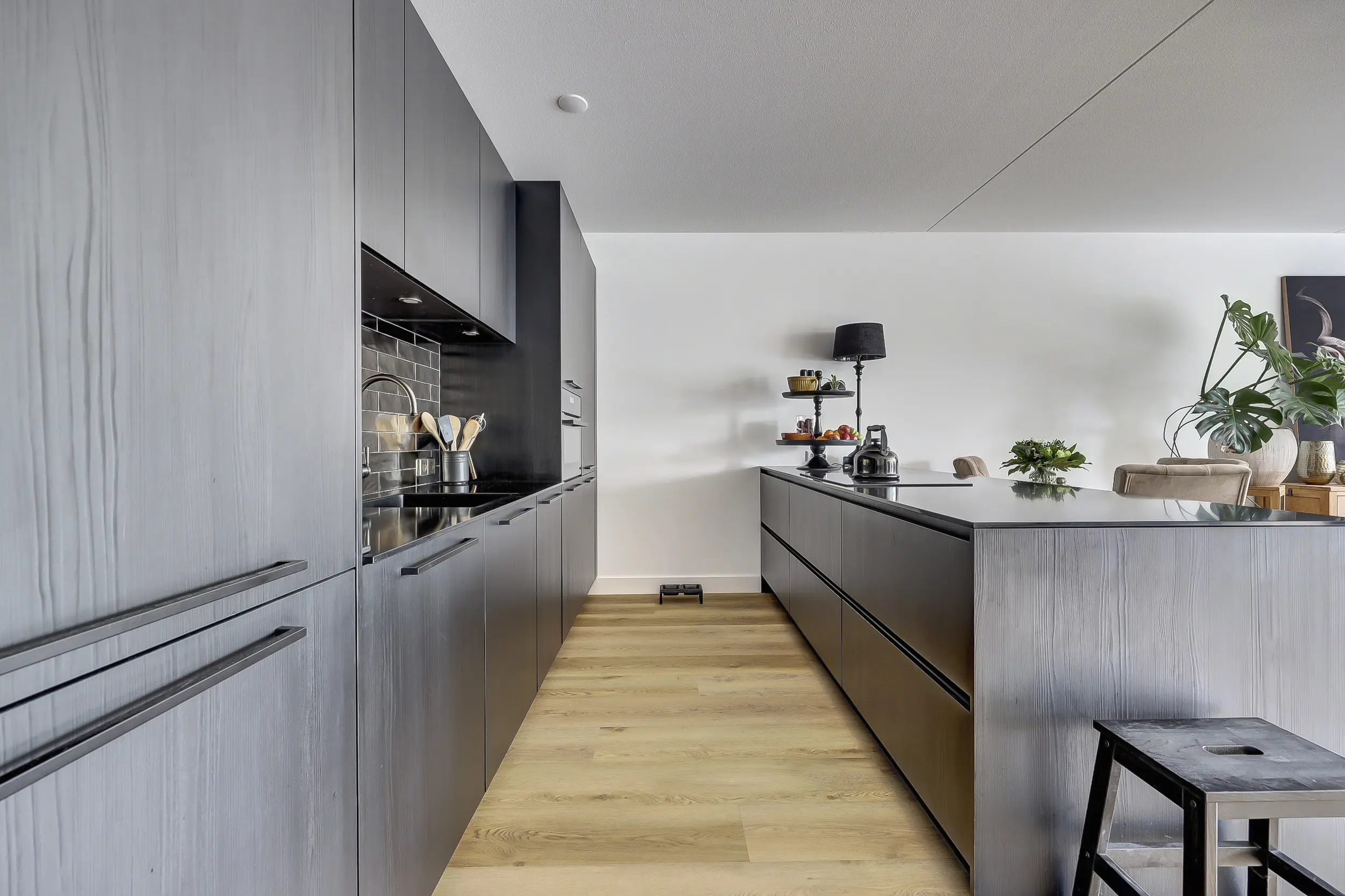 De ruime woonkamer is uitgevoerd met een luxe open keuken voorzien van kookeiland, veel kastruimte en inbouwapparatuur als koel-vriescombinatie, vaatwasser en combi-oven.