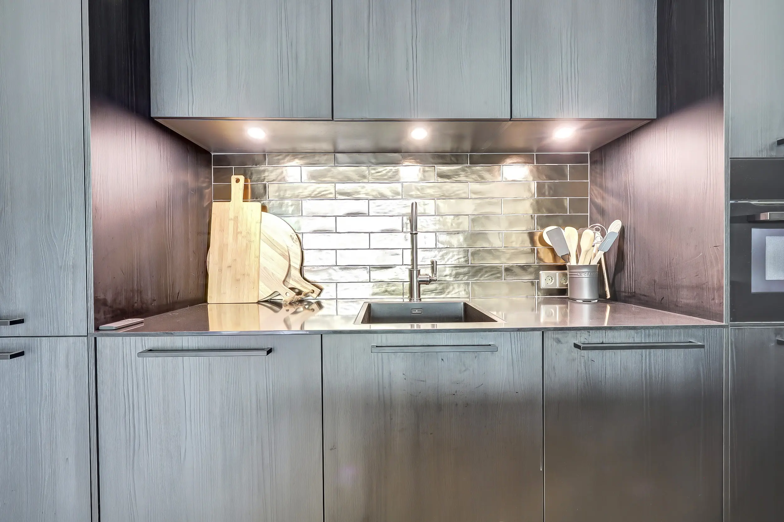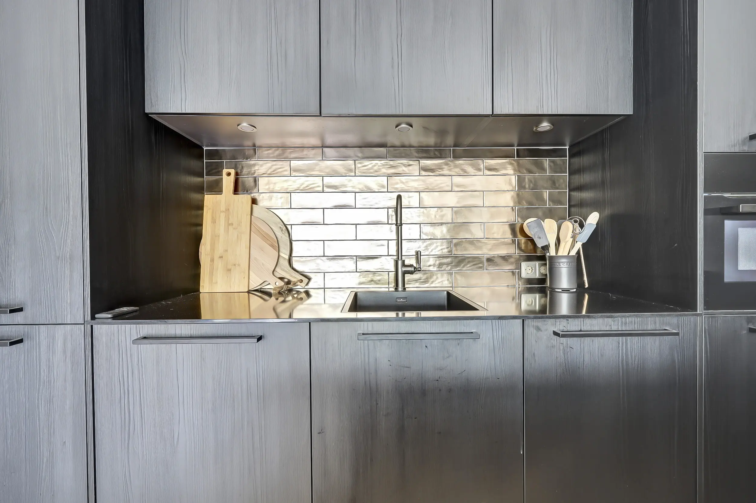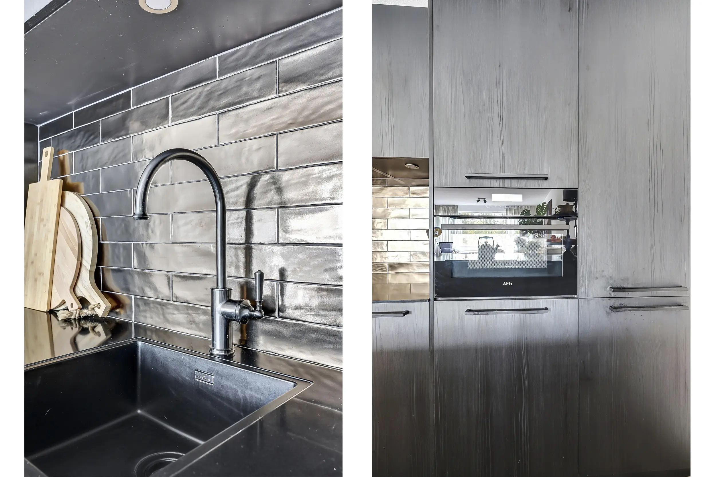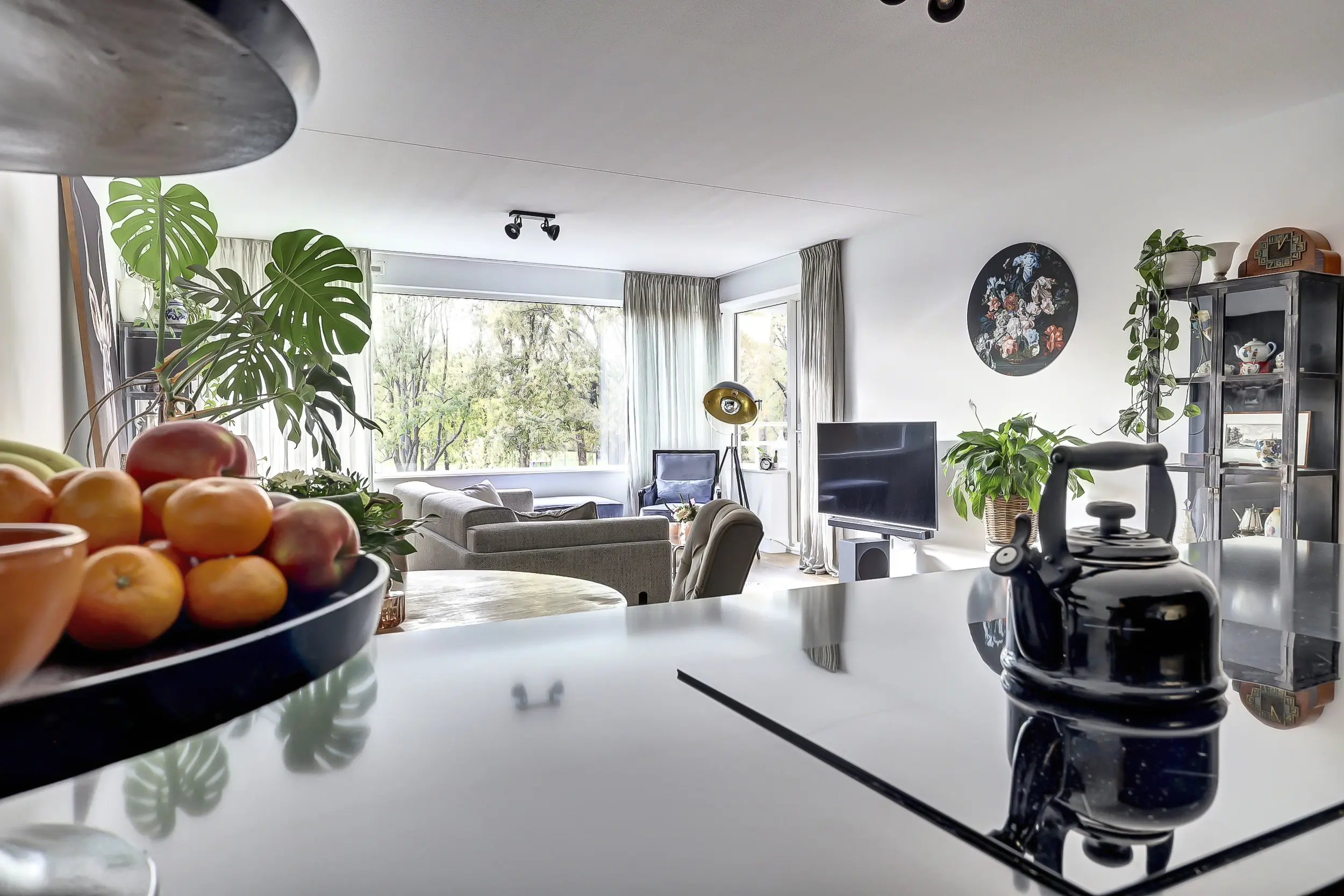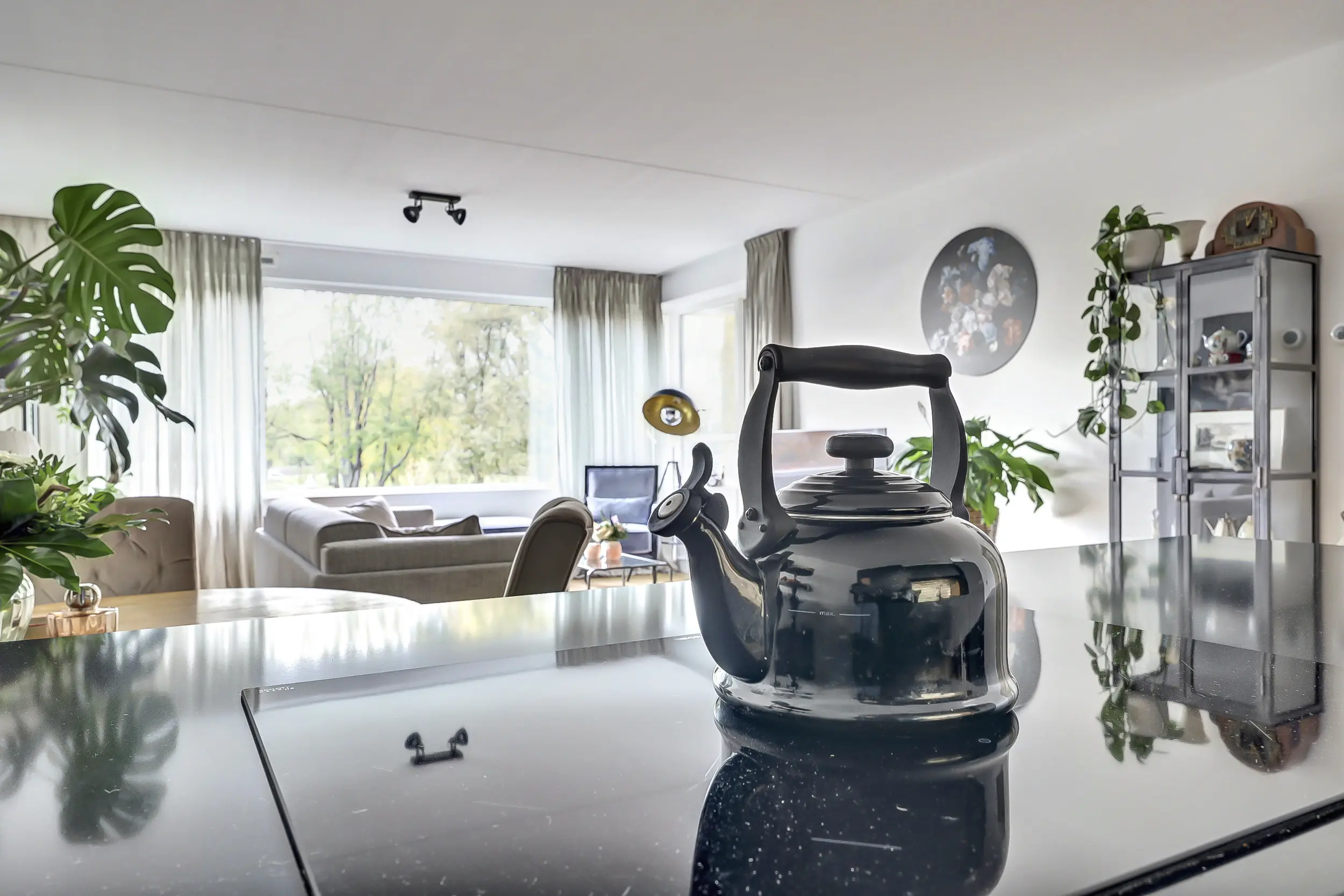 De ruime woonkamer is uitgevoerd met een luxe open keuken voorzien van kookeiland, veel kastruimte en inbouwapparatuur als koel-vriescombinatie, vaatwasser en combi-oven.