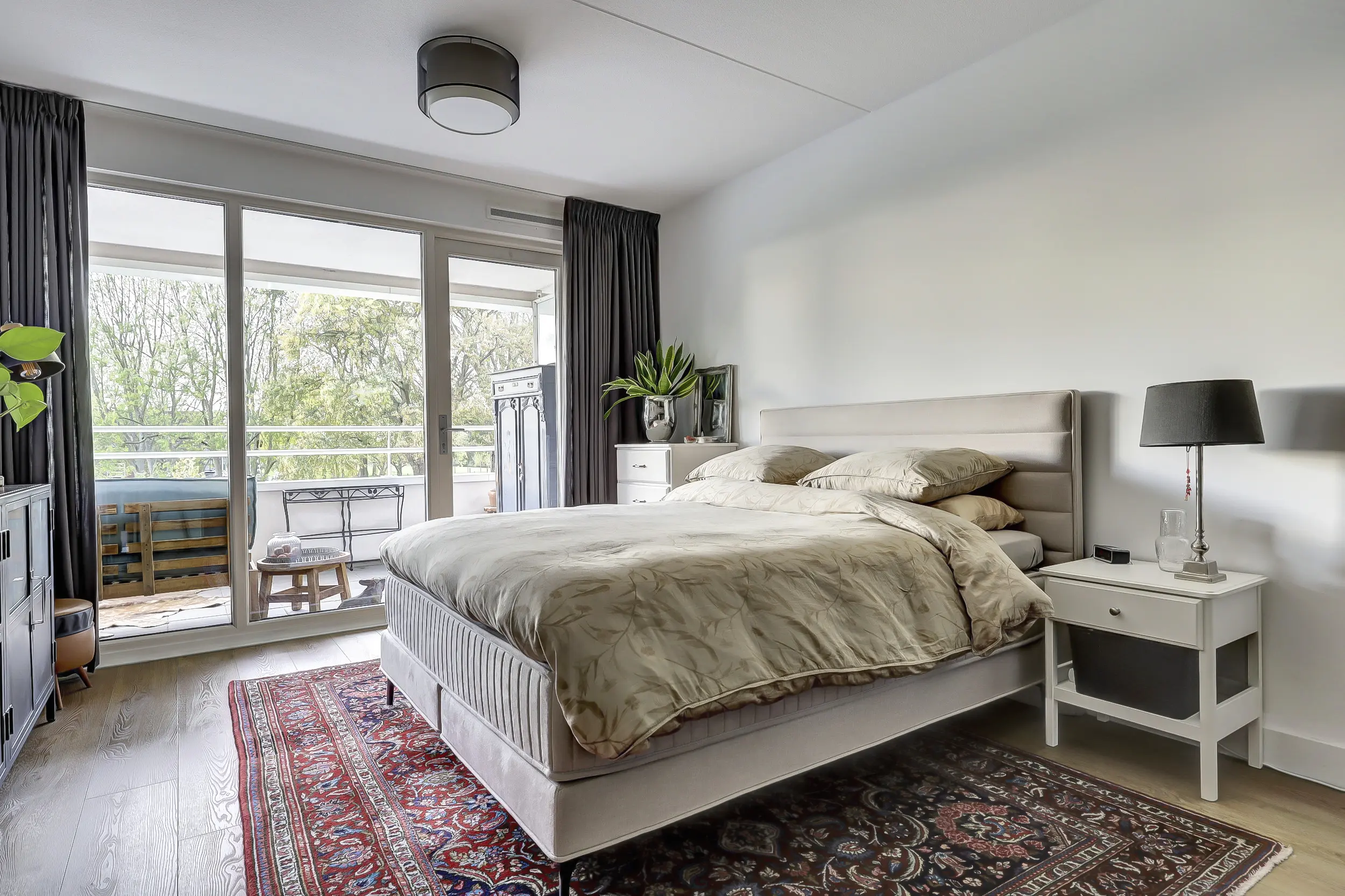 Aan de balkonzijde treft u 2 grote slaapkamers met raampartijen vanaf de grond tot aan het plafond.