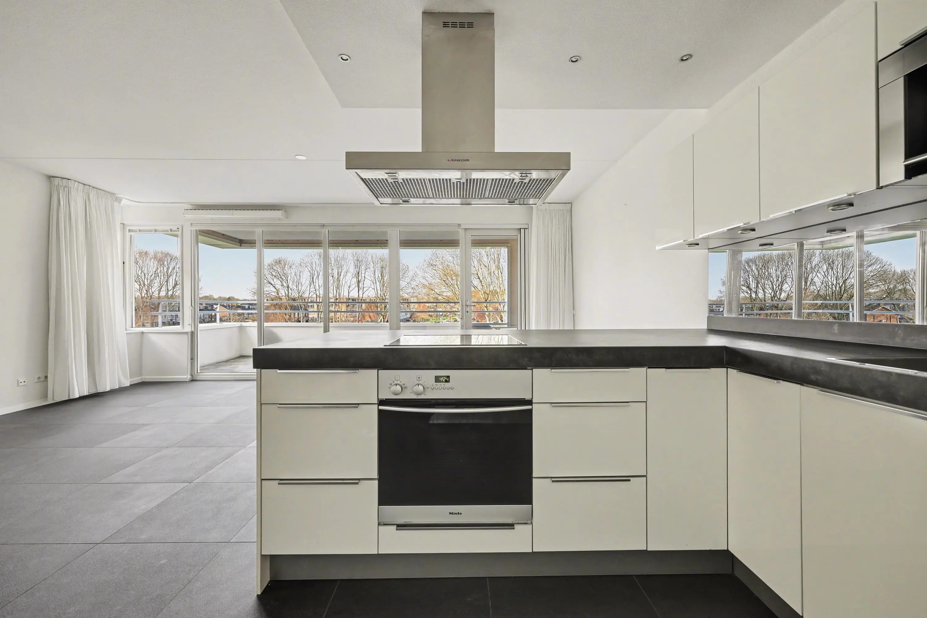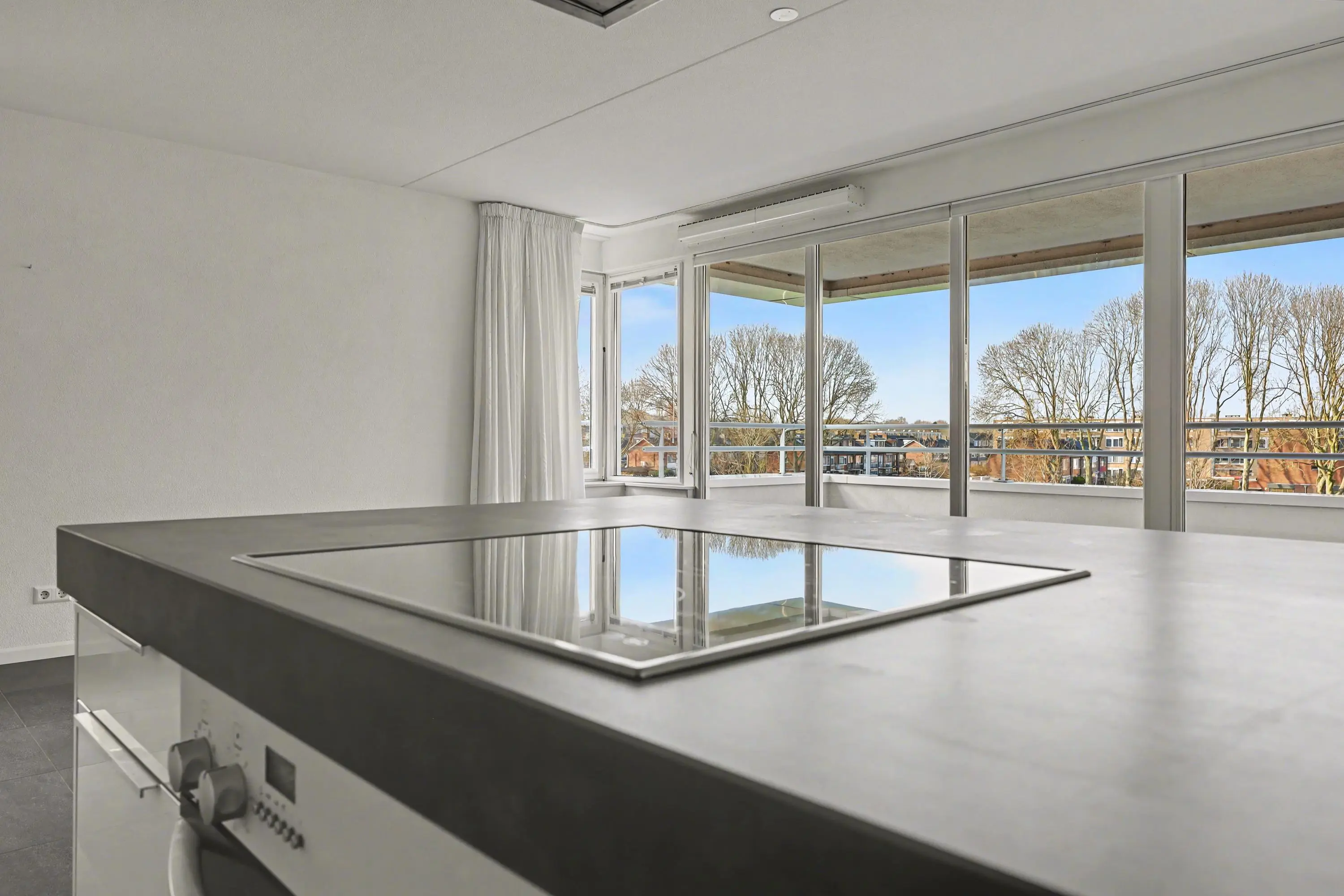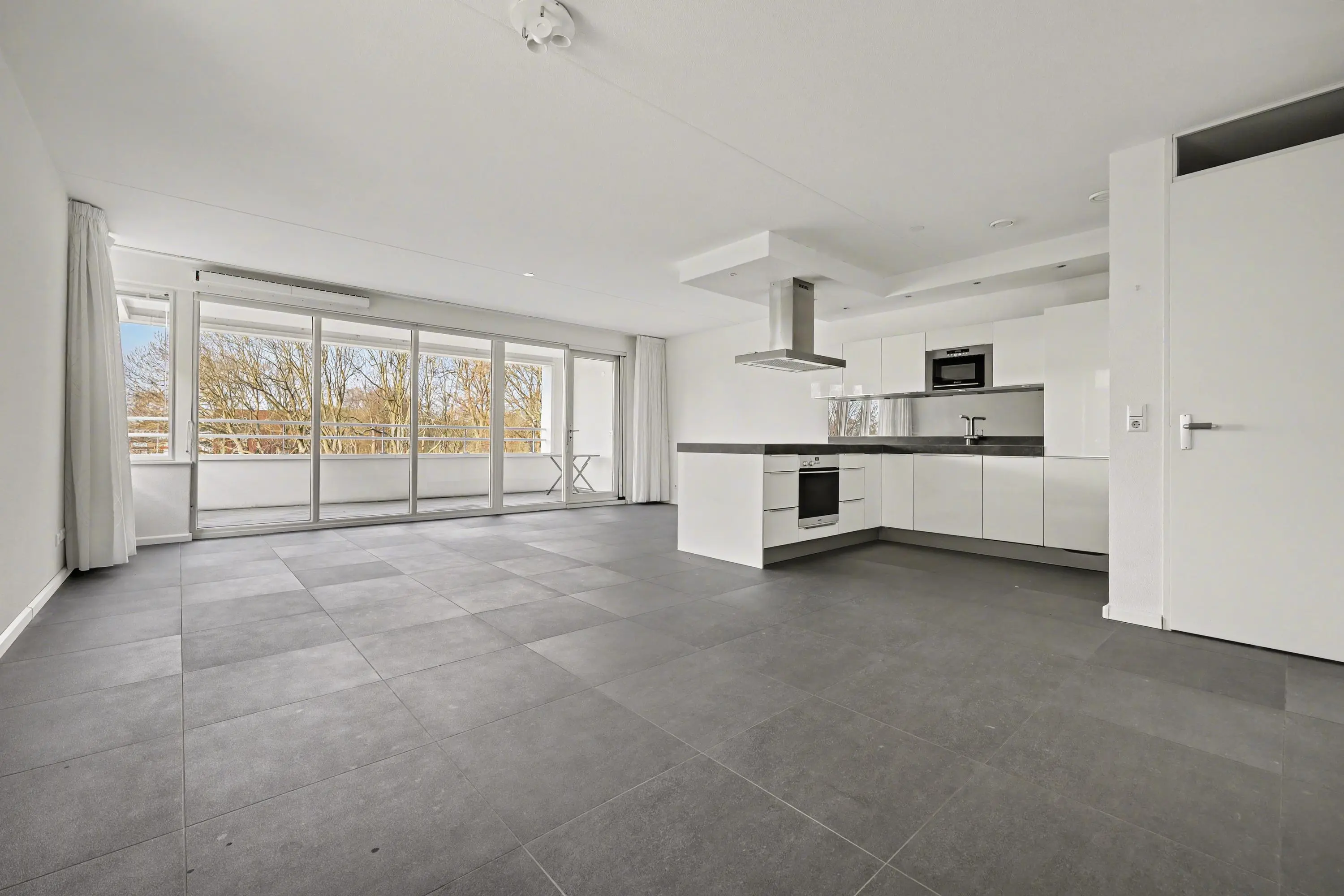 Ter plaatse van het balkon heb je raampartijen vanaf de grond tot aan het plafond.