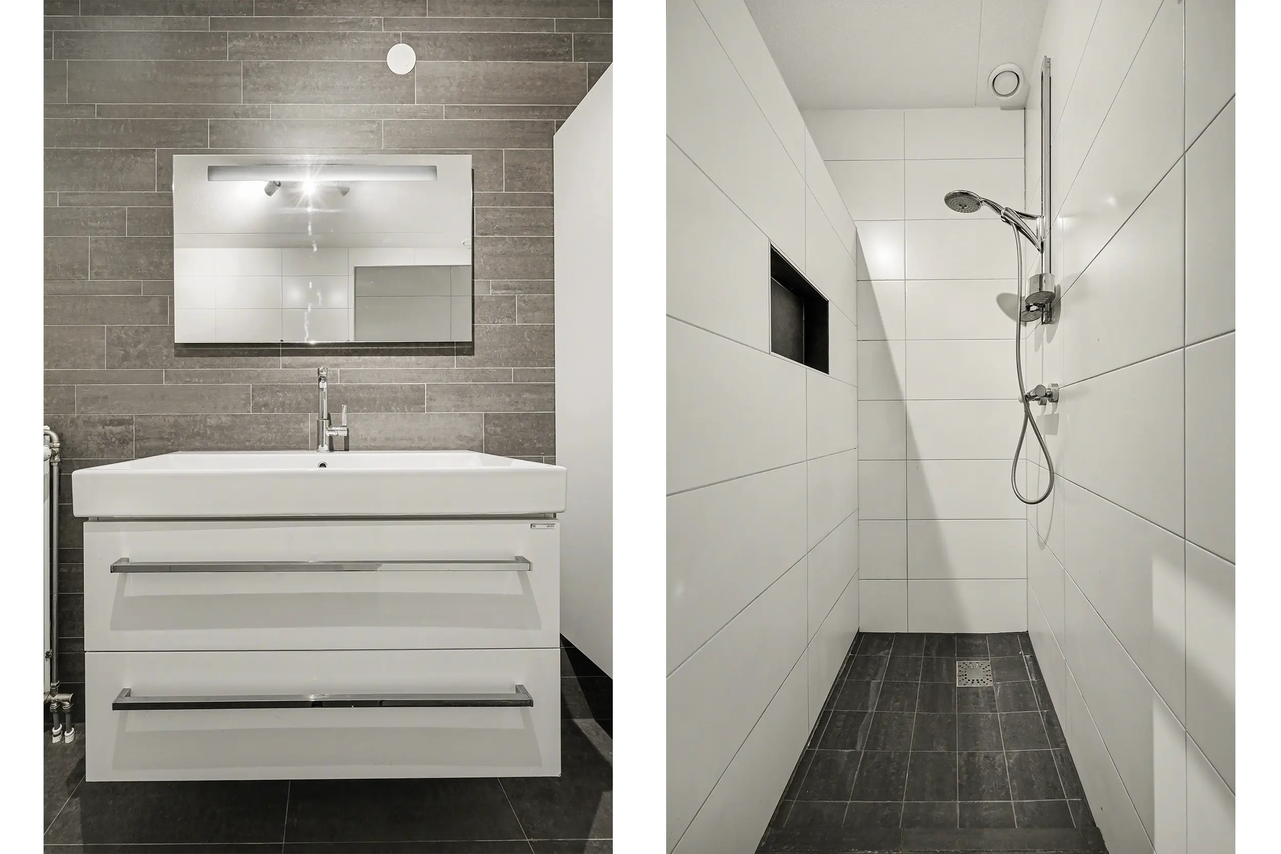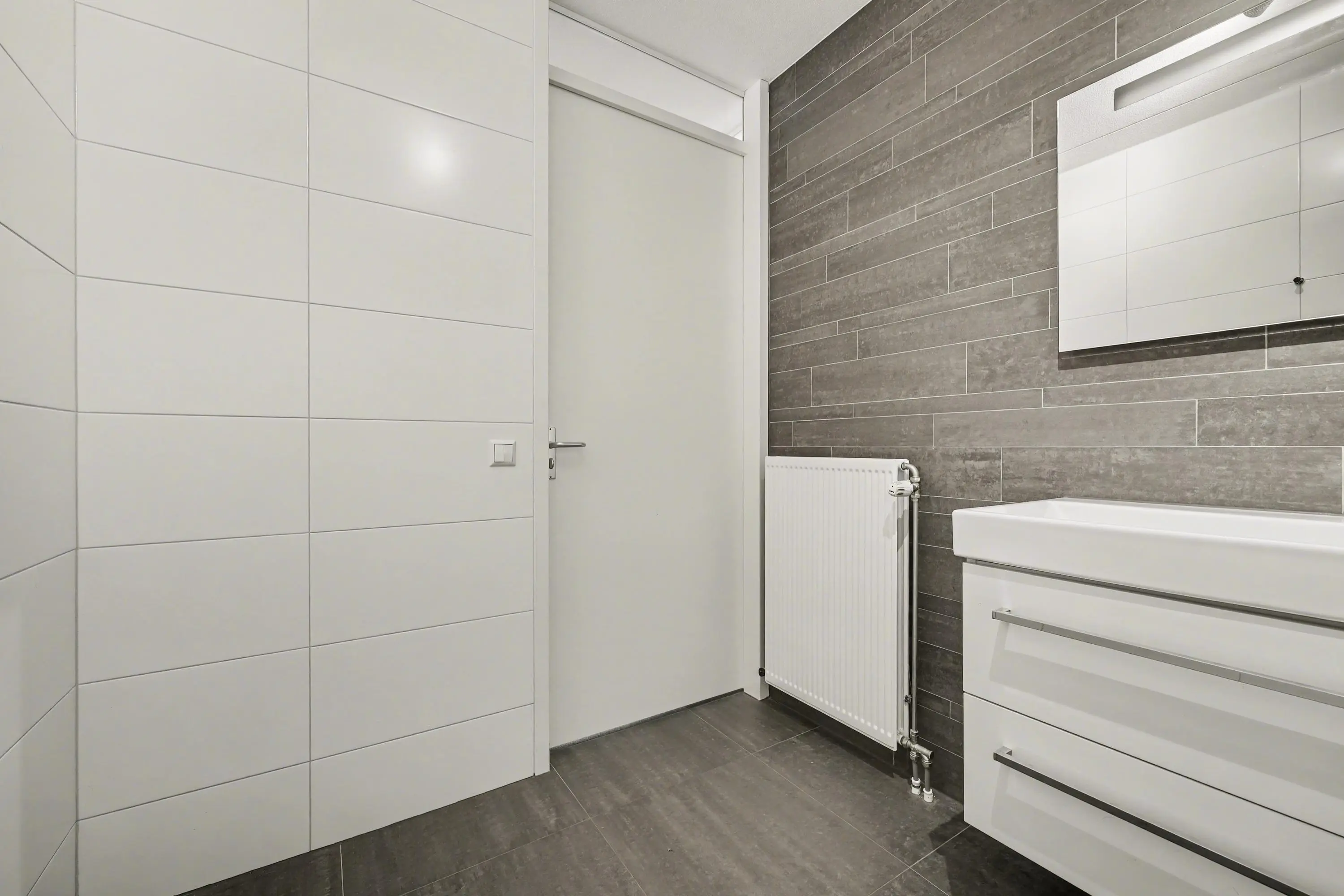 De badkamer is geheel betegeld en uitgevoerd met wastafelmeubel en inloopdouche, ter plaatse van de hal tref je het toilet en een bergkast. Het appartement heeft totaal 2 slaapkamers