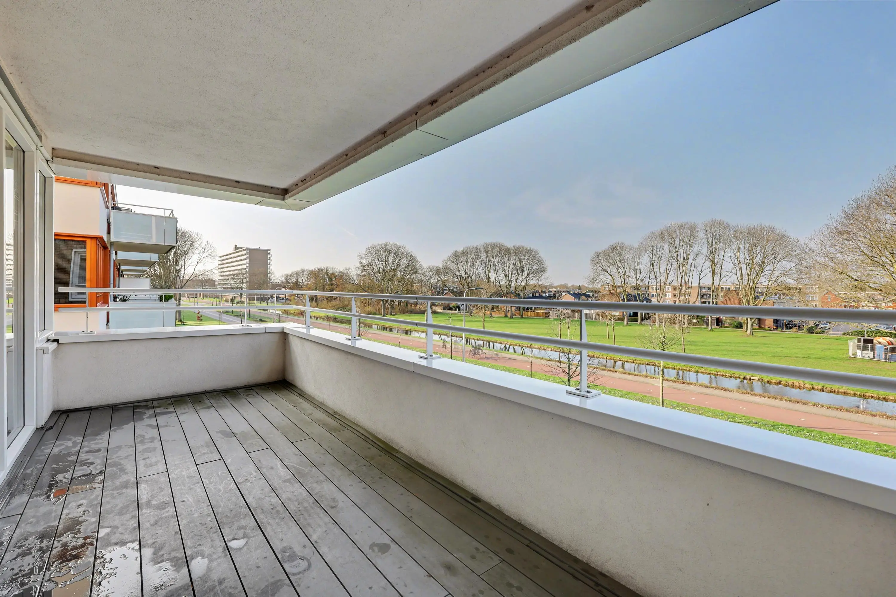 Het balkon is gelegen op het Westen (middagzon) en geeft uitzicht over onder andere het Hartelpark waar Schotse Hooglanders grazen, de ijsvogel vliegt en waar zelf een bever zijn thuis heeft gevonden!