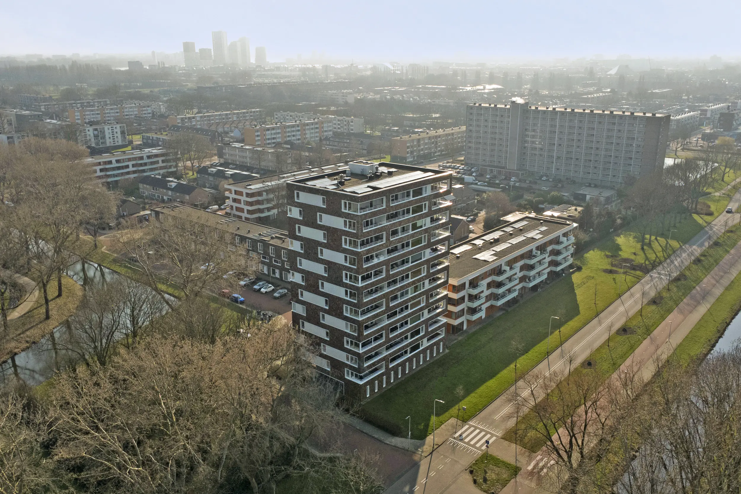 Aan de rand van het Hartelpark ligt dit schitterende appartementencomplex met leistenen gevelbekleding.