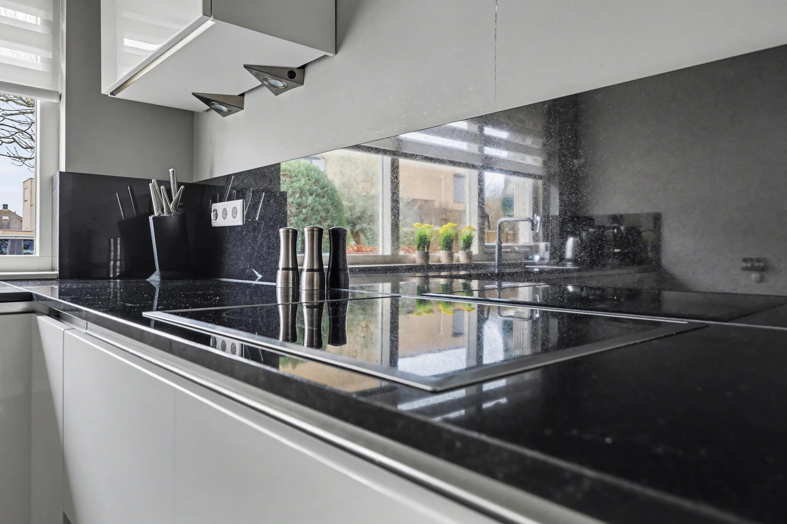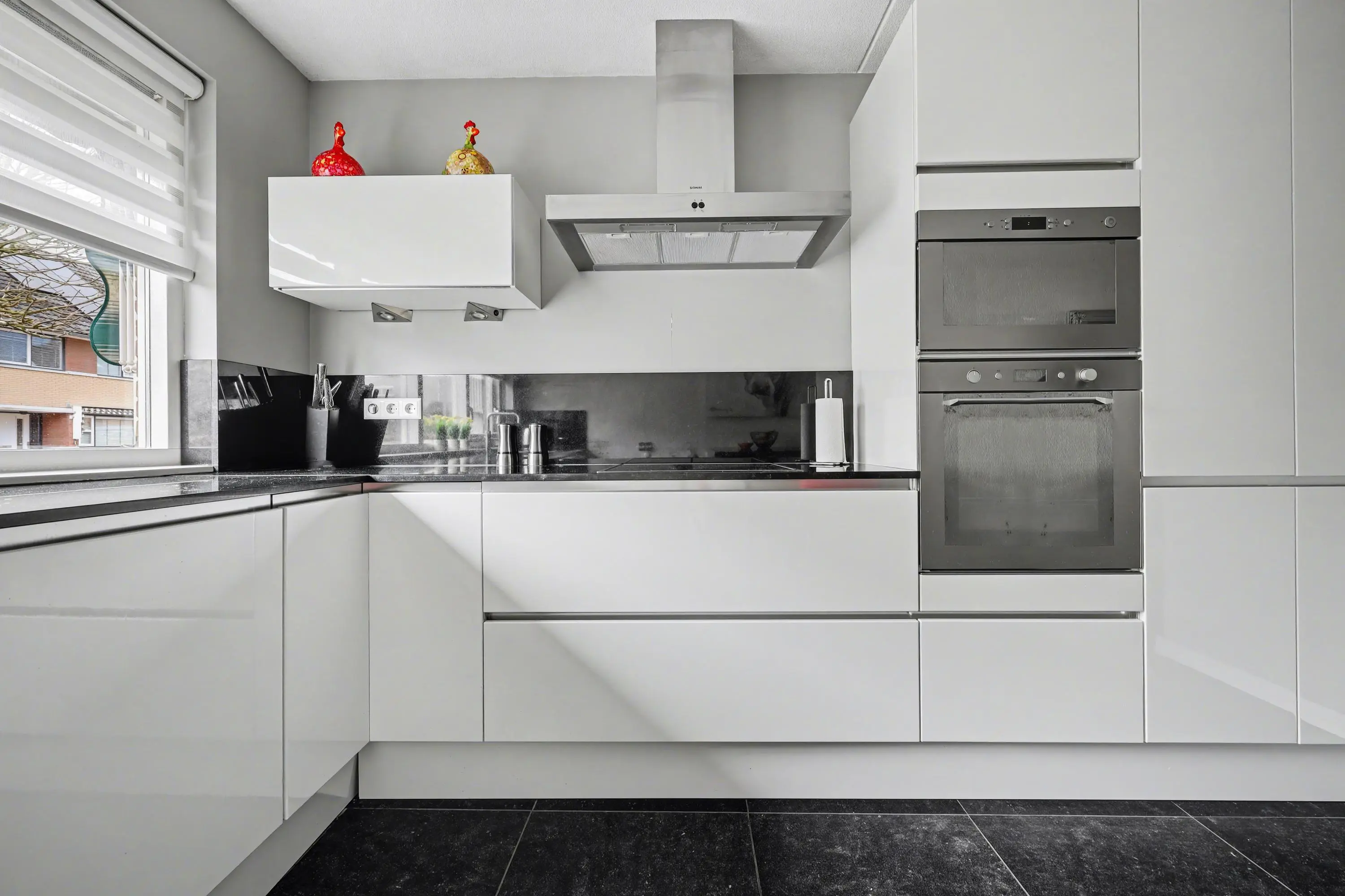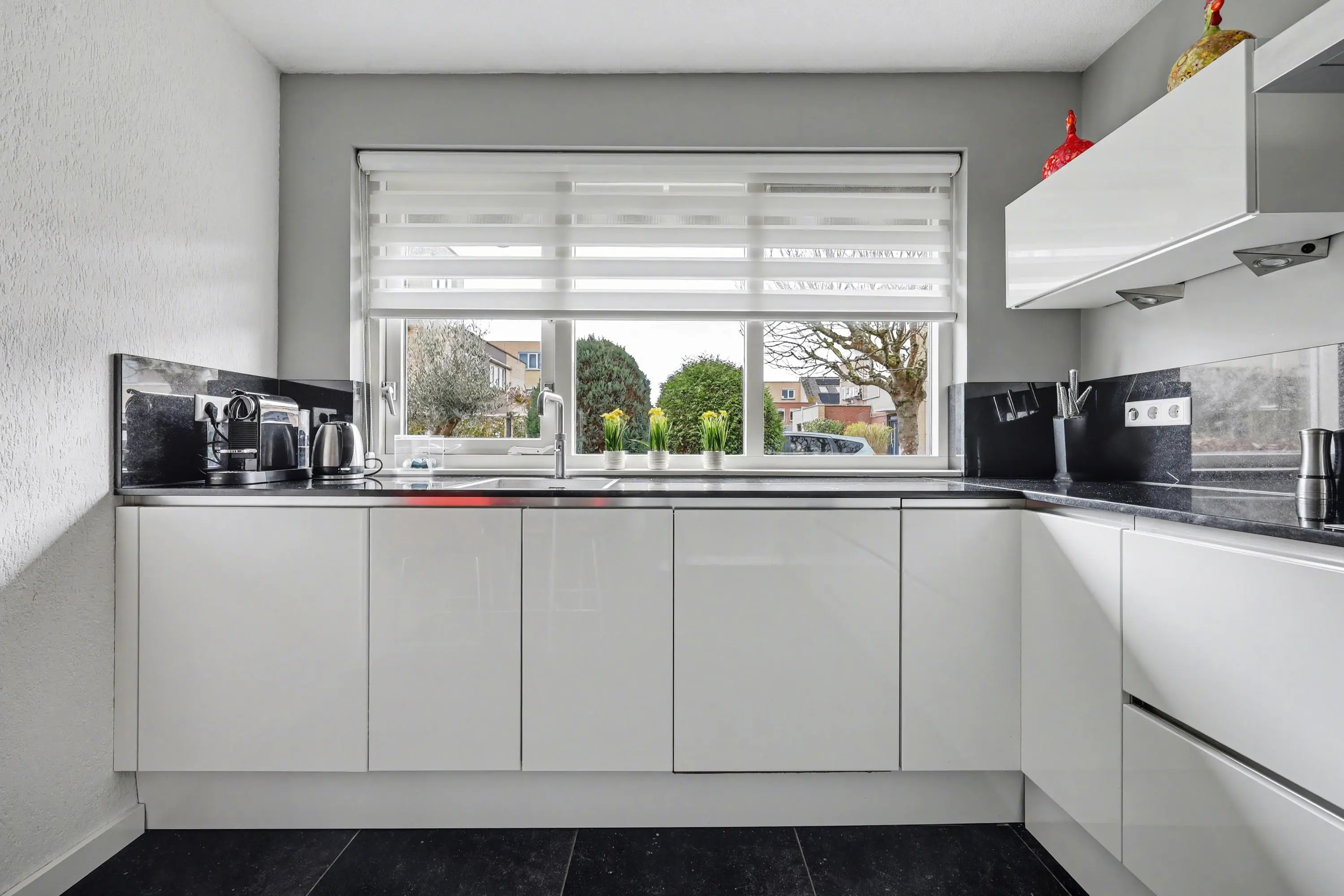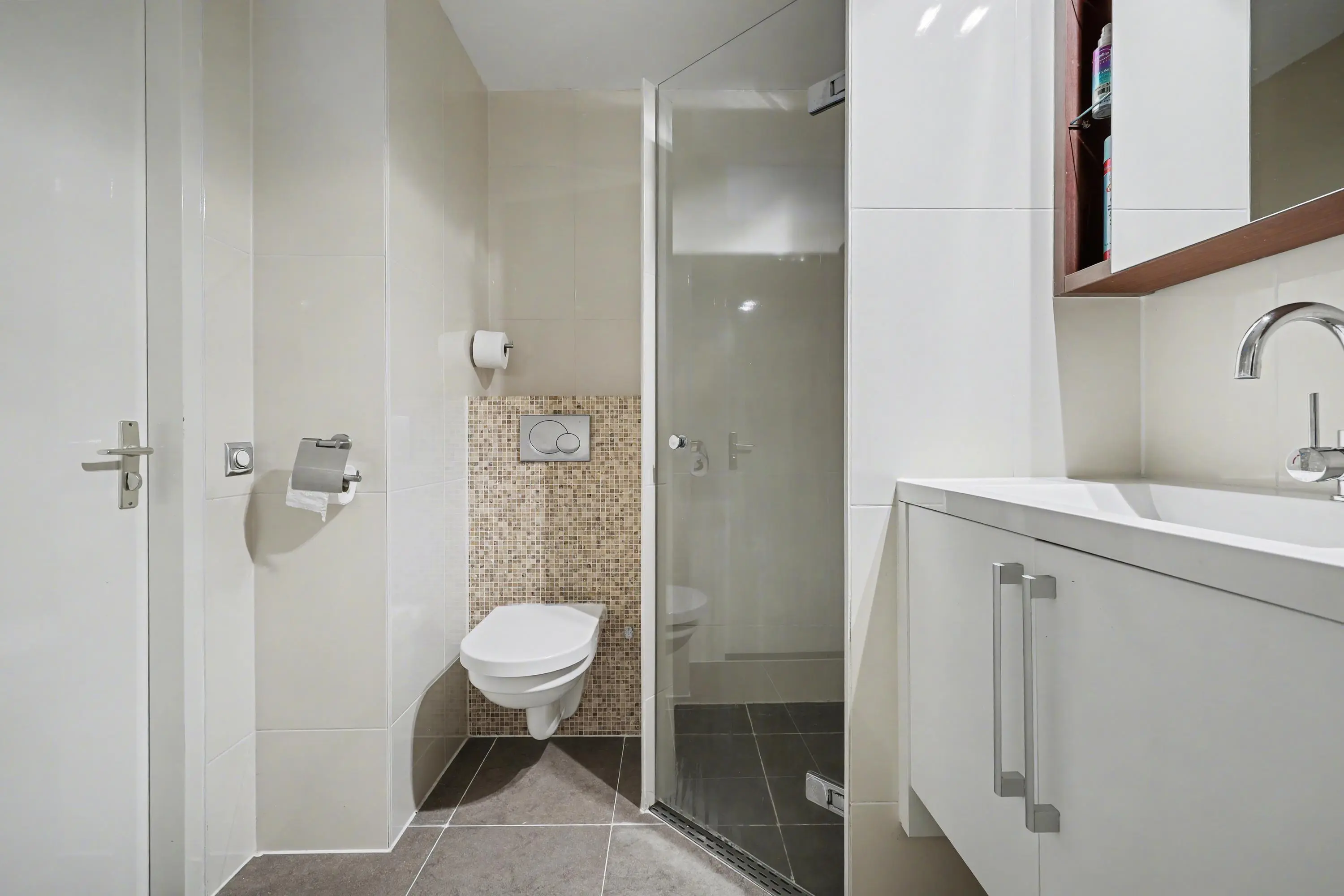 De begane grond verwelkomt je met een ruime woonkamer die badend is in natuurlijk licht. De strakke open keuken is voorzien van inbouwapparatuur.