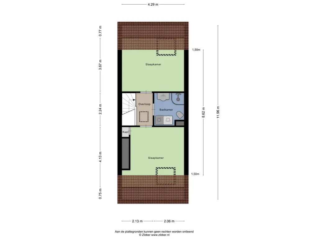De overloop geeft toegang tot de twee slaapkamers aan de voor- en achterzijde van de woning. De badkamer is uitgerust met een toilet, douche, wastafel en wasmachine aansluiting.