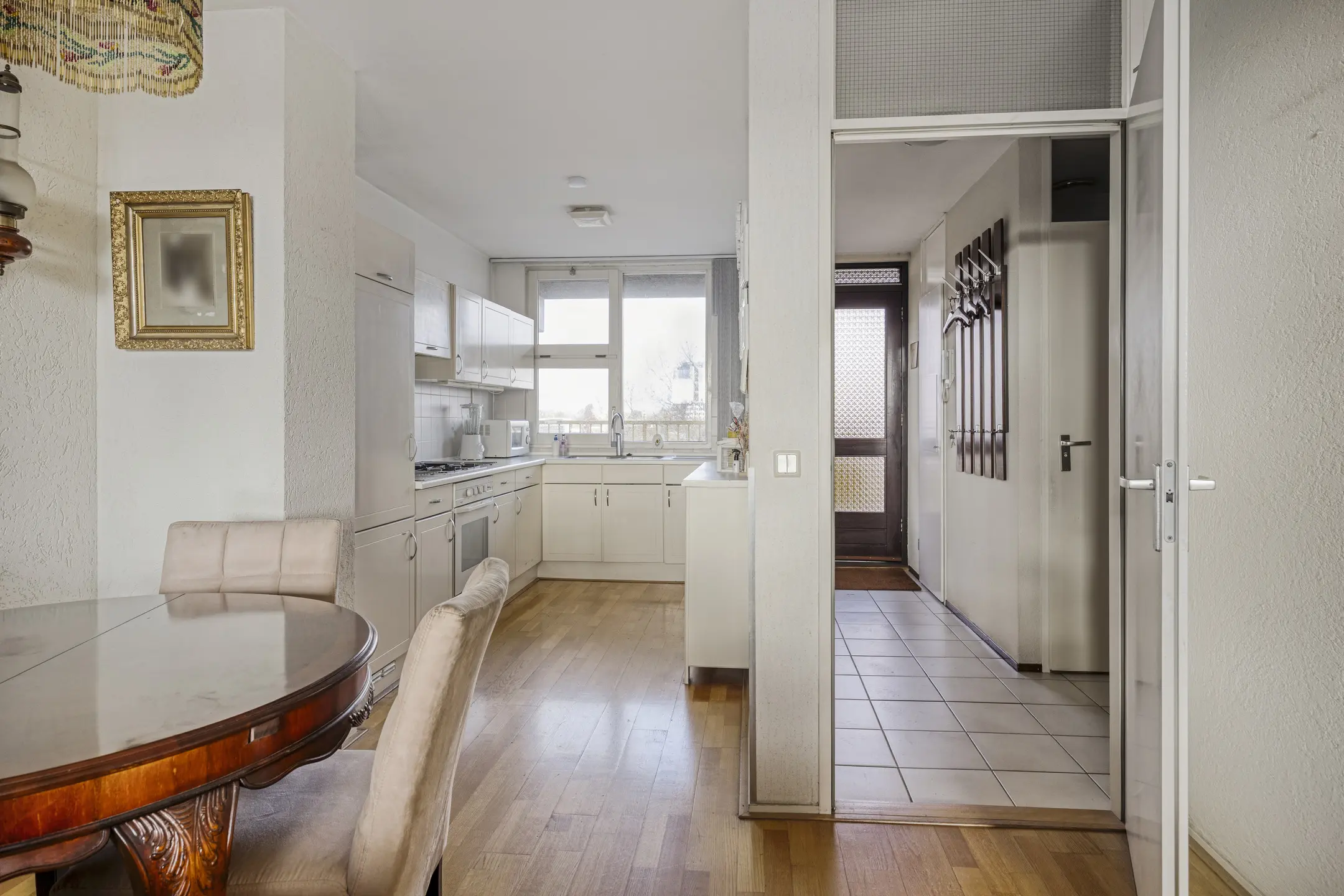 Entreehal die toegang geeft tot de afgesloten toiletruimte, trapopgang en de woonkamer. De woonkamer geniet veel natuurlijk licht door de grote ramen en heeft een nette afwerking. De open keuken in praktische L-opstelling is van alle gemakken voorzien: een gaskookplaat, afzuigkap, koel-/vriescombinatie en een combi oven/magnetron. Vanuit de woonkamer heeft u toegang tot het balkon met een fantastisch uitzicht!
