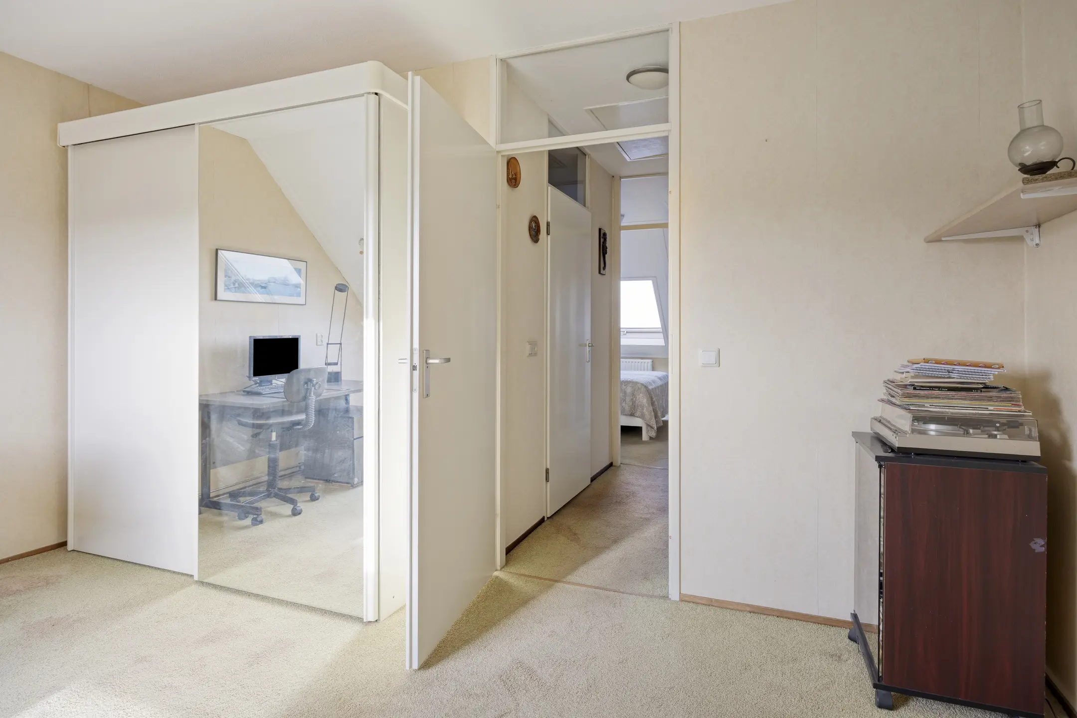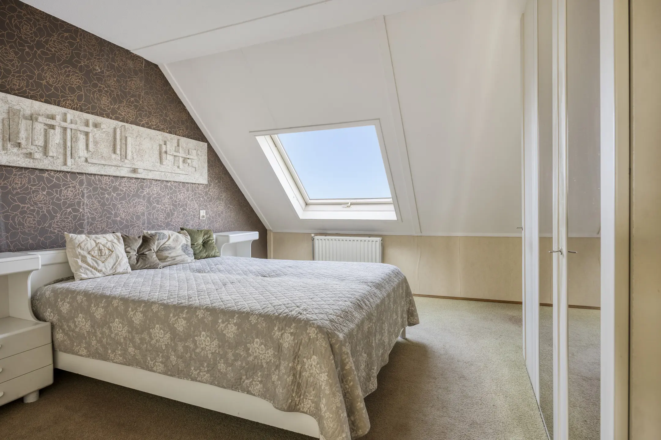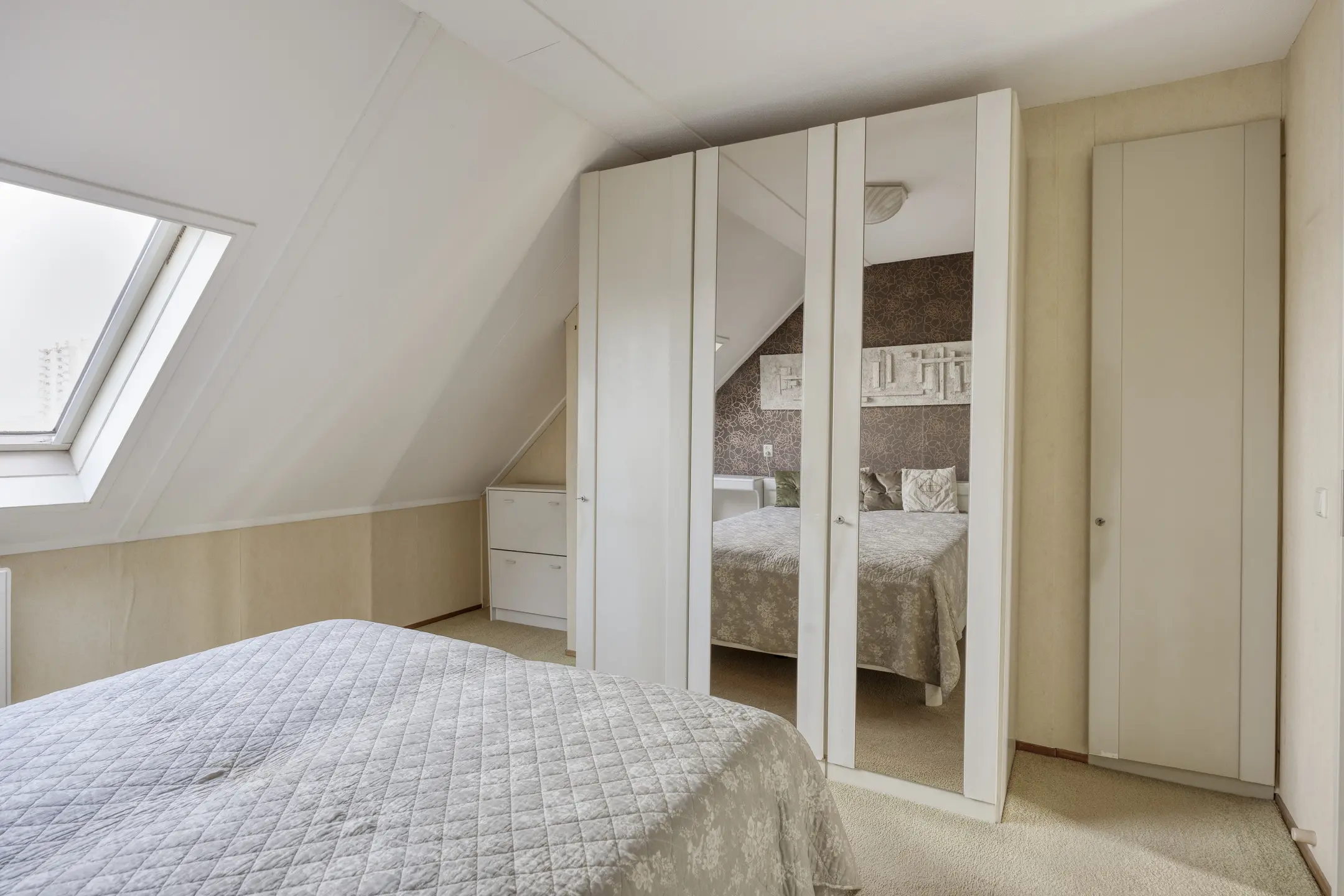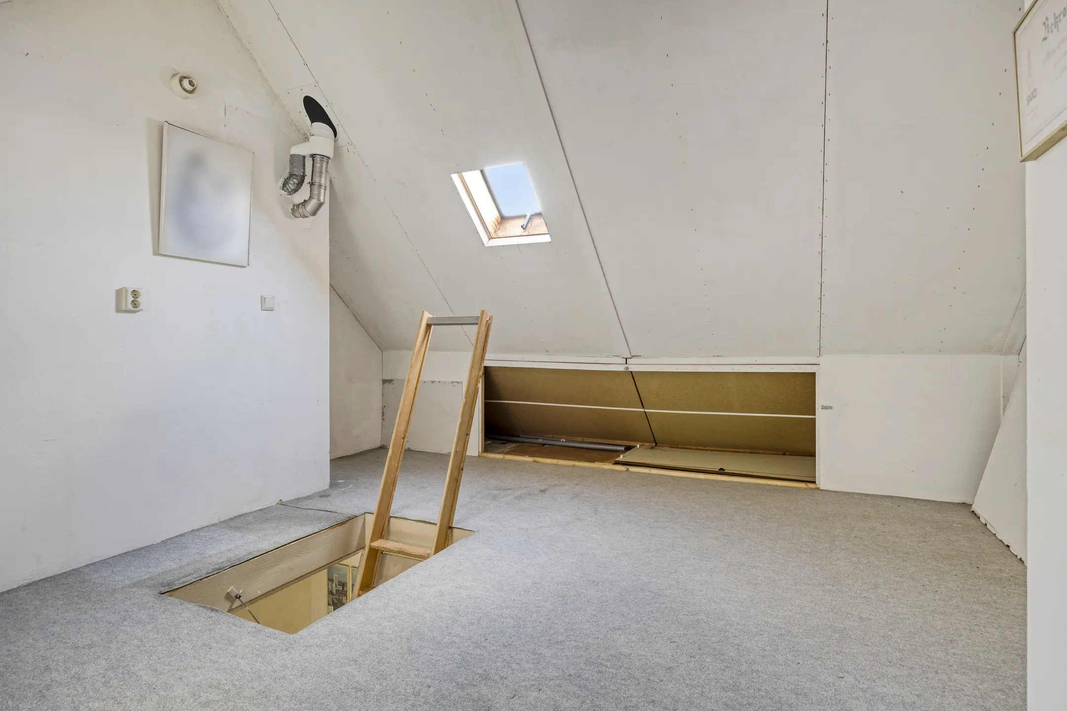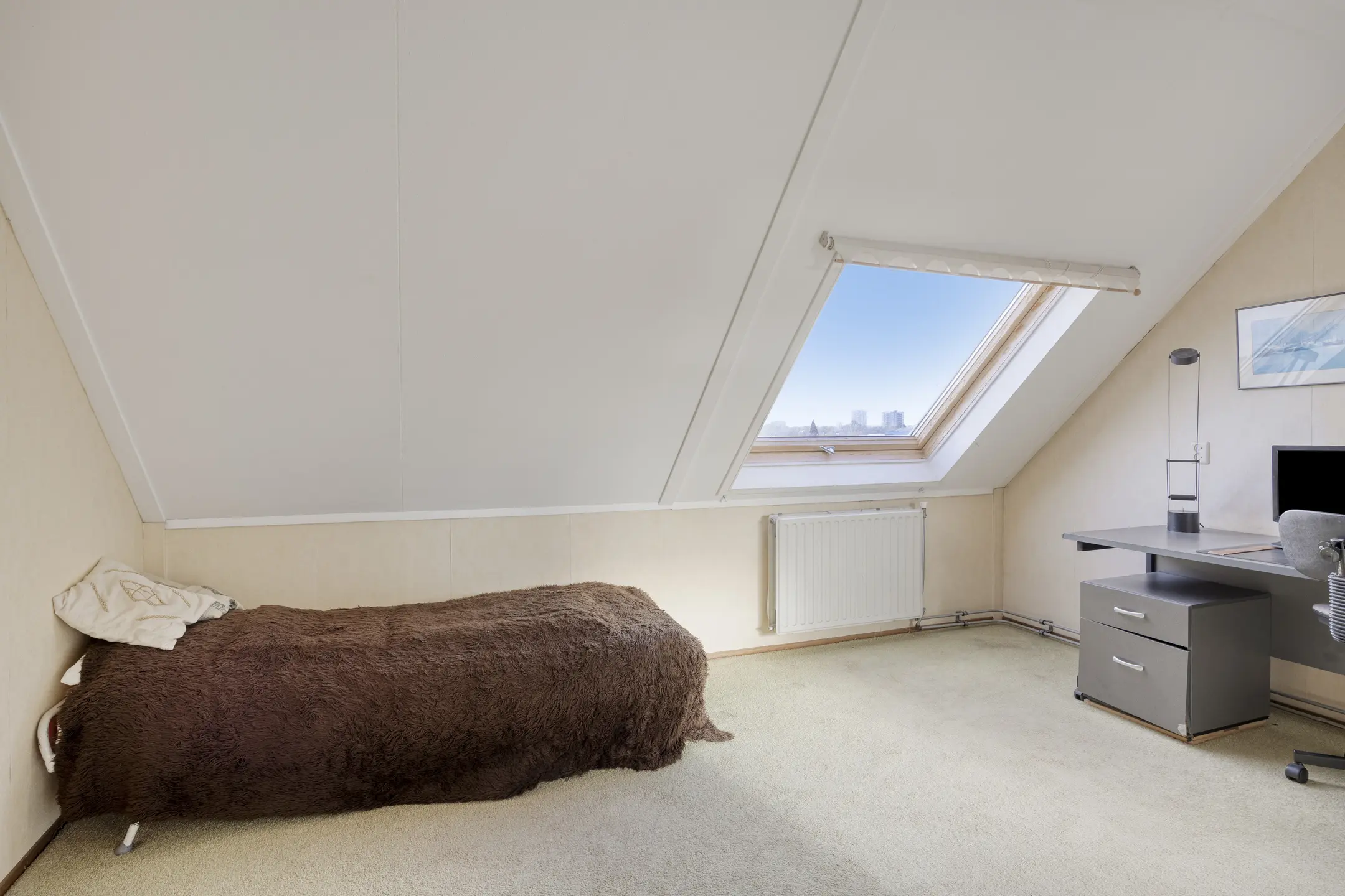 Open zolderkamer met knieschotten voor opbergruimte en dakramen voor voldoende daglicht om deze kamer als werk- of slaapkamer te gebruiken.
