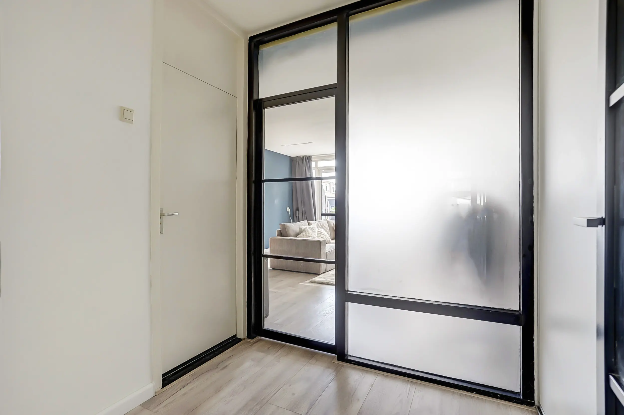 Via een tweede matzwarte deur met grote raampartijen treedt je de woonkamer binnen en ben je direct verrast door de genereuze lichtinval vanaf het dakterras.