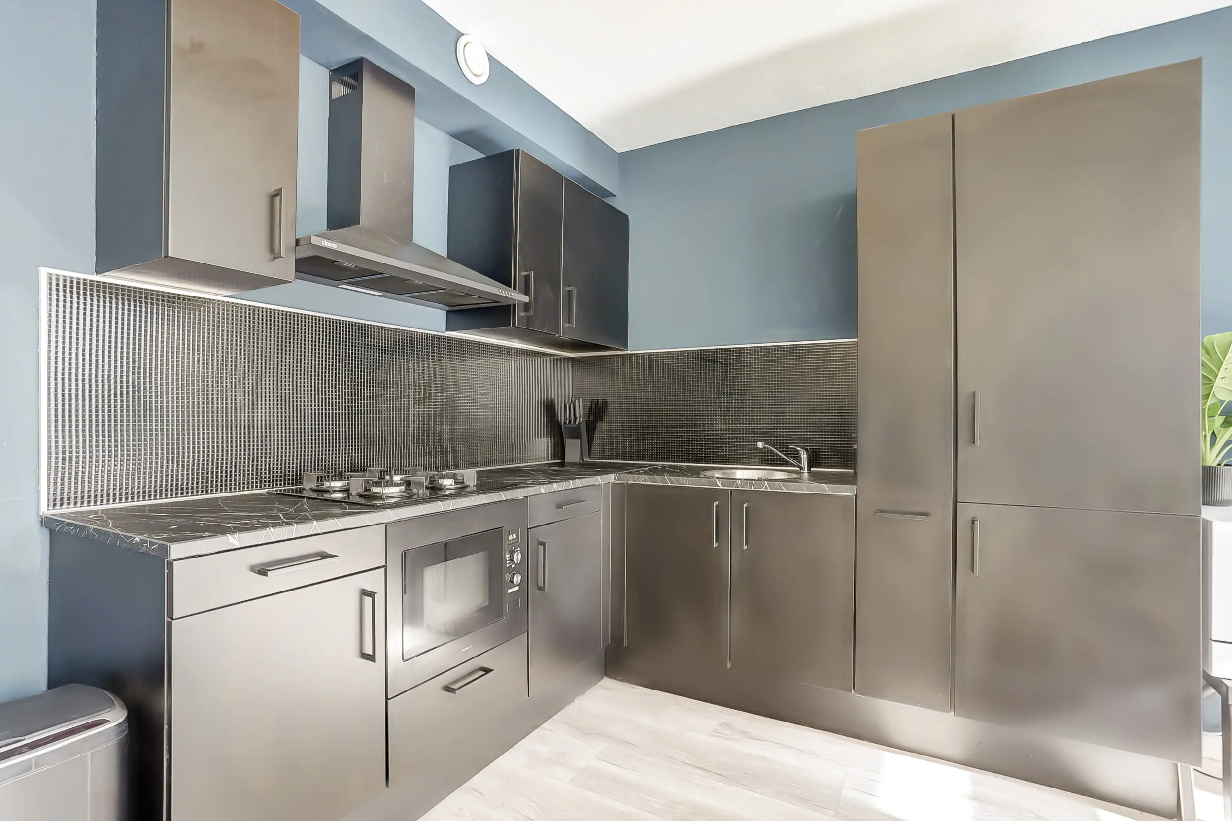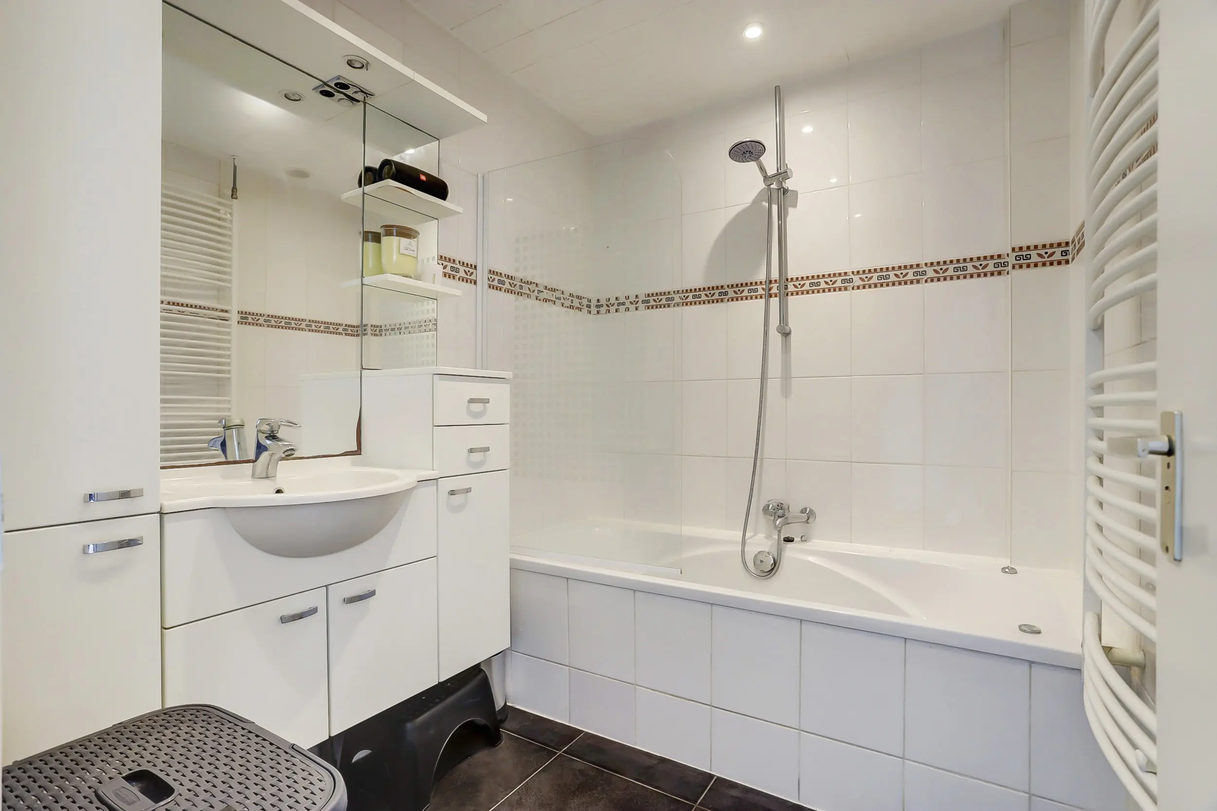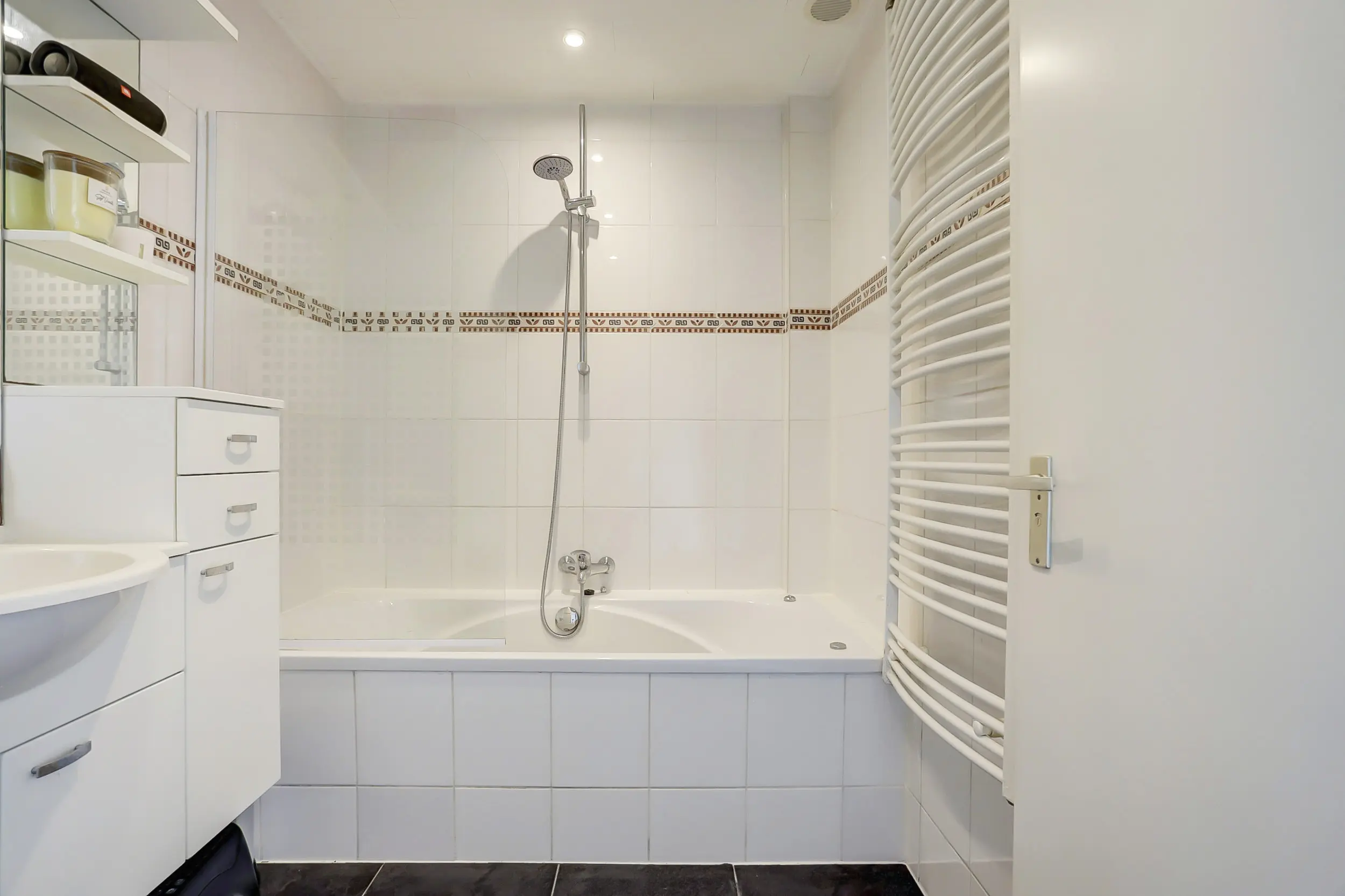 Via de matzwarte deur kom je in de tussenhal met nog een bergkast en toegang tot de badkamer met ligbad, douche en wastafelmeubel.
