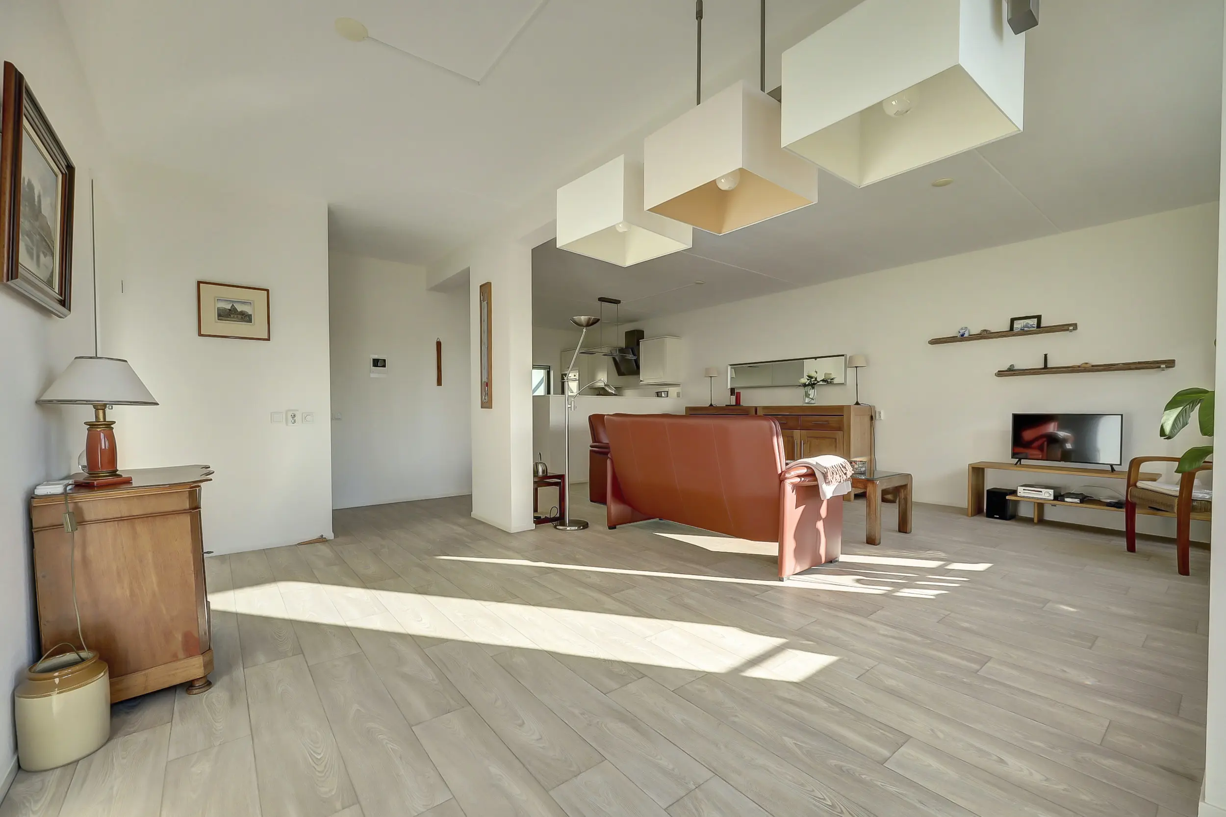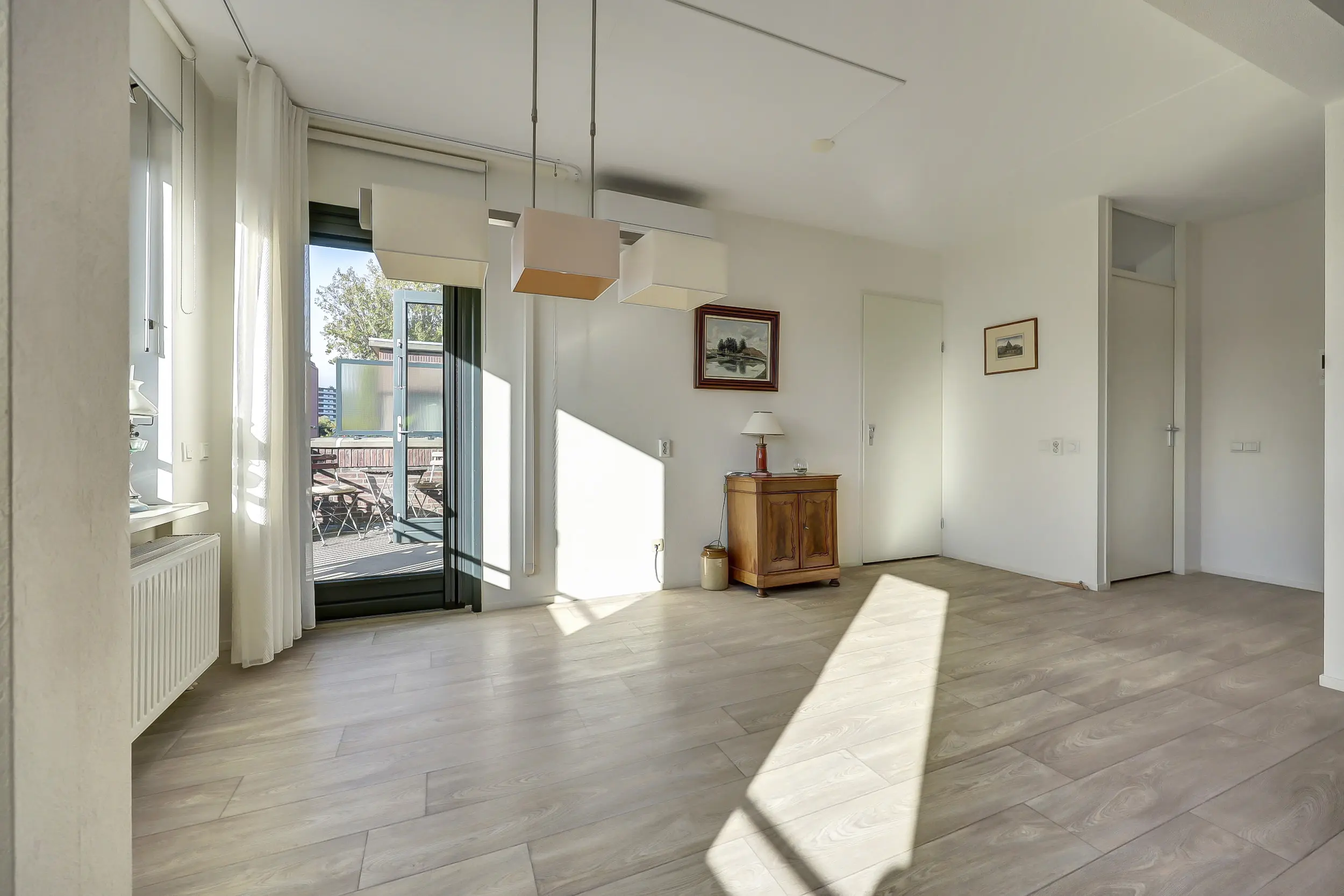 De woonkamer ligt aan de voorzijde van het gebouw en heeft dankzij de gunstige ligging en grote raampartijen veel natuurlijke lichtinval. Oorspronkelijk bestond deze ruimte uit twee kamers, waardoor het eenvoudig mogelijk is om weer een extra slaapkamer te realiseren. Vanuit de woonkamer is er toegang tot het zonnige balkon met vrij uitzicht. Tevens is de woonkamer voorzien van elektrisch bediende zonneschermen, wat zorgt voor extra comfort tijdens zonnige dagen.