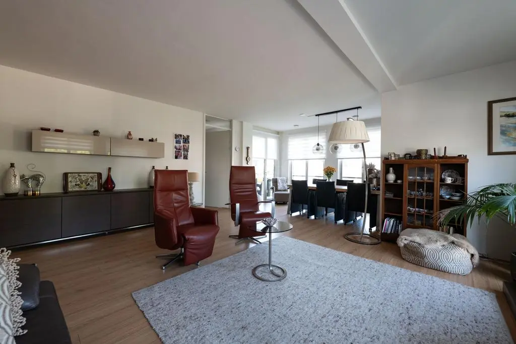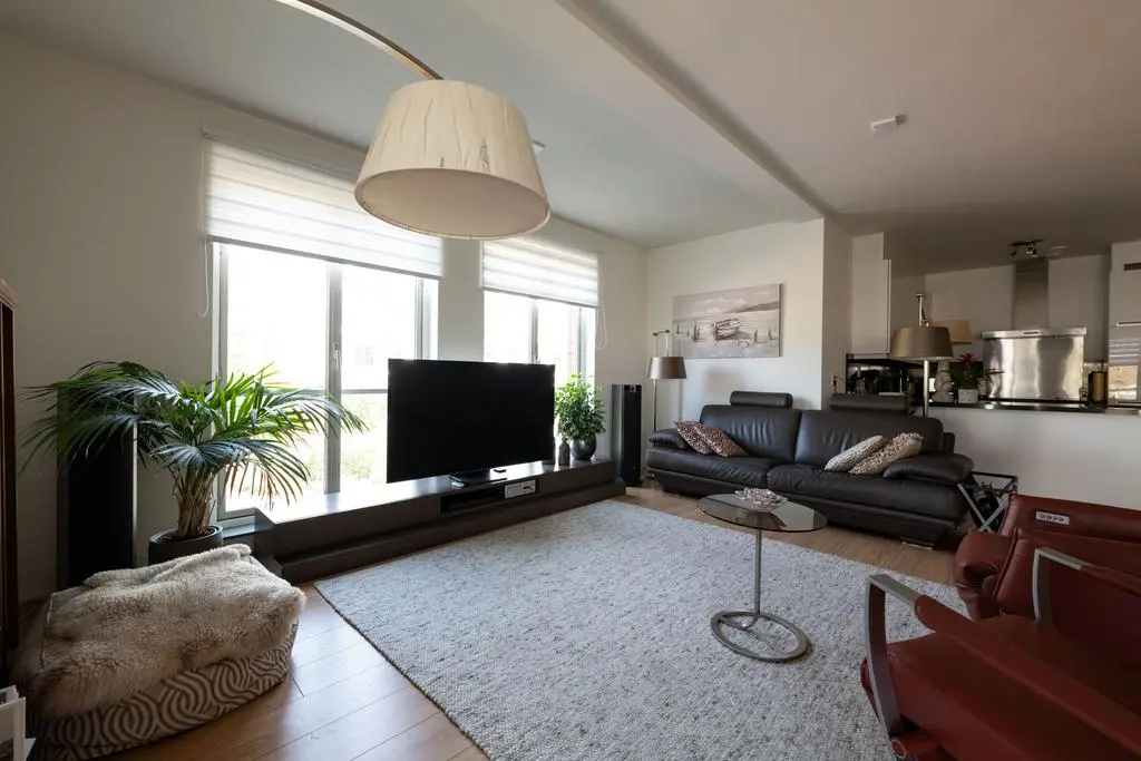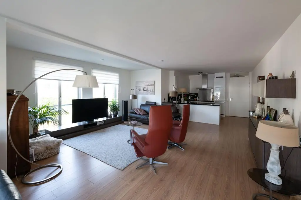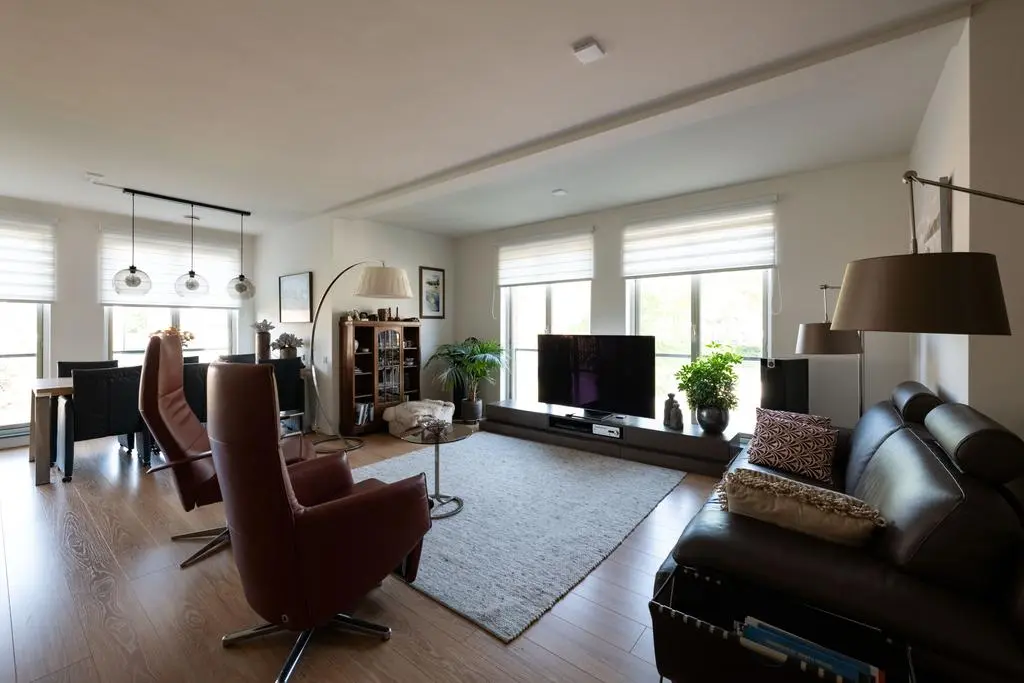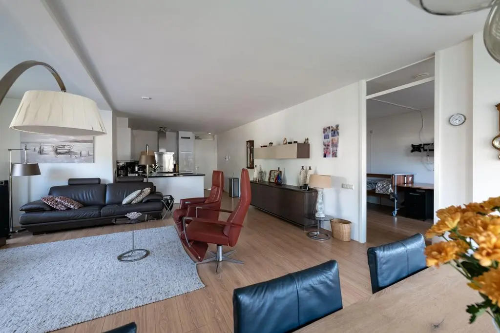 Lichte en sfeervolle woonkamer met rondom glaspartijen met toegang tot balkon en 2e slaapkamer.