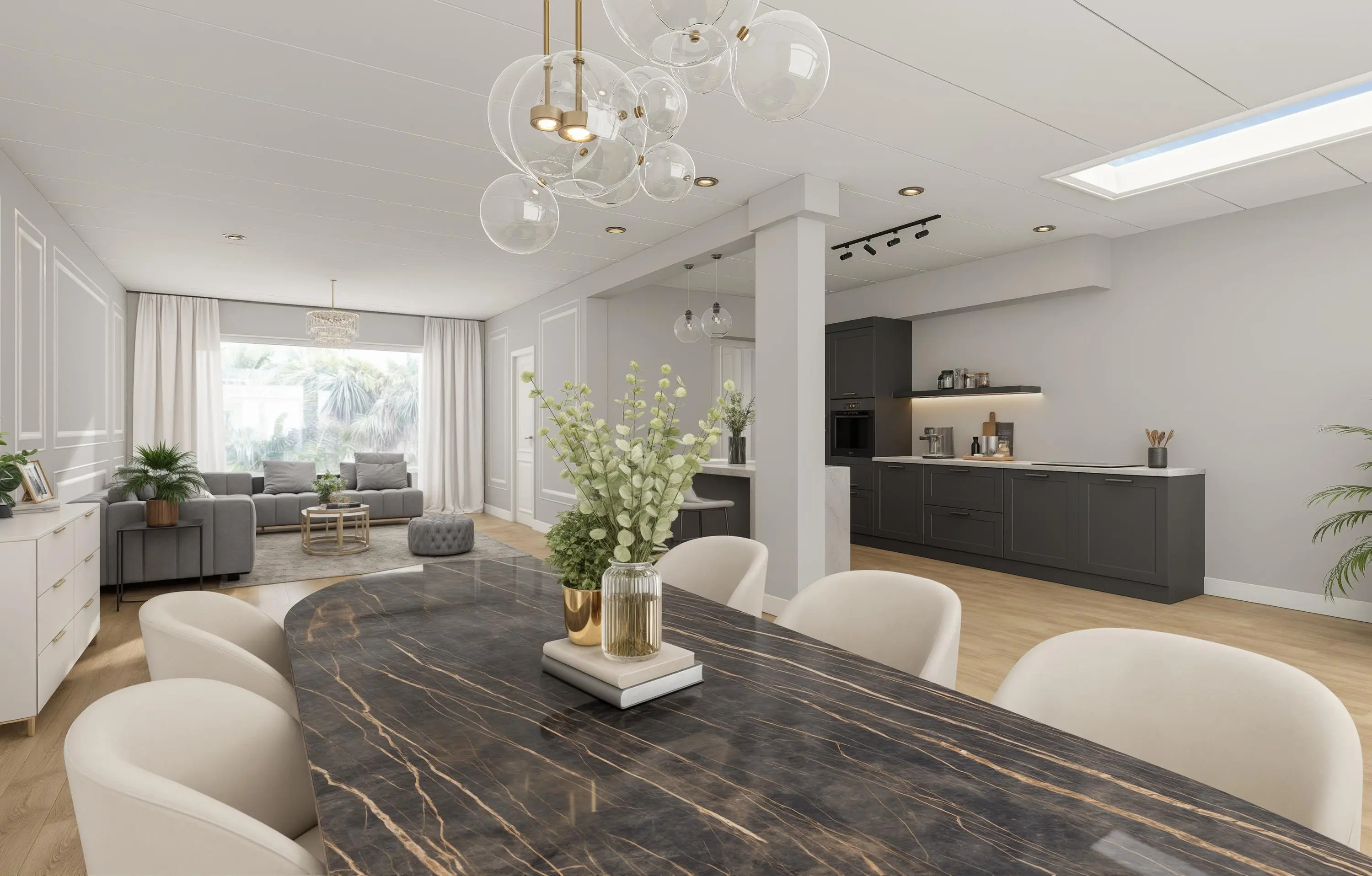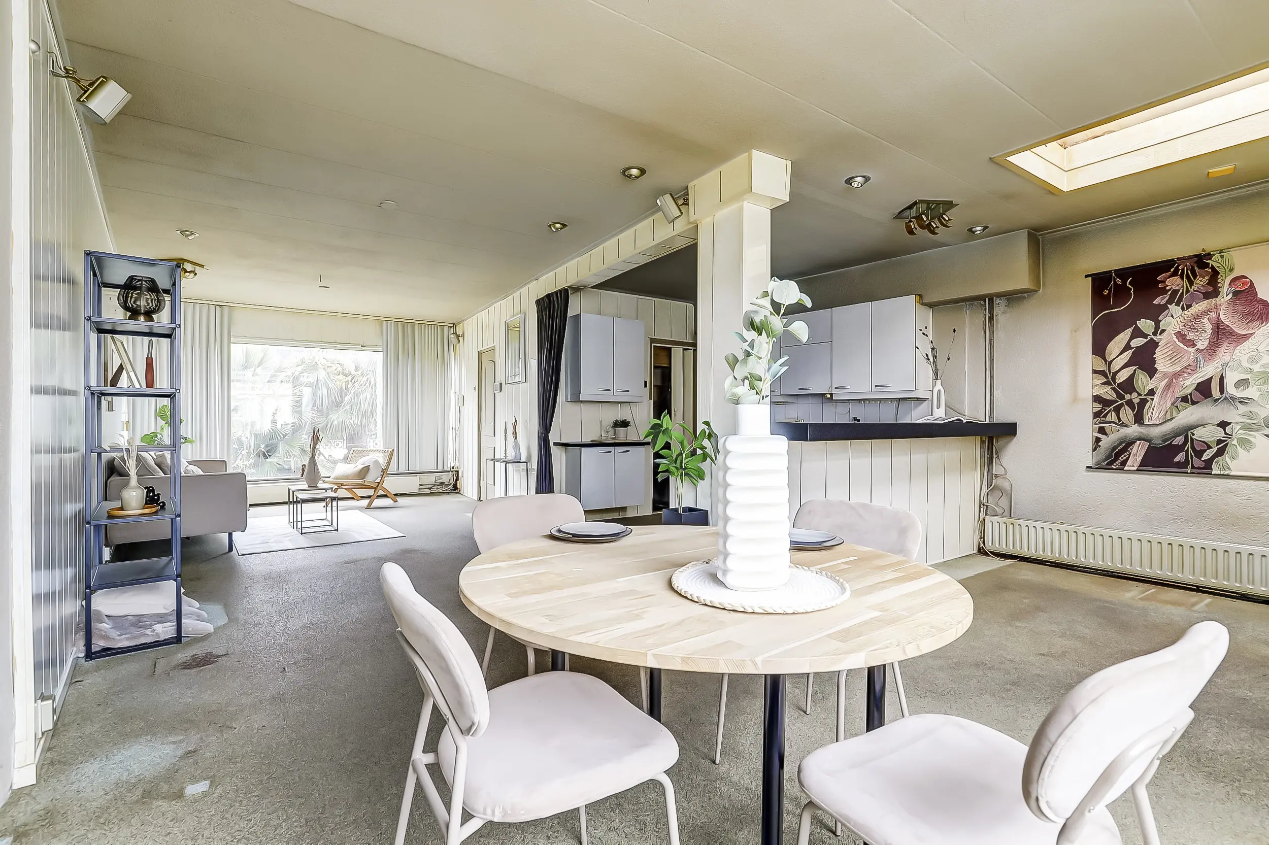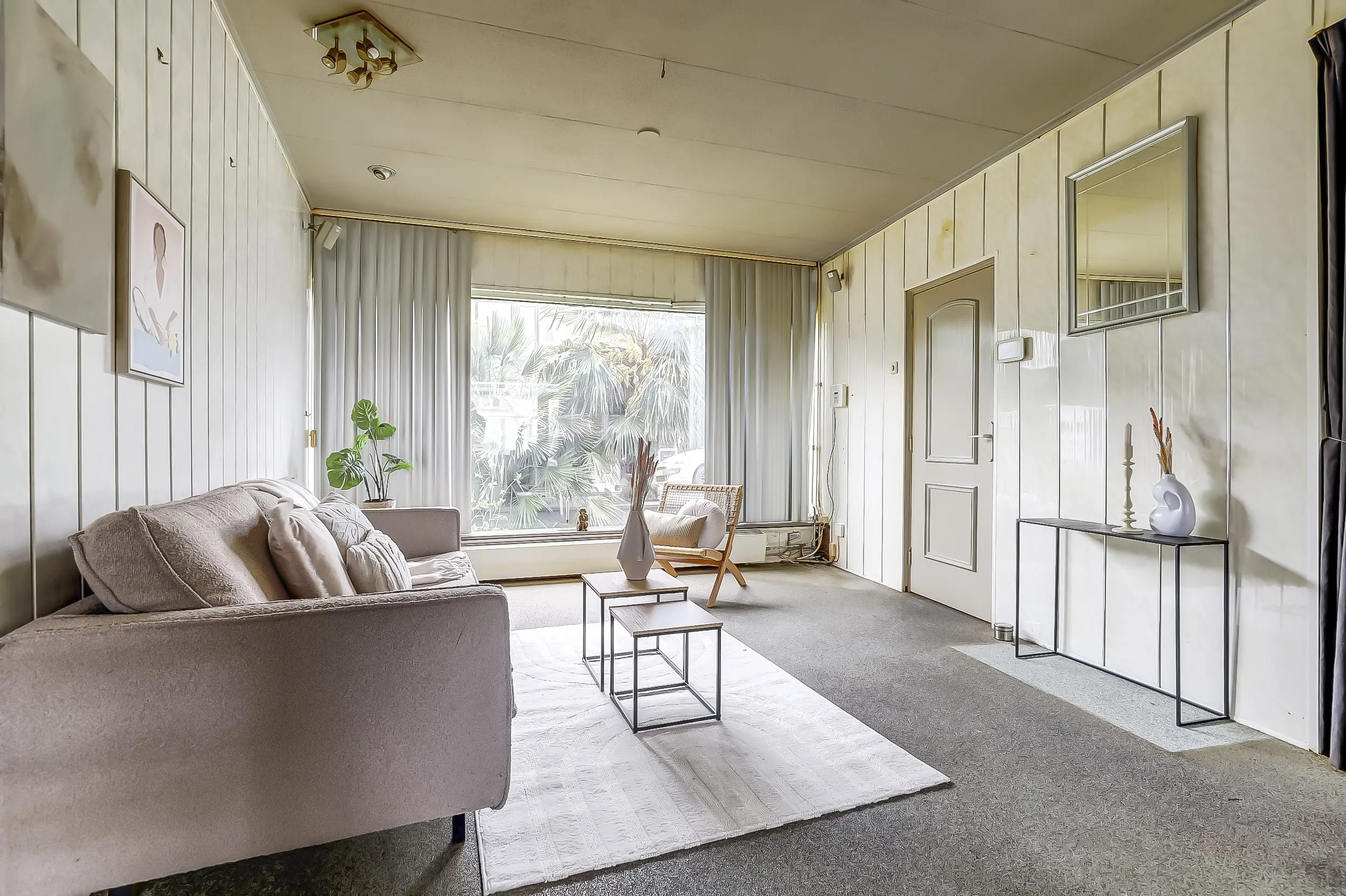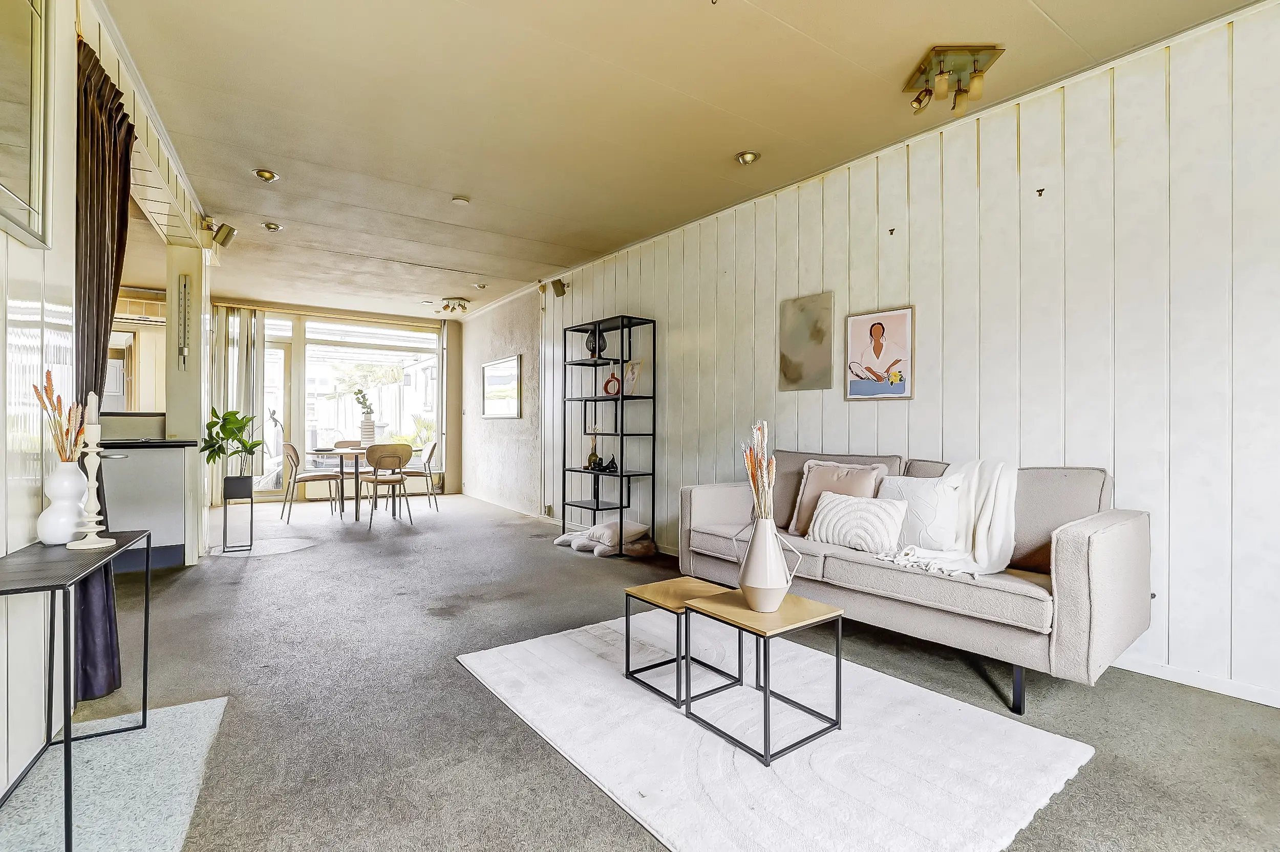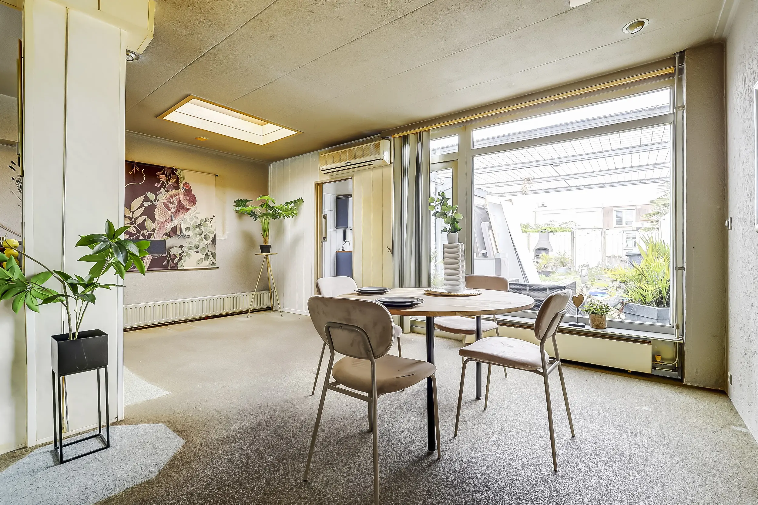 Lichte tuingerichte woonkamer met uitbouw.