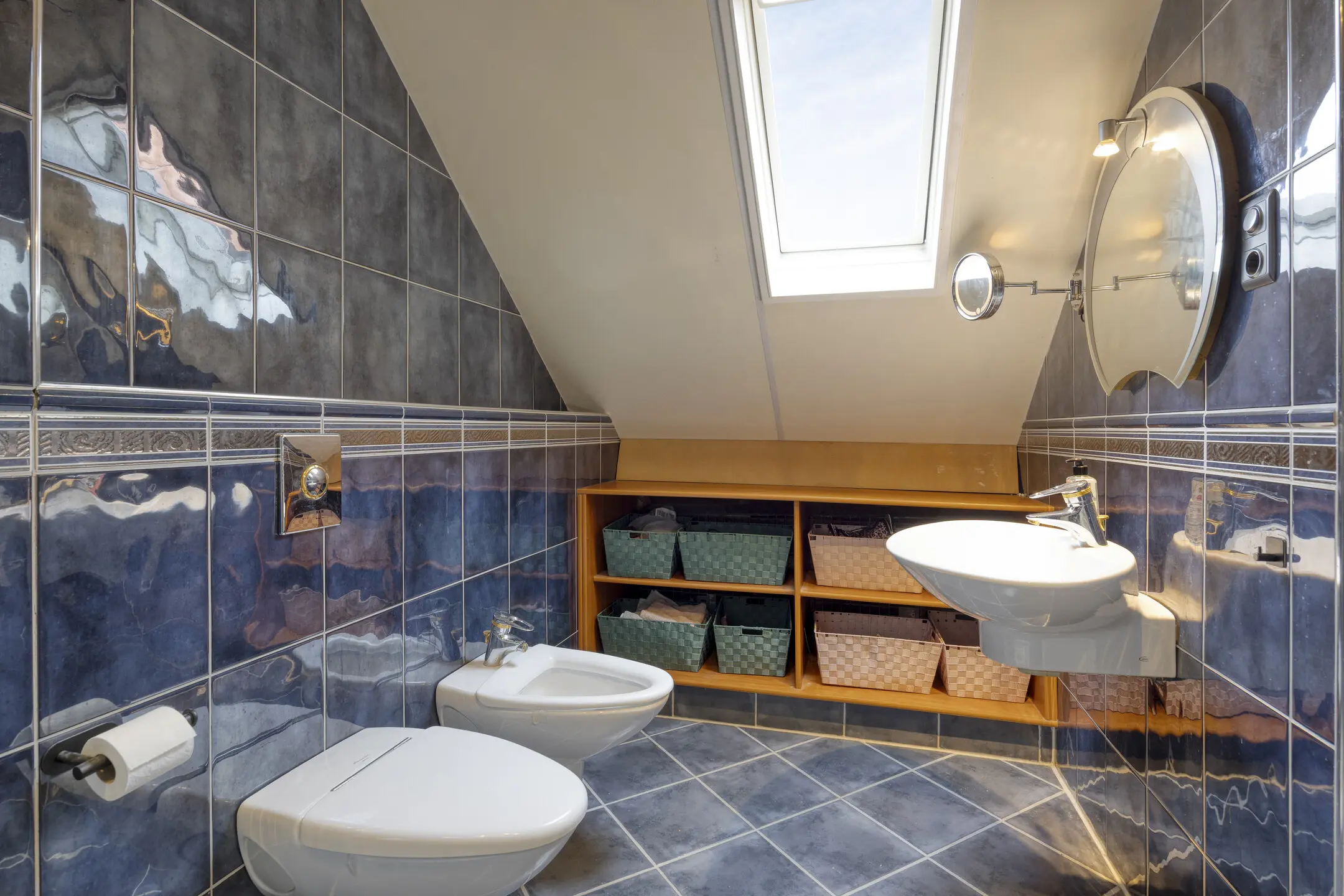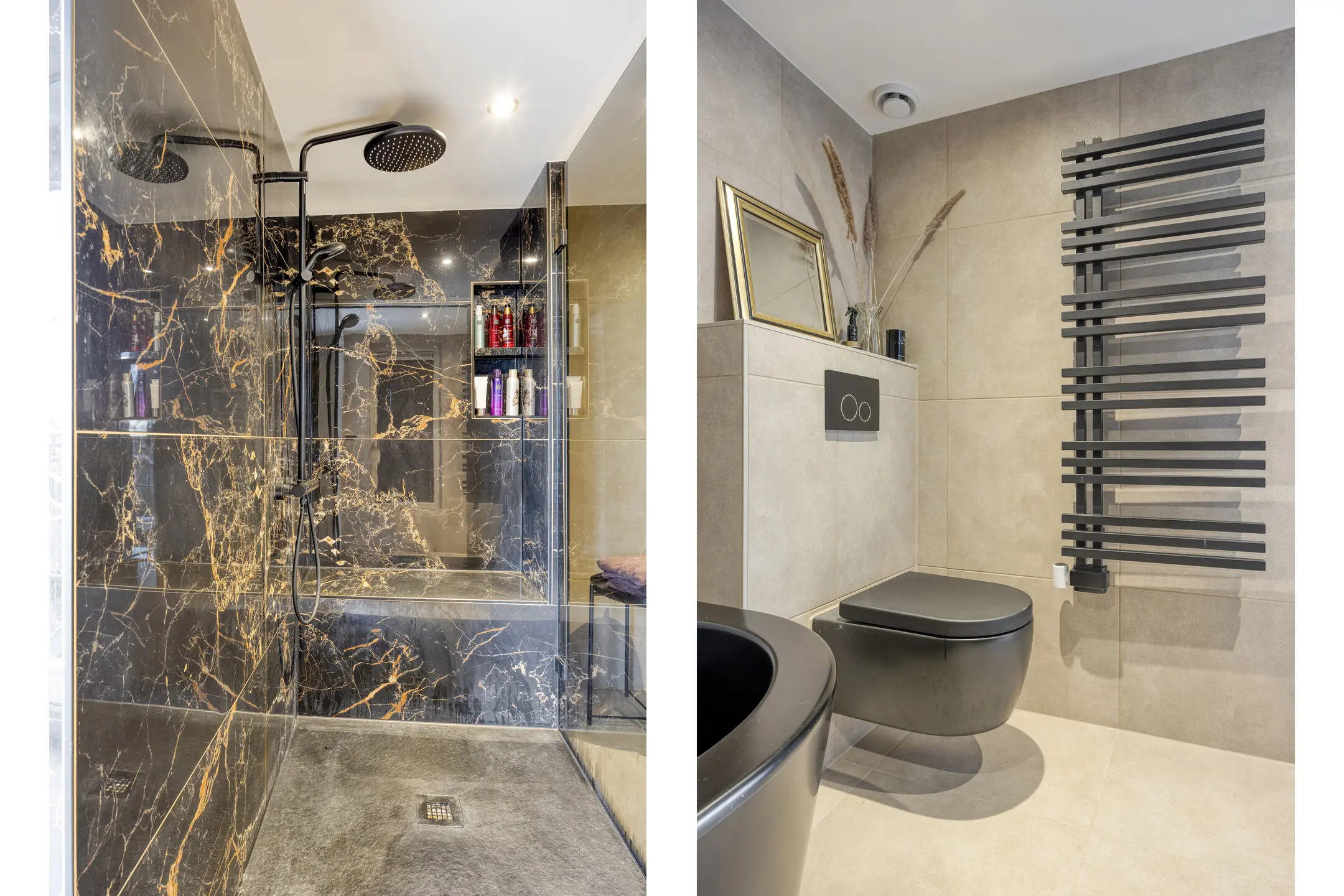 De tweede badkamer beschikt over een douchecabine, wastafel, wandcloset, radiator en bidet.