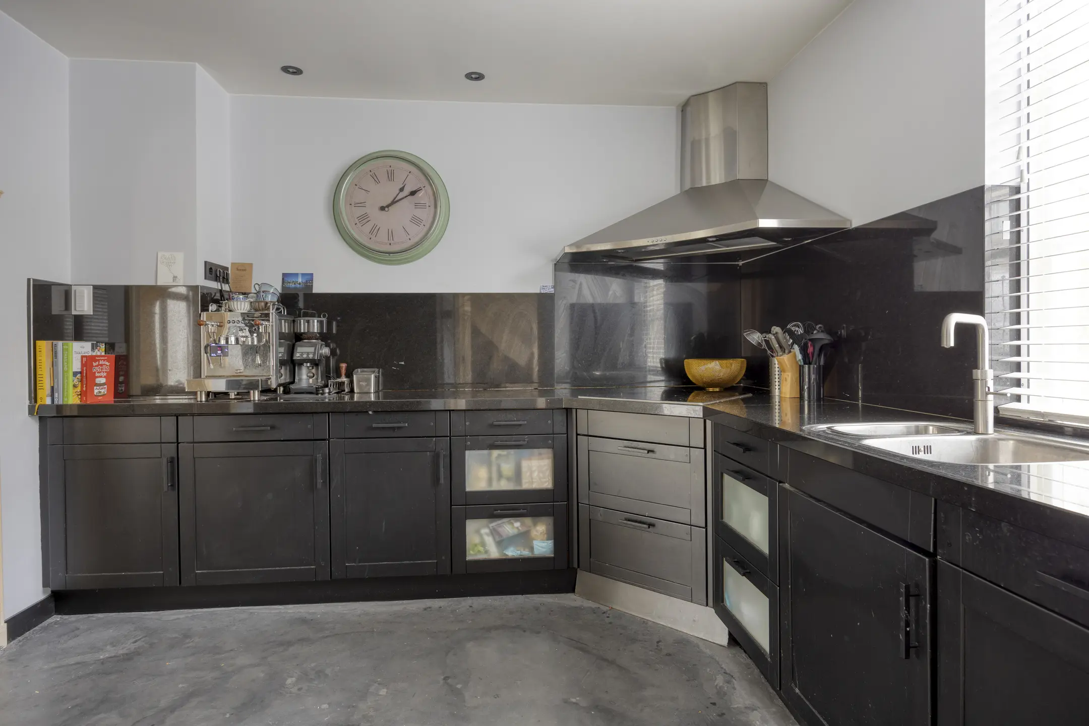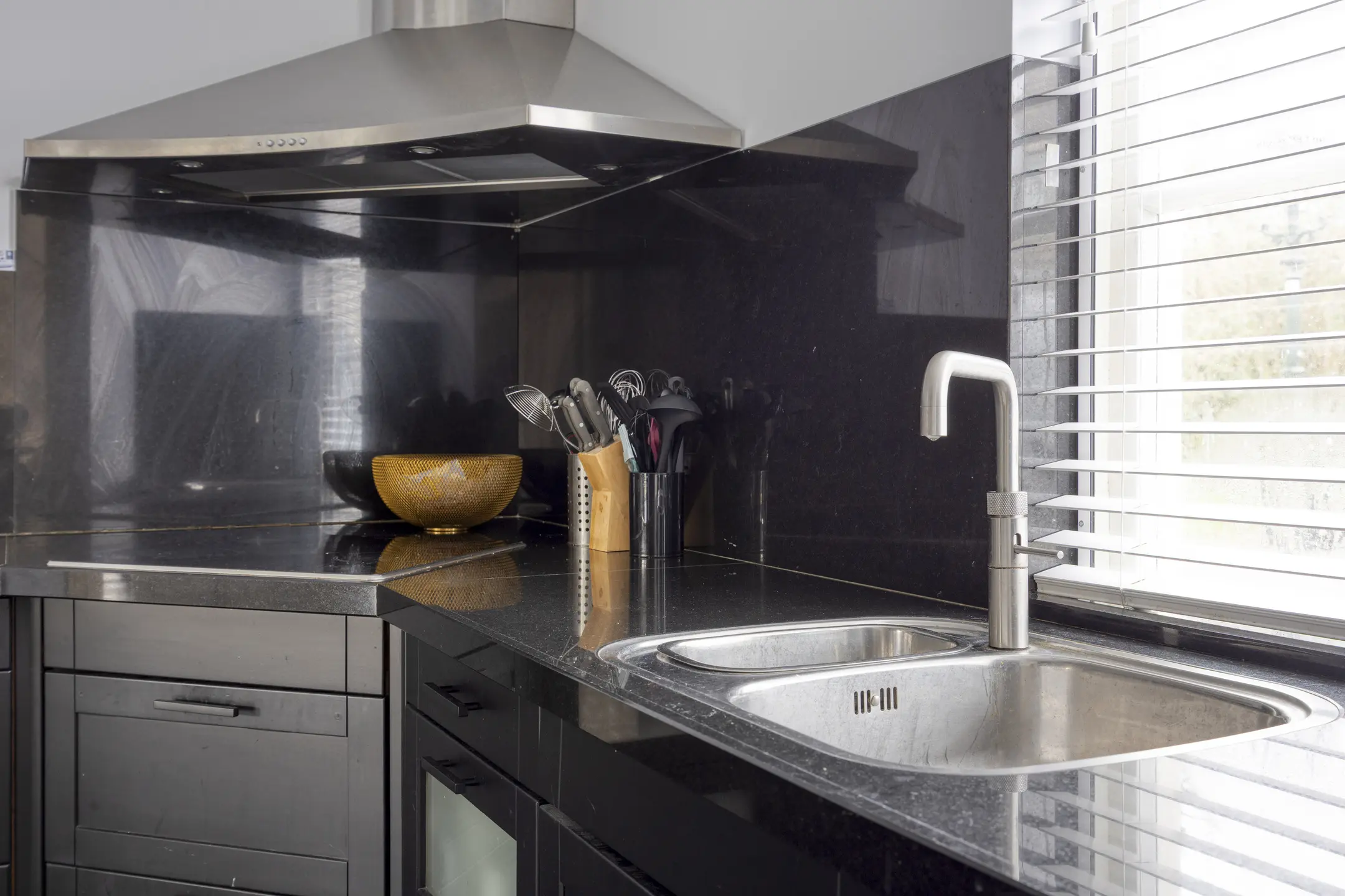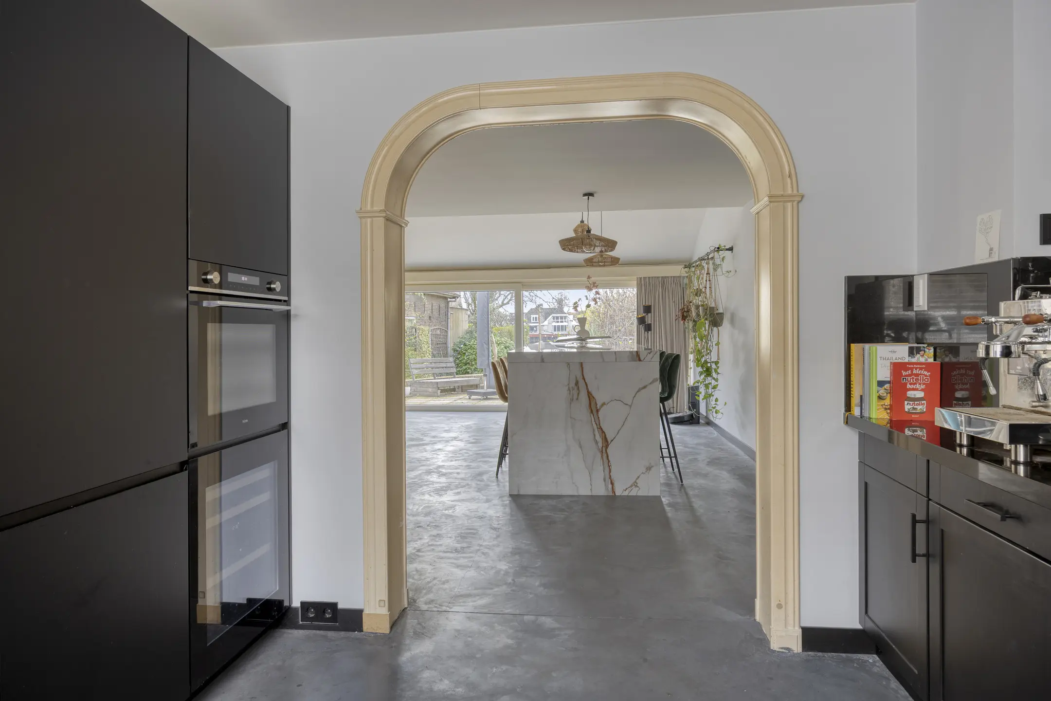 Aan de voorzijde van de woning bevindt zich de deels open keuken in L-opstelling, voorzien van diverse hoogwaardige inbouwapparatuur, waaronder een koel-/vriescombinatie, combi oven/magnetron, wijnklimaatkast, vaatwasser, Quooker en inductiekookplaat met afzuigkap.