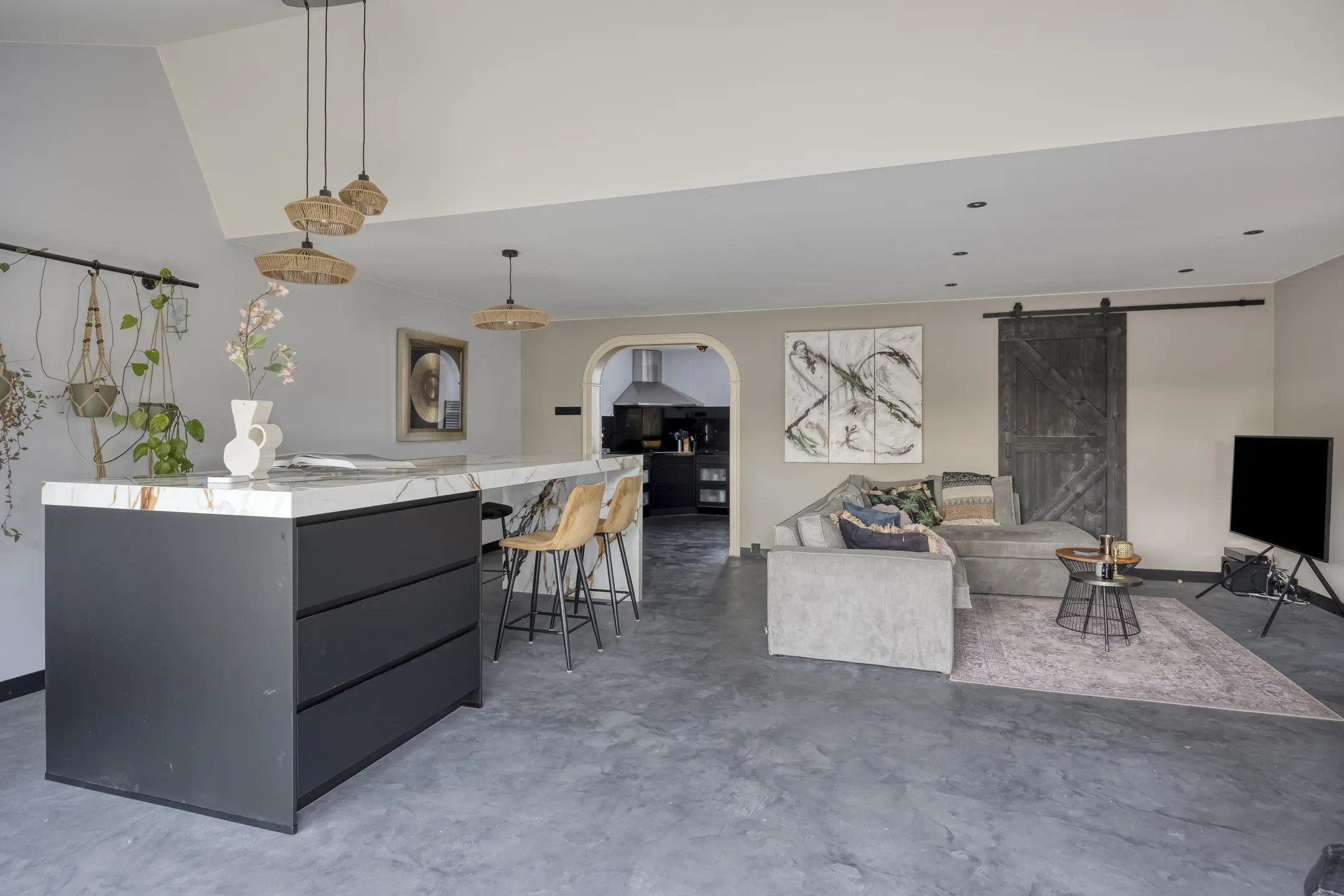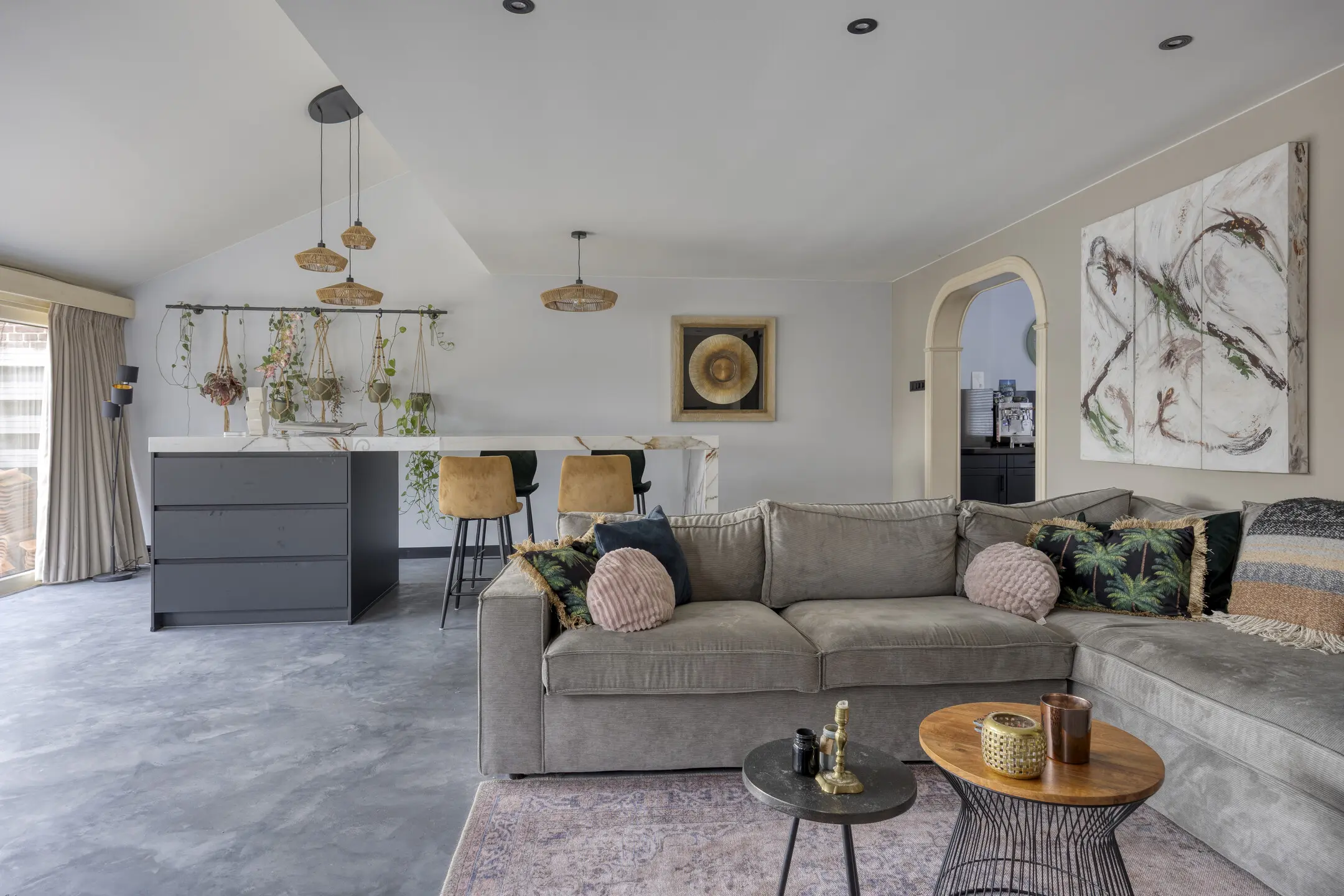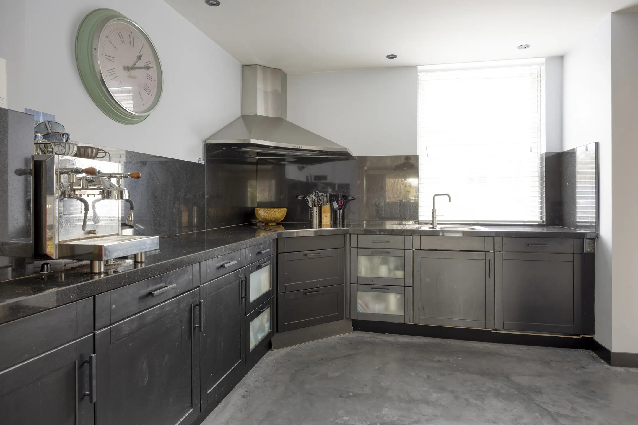 Aan de voorzijde van de woning bevindt zich de deels open keuken in L-opstelling, voorzien van diverse hoogwaardige inbouwapparatuur, waaronder een koel-/vriescombinatie, combi oven/magnetron, wijnklimaatkast, vaatwasser, Quooker en inductiekookplaat met afzuigkap.