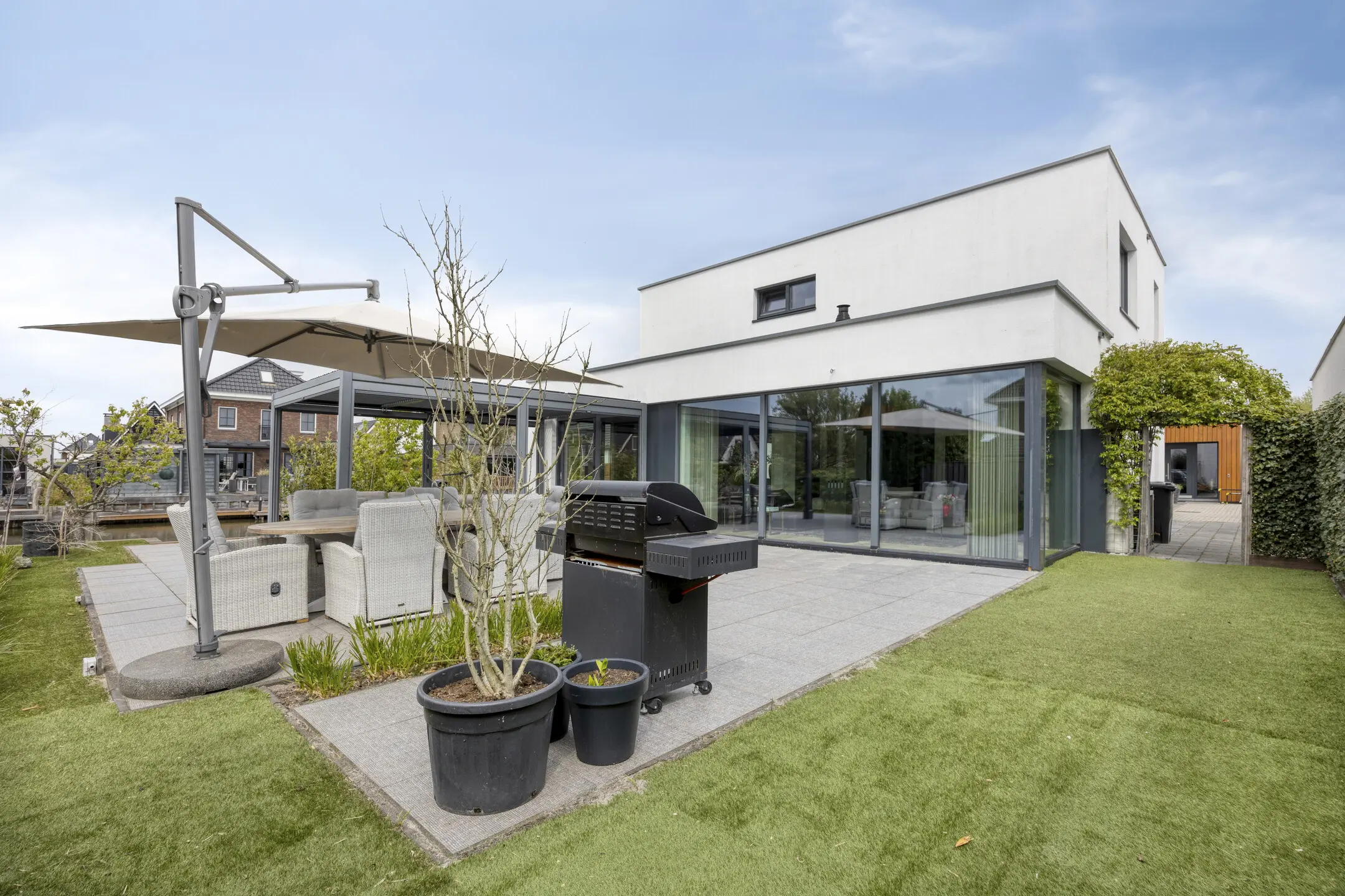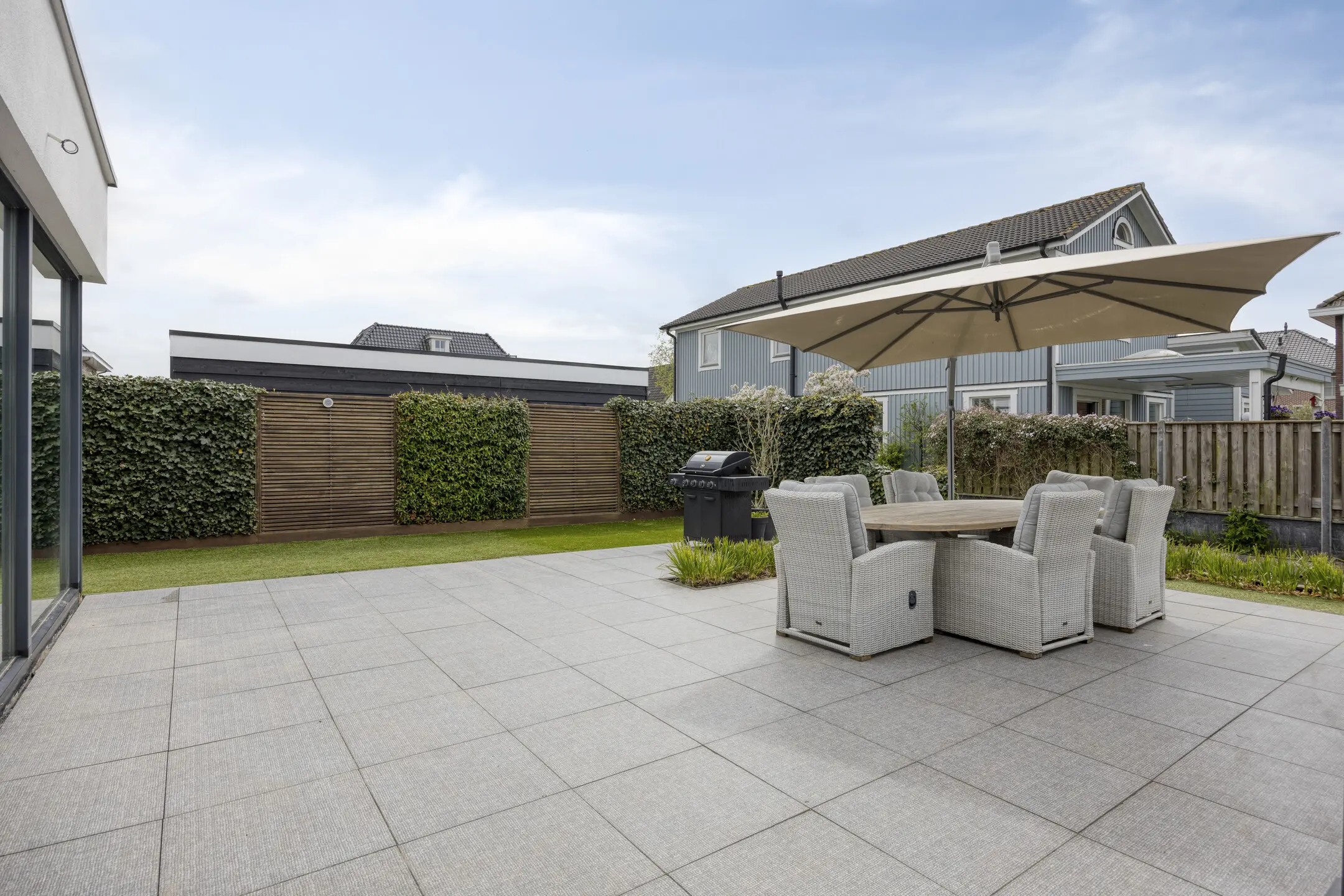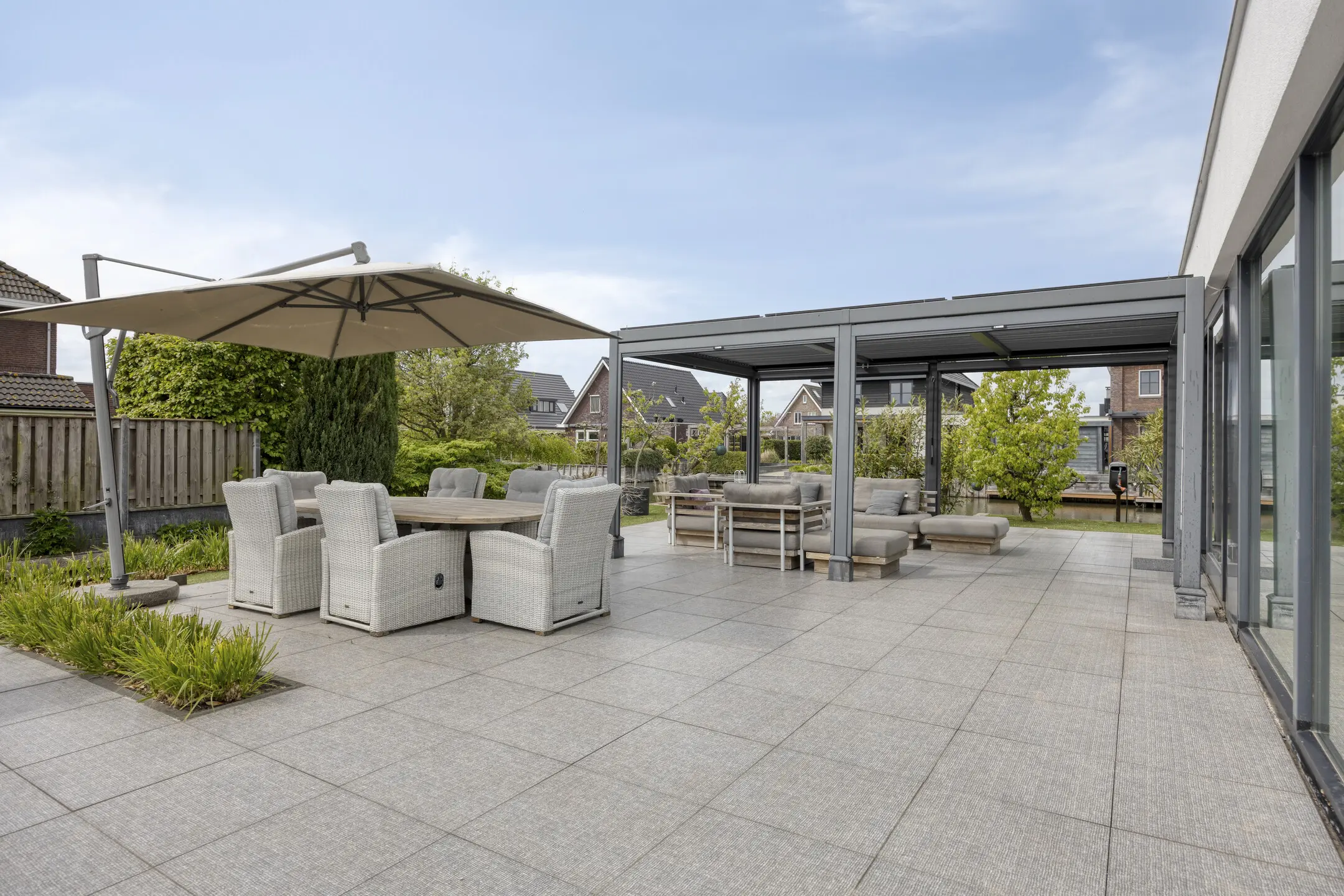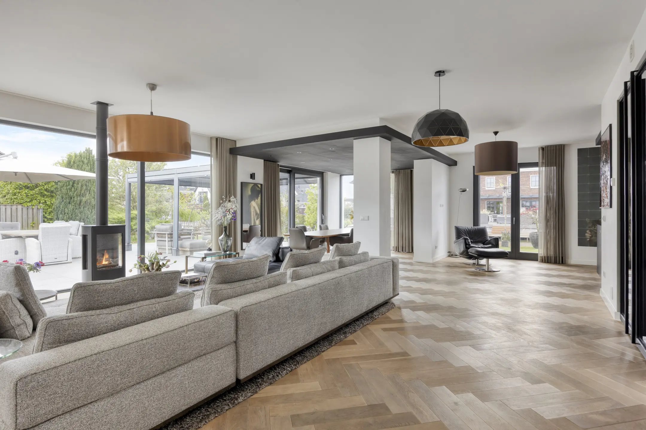 Op de begane grond treft u een zeer ruime woonkamer met een aparte tv-kamer. De open keuken, met een groot kookeiland voorzien van inbouwapparatuur, waaronder een Bora inductiekookplaat, vaatwasser, wijnkoelkast, twee koelkasten en een vriezer, is een absolute blikvanger en een heerlijke plek om te koken en contact te houden met de overige gezinsleden in de living. Op de begane grond bevindt zich ook een grote slaapkamer met openslaande deuren naar de vlonder.