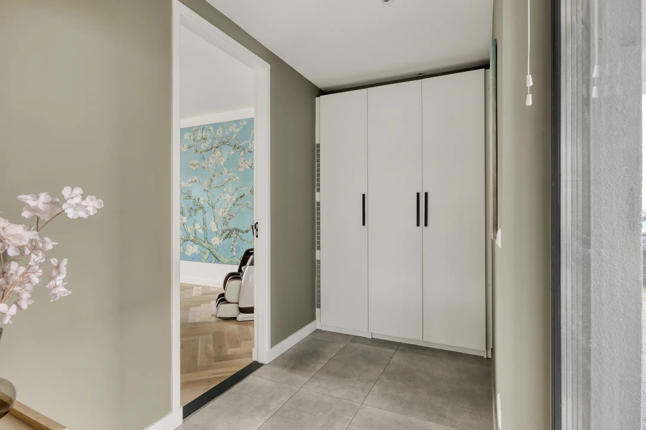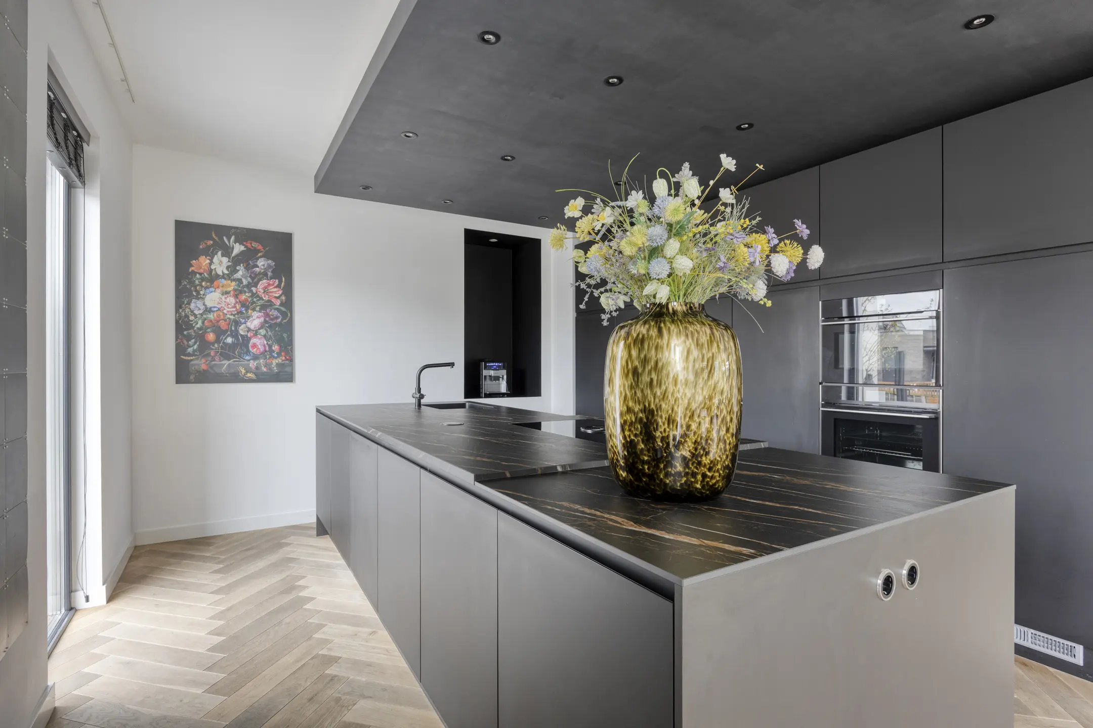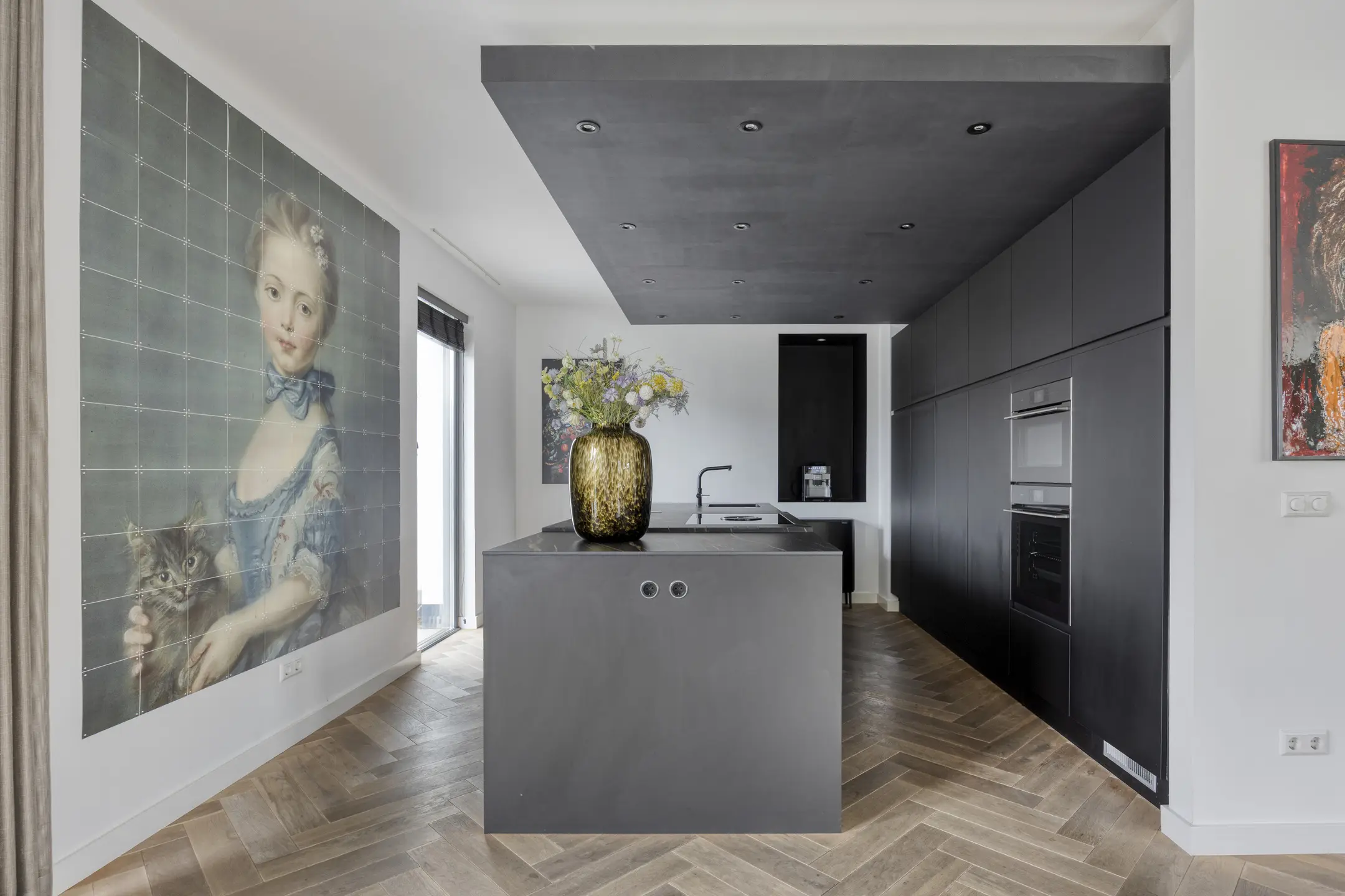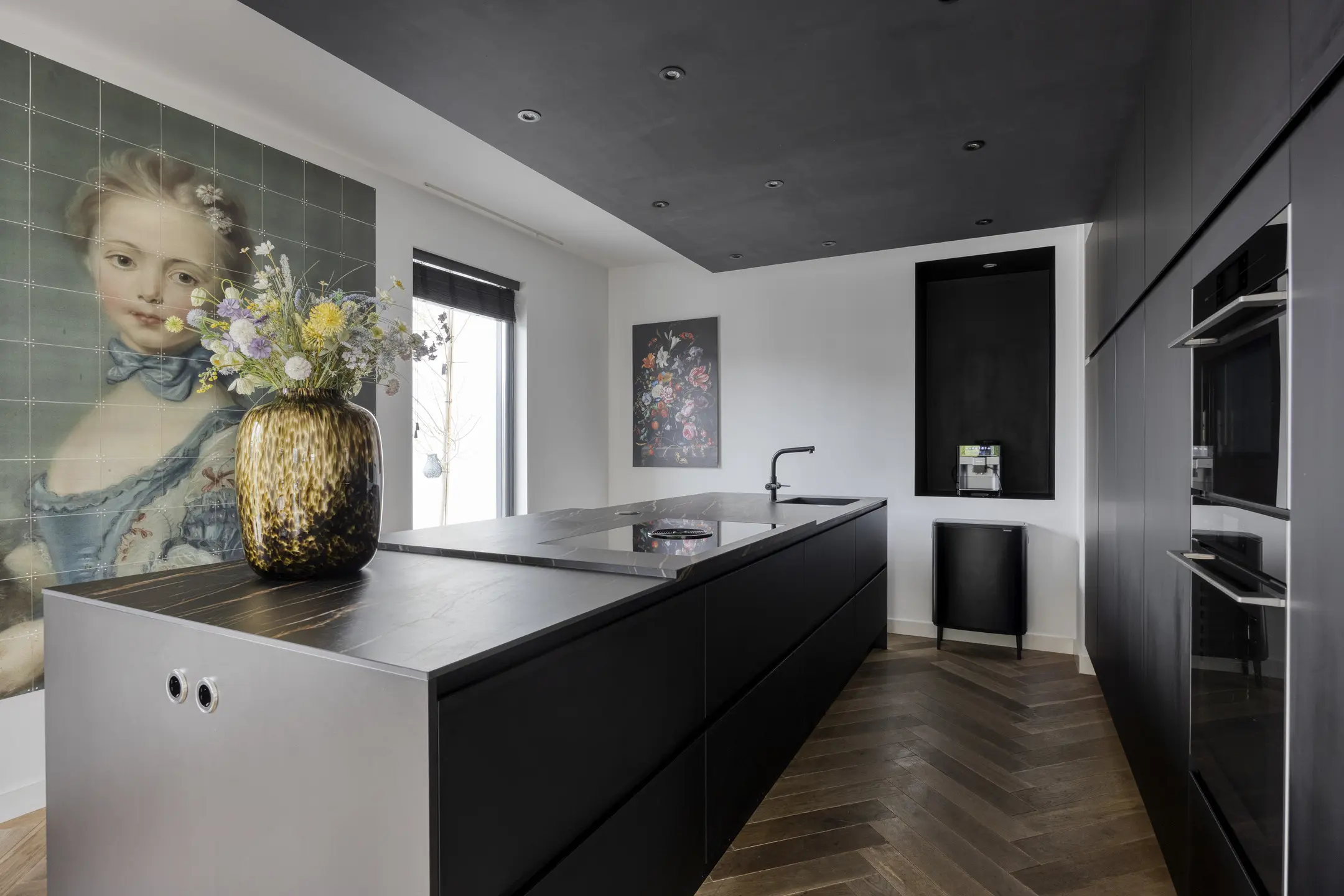 Op de begane grond treft u een zeer ruime woonkamer met een aparte tv-kamer. De open keuken, met een groot kookeiland voorzien van inbouwapparatuur, waaronder een Bora inductiekookplaat, vaatwasser, wijnkoelkast, twee koelkasten en een vriezer, is een absolute blikvanger en een heerlijke plek om te koken en contact te houden met de overige gezinsleden in de living. Op de begane grond bevindt zich ook een grote slaapkamer met openslaande deuren naar de vlonder.