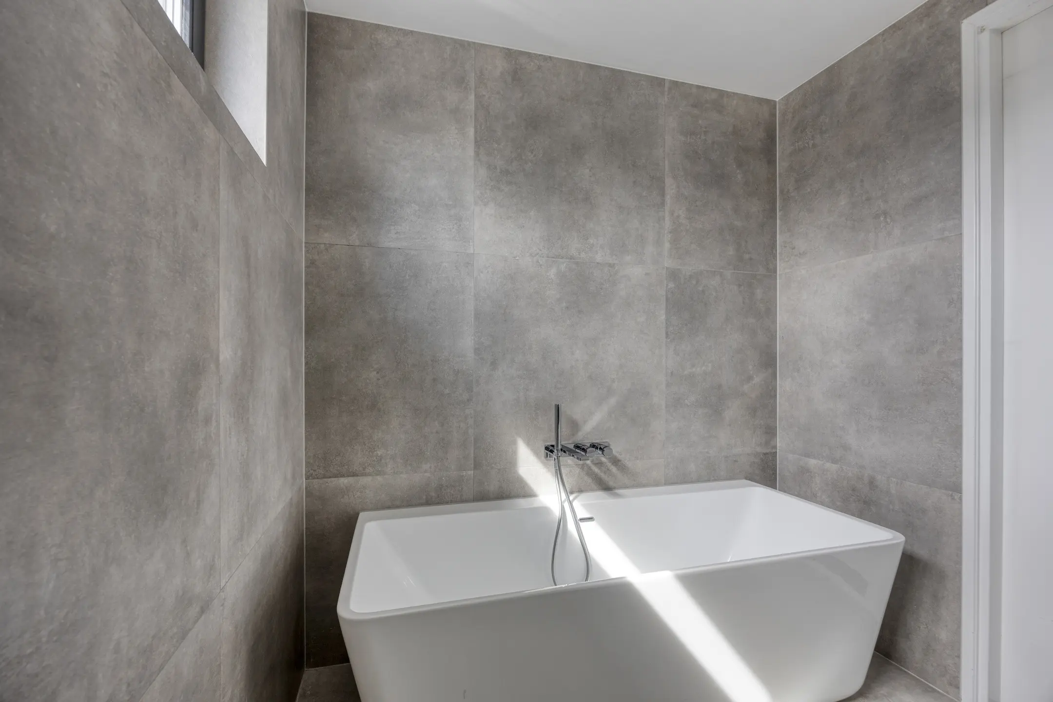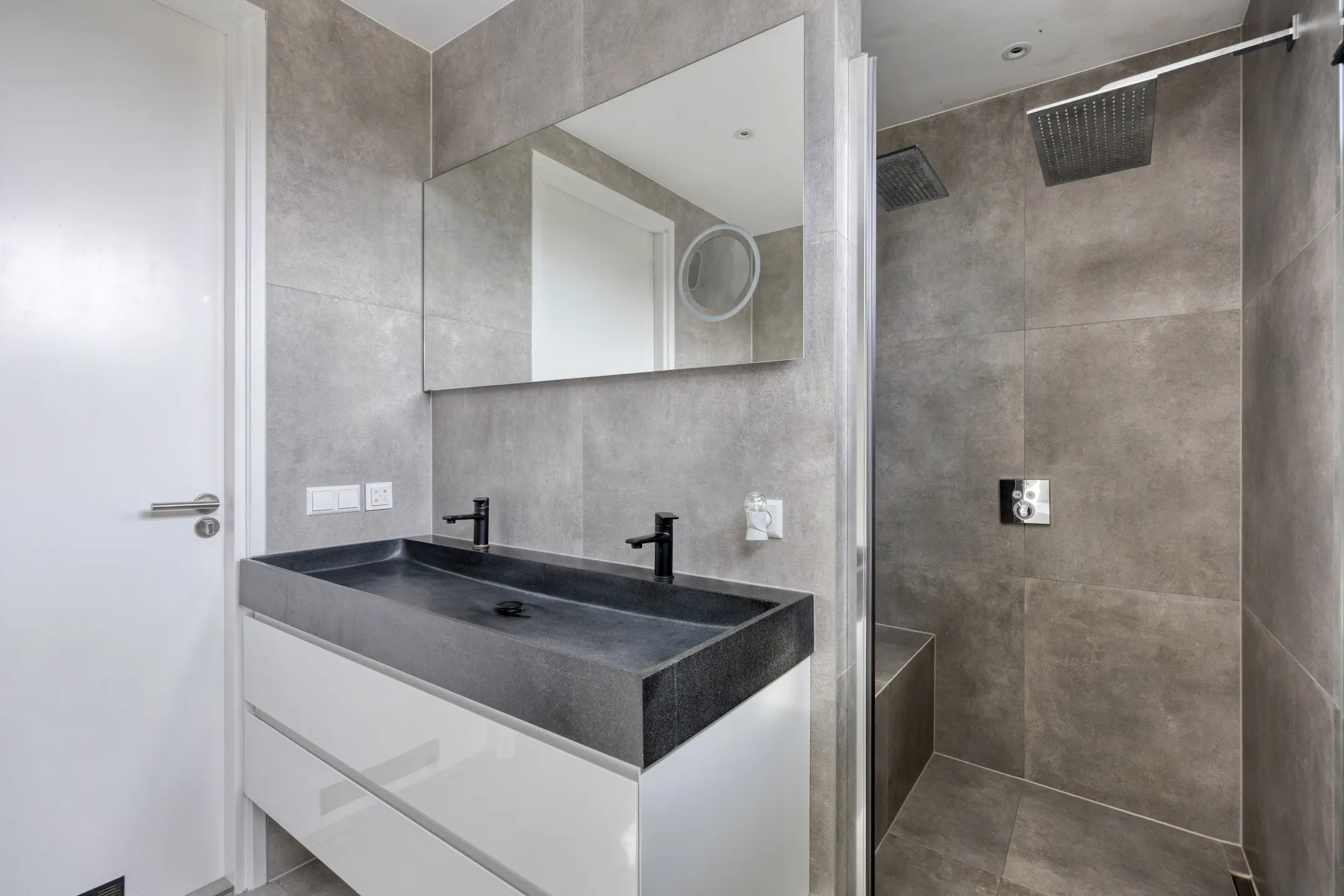 De bovenverdieping biedt de luxe van 4 extra slaapkamers en een grote badkamer, uitgerust met een ligbad, dubbele wastafel en inloopdouche met zitje.