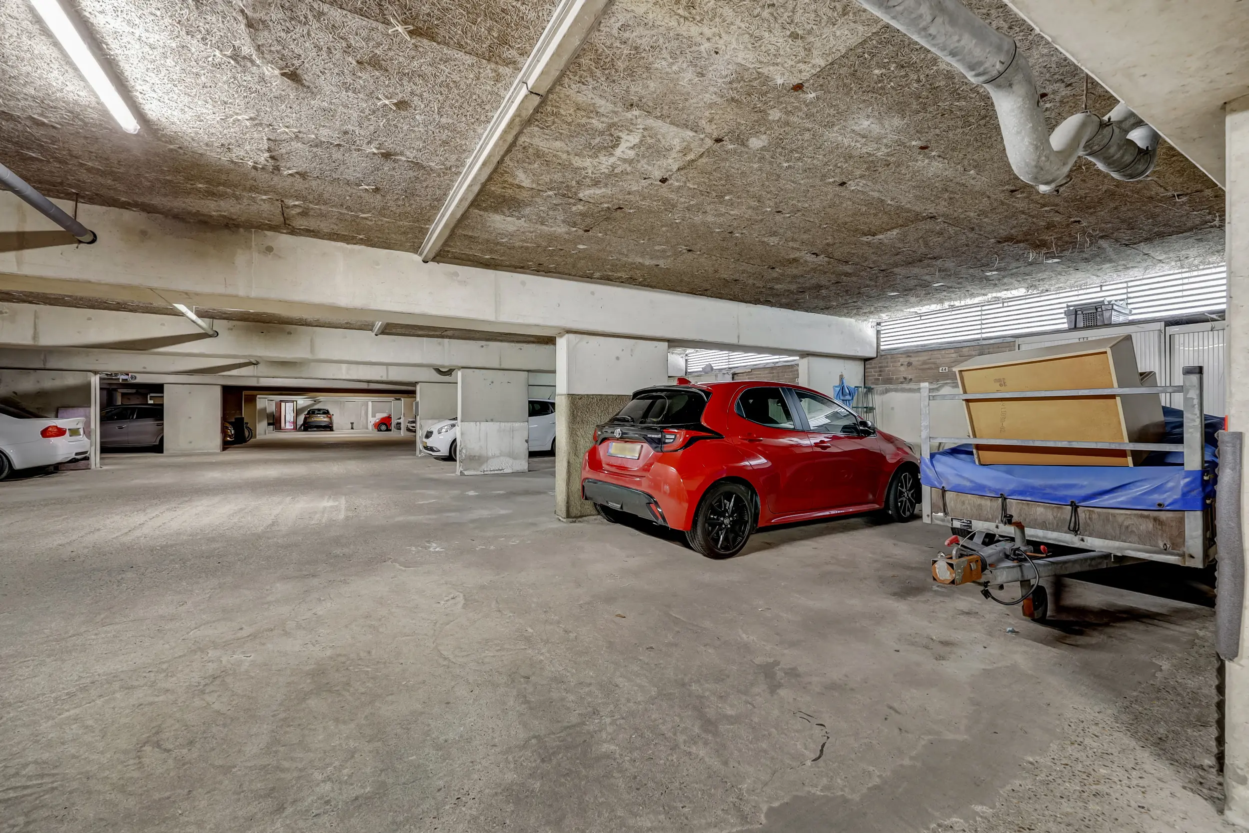 Bij het appartement hoort een eigen parkeerplek in de parkeerkelder onderin het gebouw. Zo staat de auto veilig en kun je inpandig naar de centrale ruimte bij de lift en het trappenhuis.