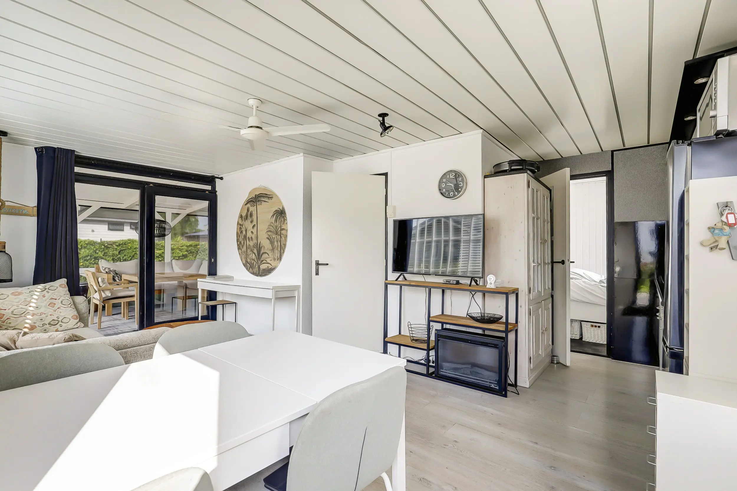 Lichte woonkamer met een eet- en zithoek. Een open keuken met 4-pits gasfornuis, koelkast, vriezer, magnetron en oven. Tussenhal met twee slaapkamers met vaste bedden en badkamer.