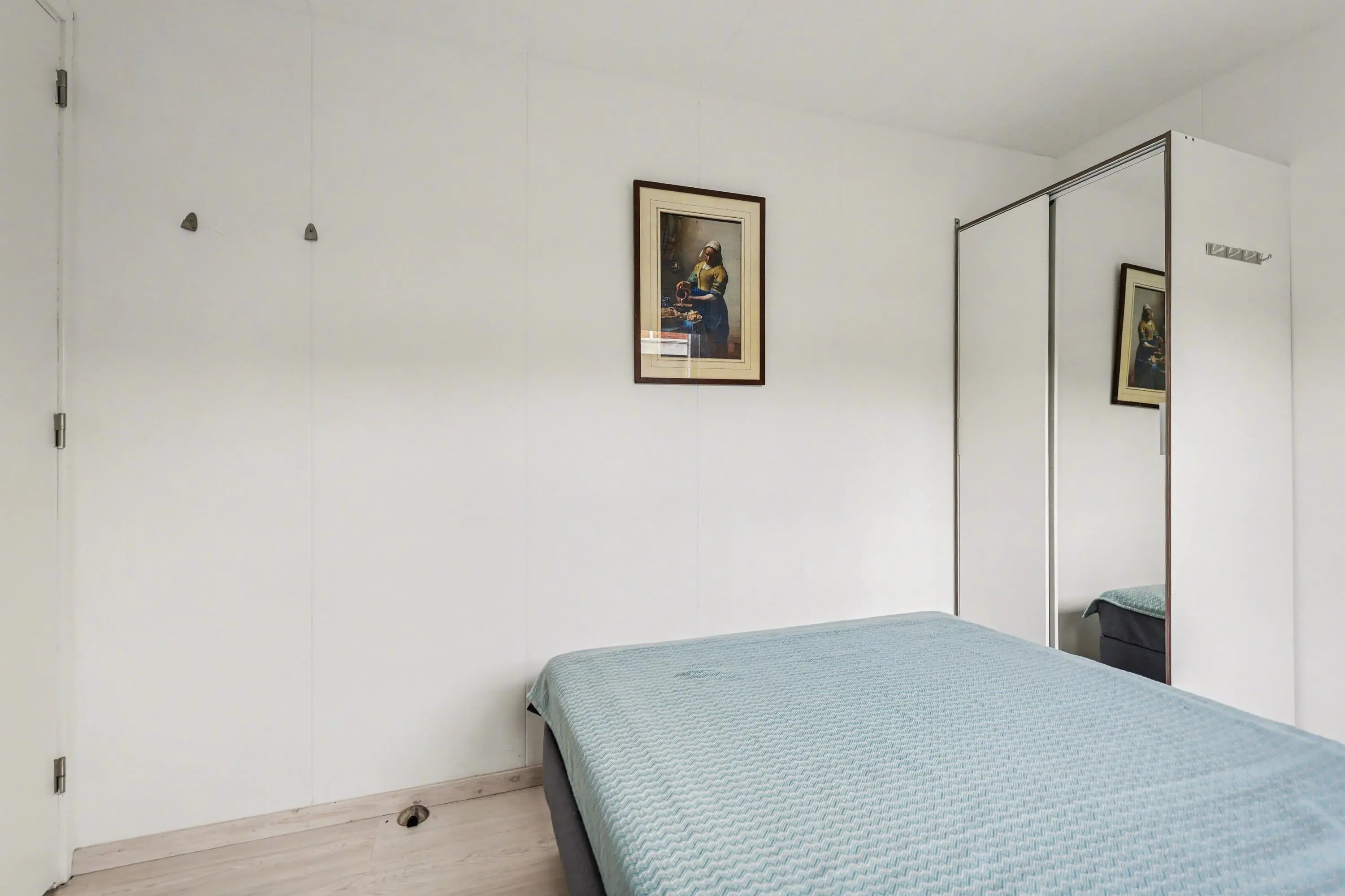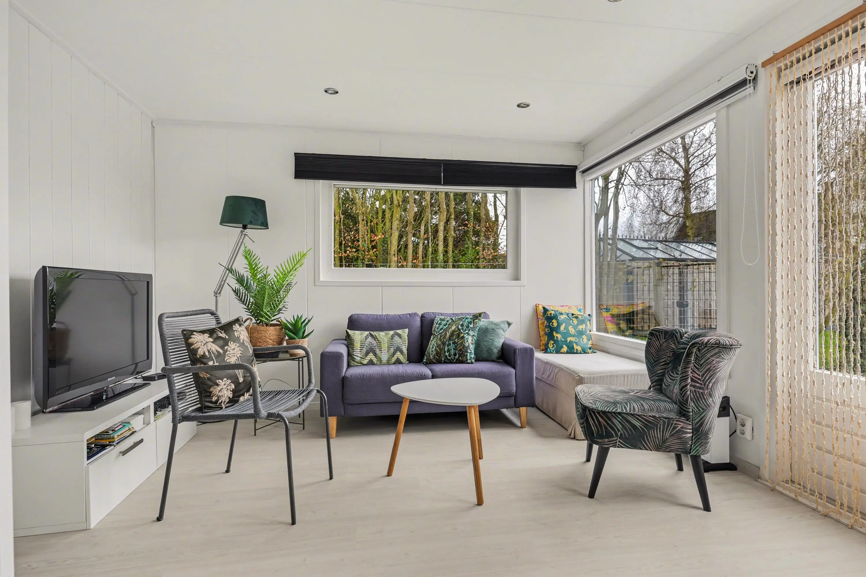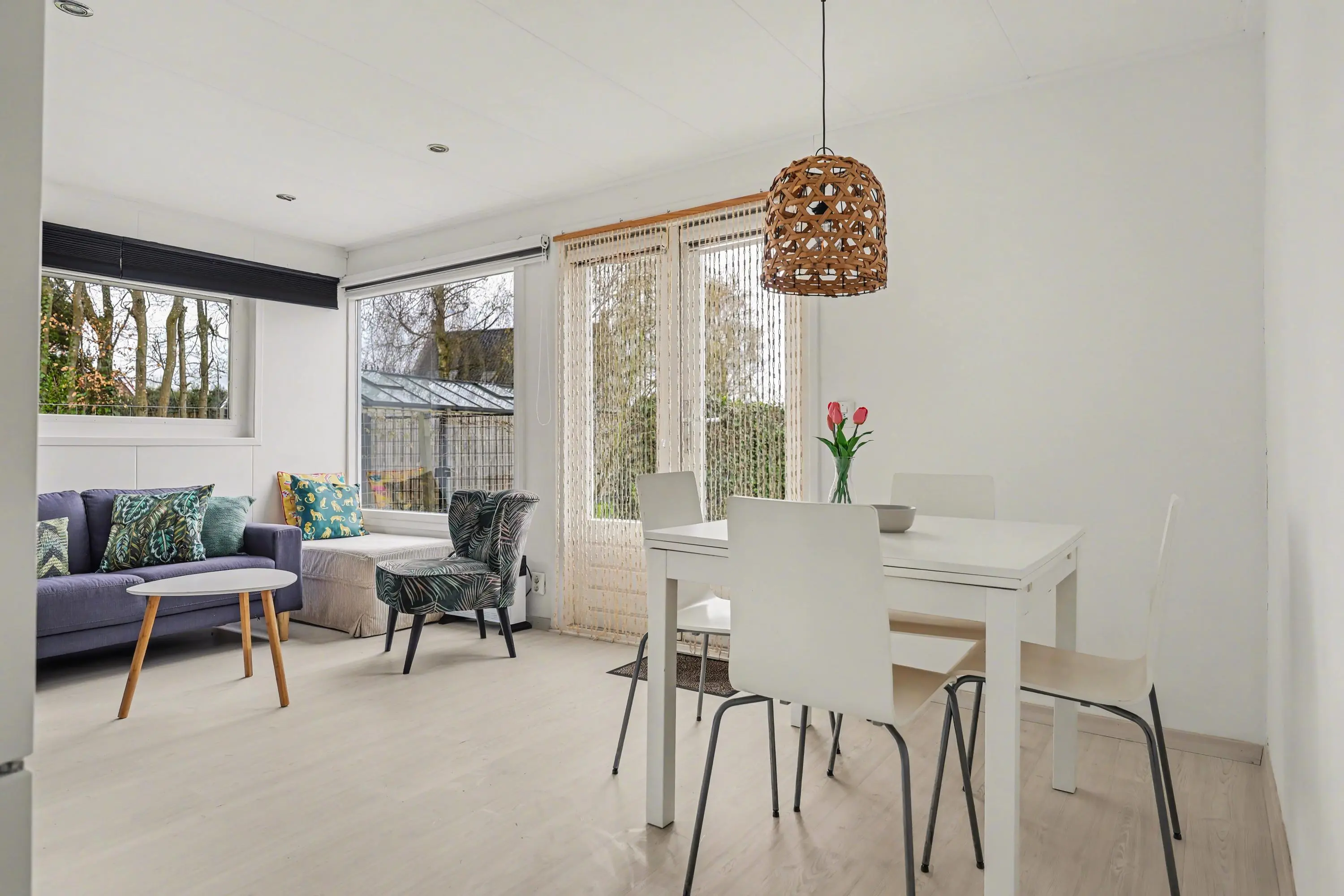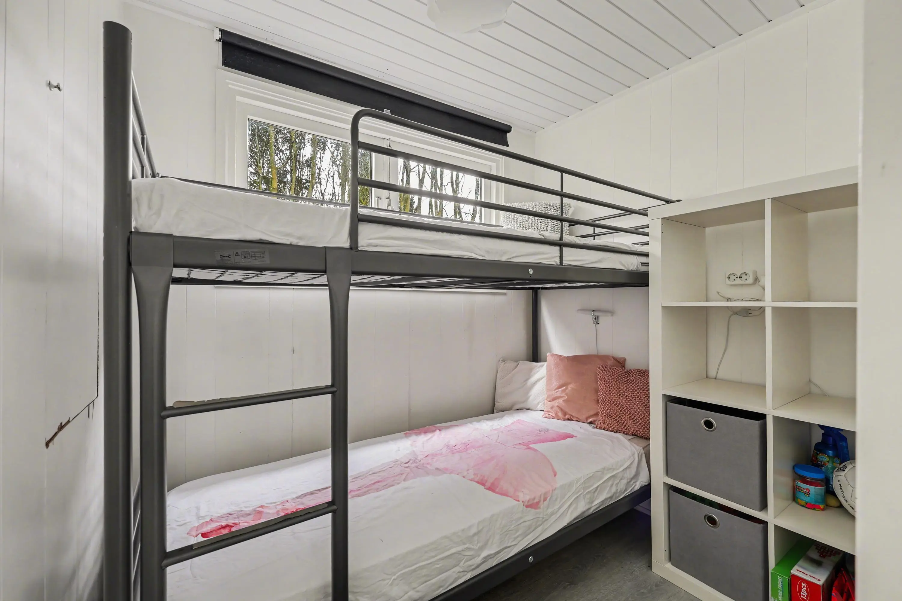 De dubbele tuindeuren geven je toegang tot de woonkamer van de woning. Door de verschillende ramen en de frisse inrichting maakt dit een fijne lichte ruimte. De open keuken in een hoekopstelling van 2019 is voorzien van (inbouw-) apparatuur zoals de inductiekookplaat, oven, afzuigkap, koelkast en vriezer. De woning heeft drie slaapkamers. Twee daarvan zijn ingericht met een 2-persoonsbed en kasten. De derde slaapkamer heeft een stapelbed en een kast.