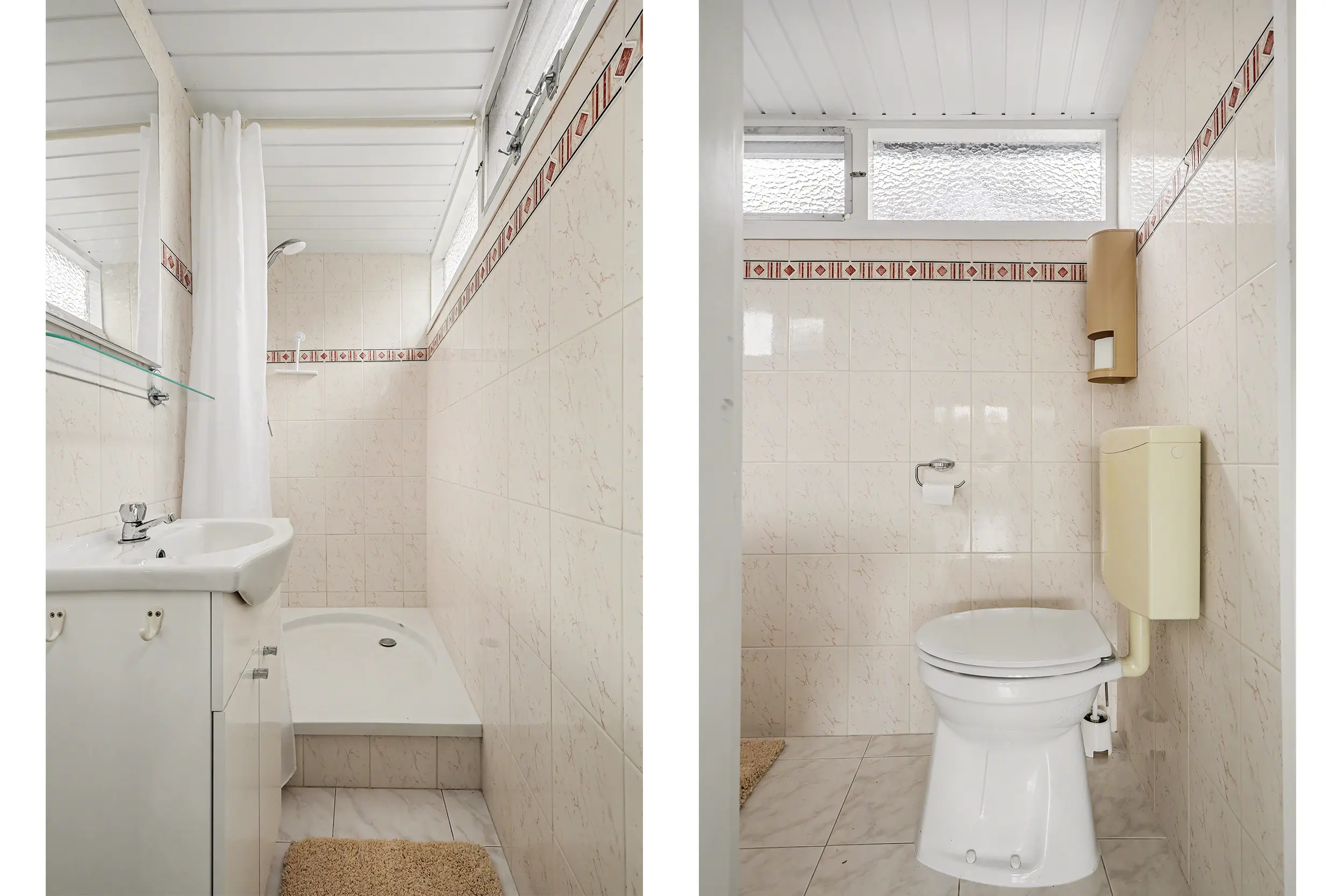 Grenzend aan de woonkamer is een geheel betegelde badkamer met douche, toilet en wastafelmeubel.