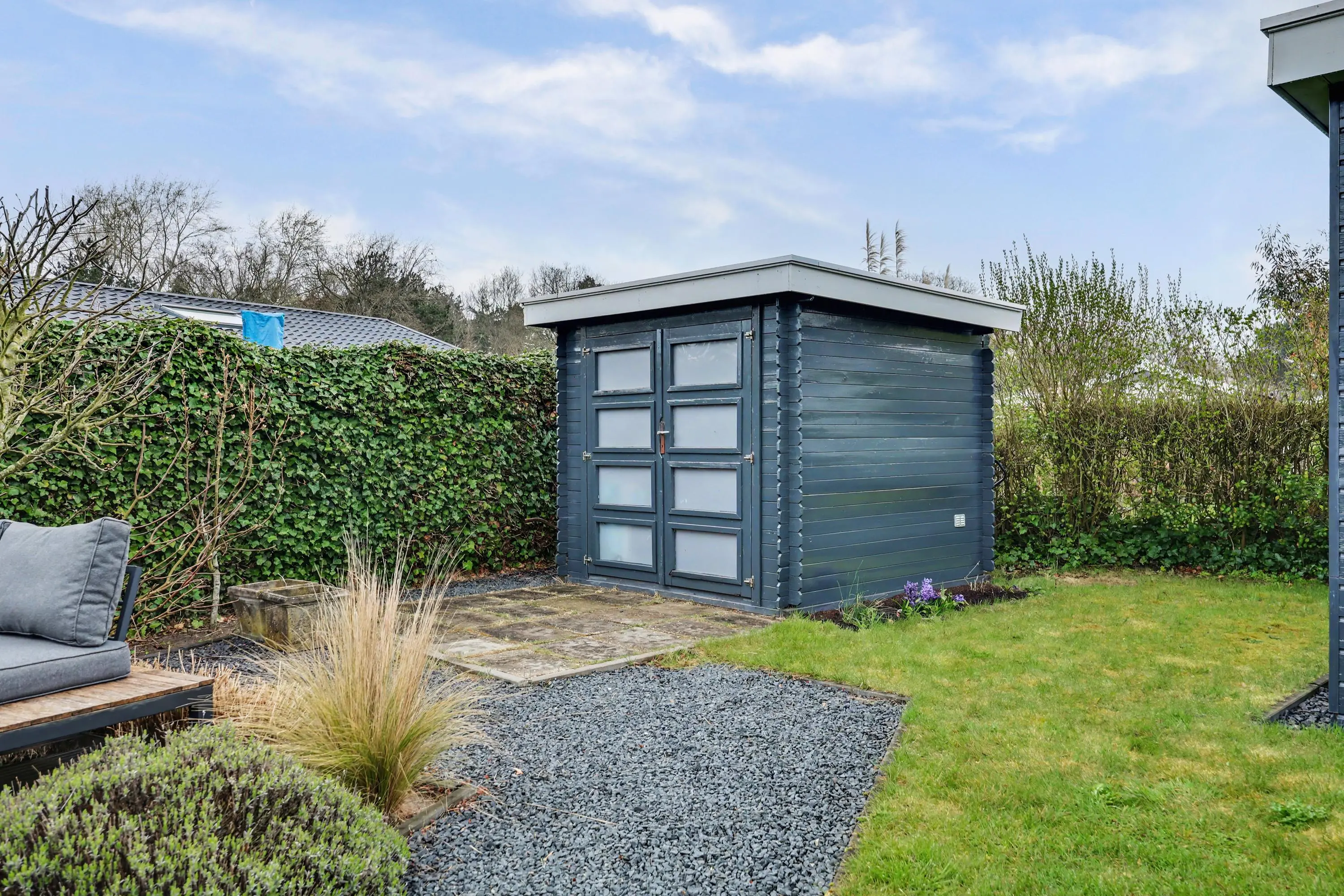 In de tuin is een vrijstaande houten buitenberging, ideaal voor bijvoorbeeld fietsen, surfspullen en tuingereedschap.