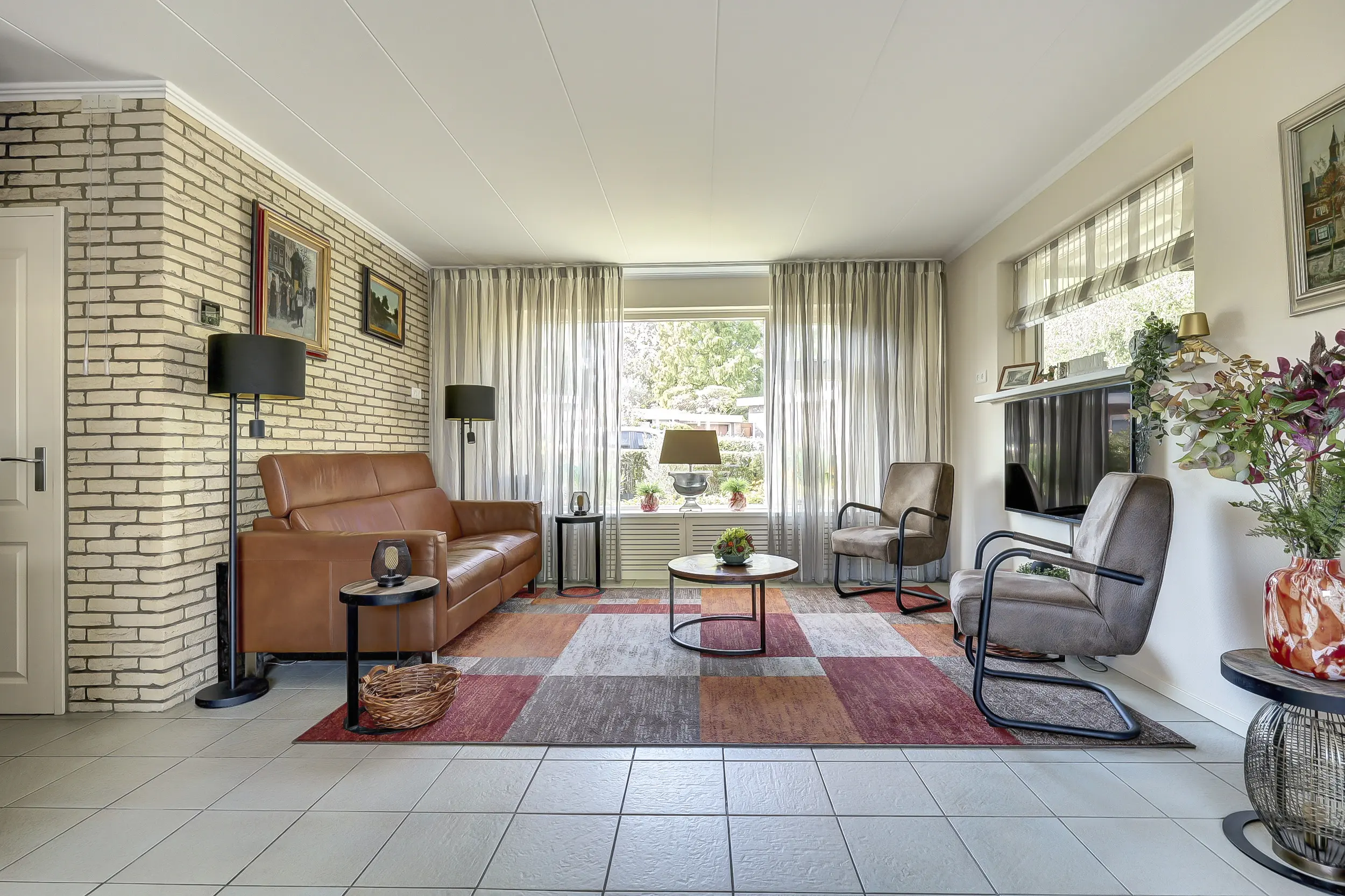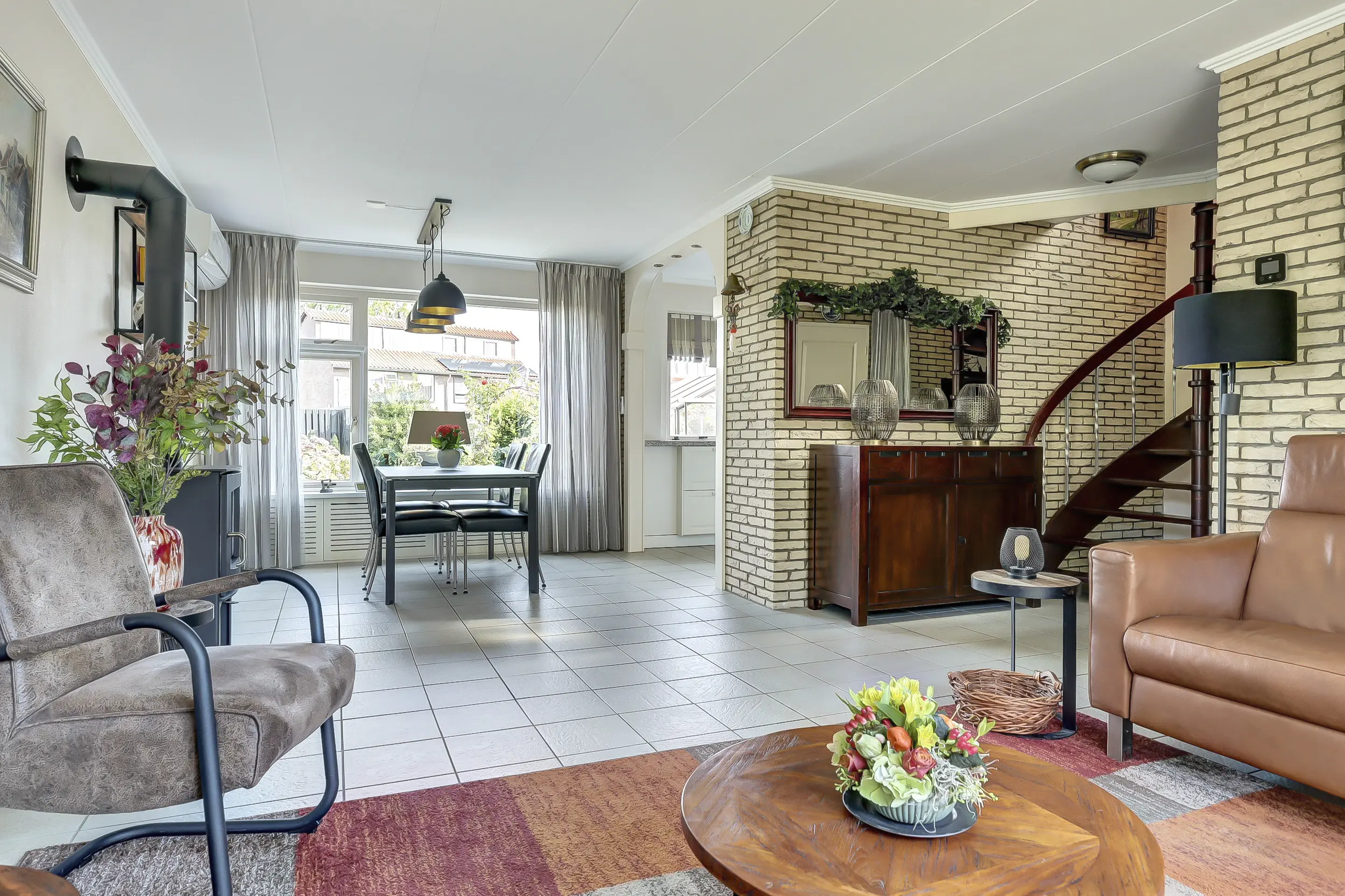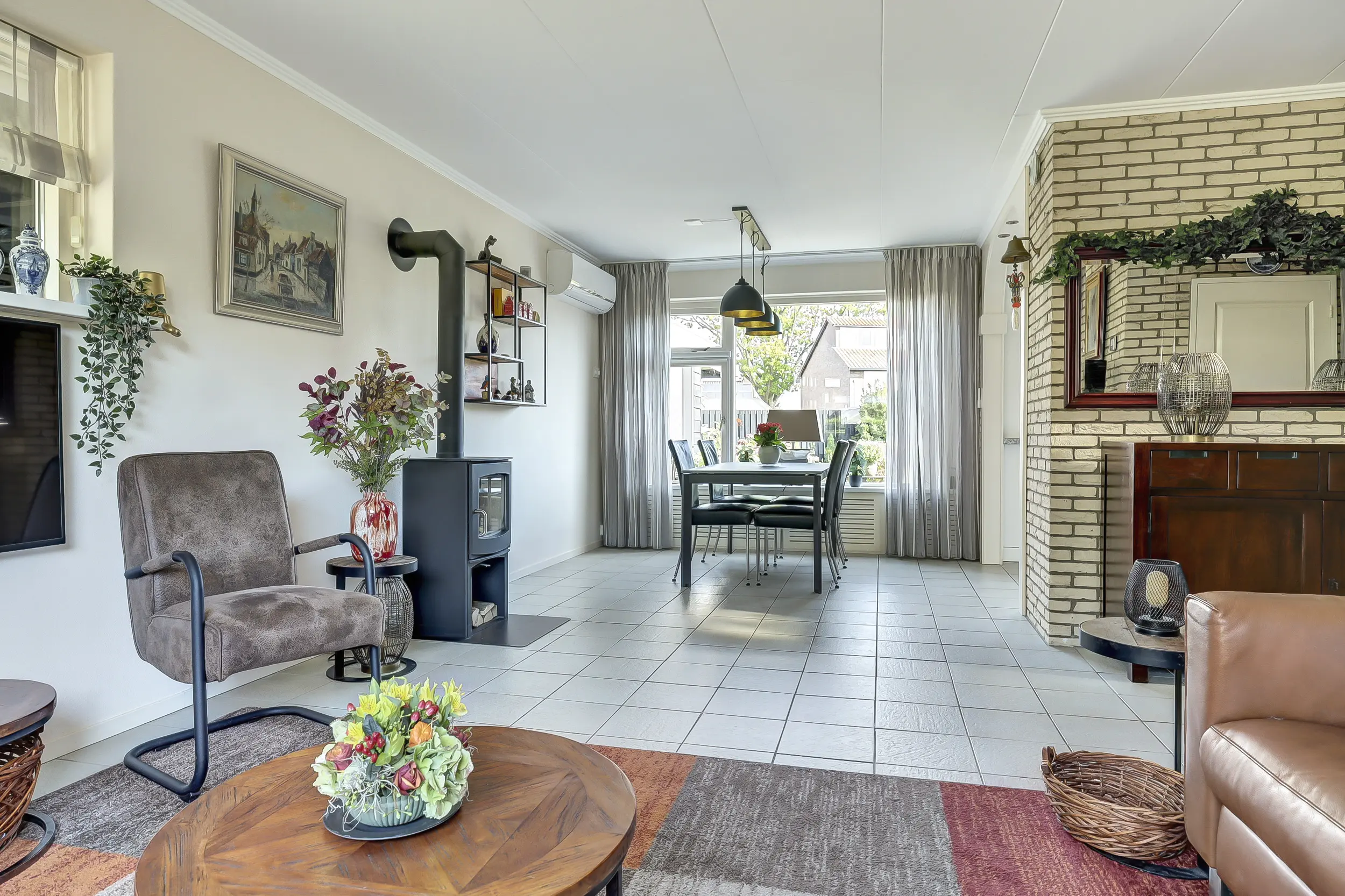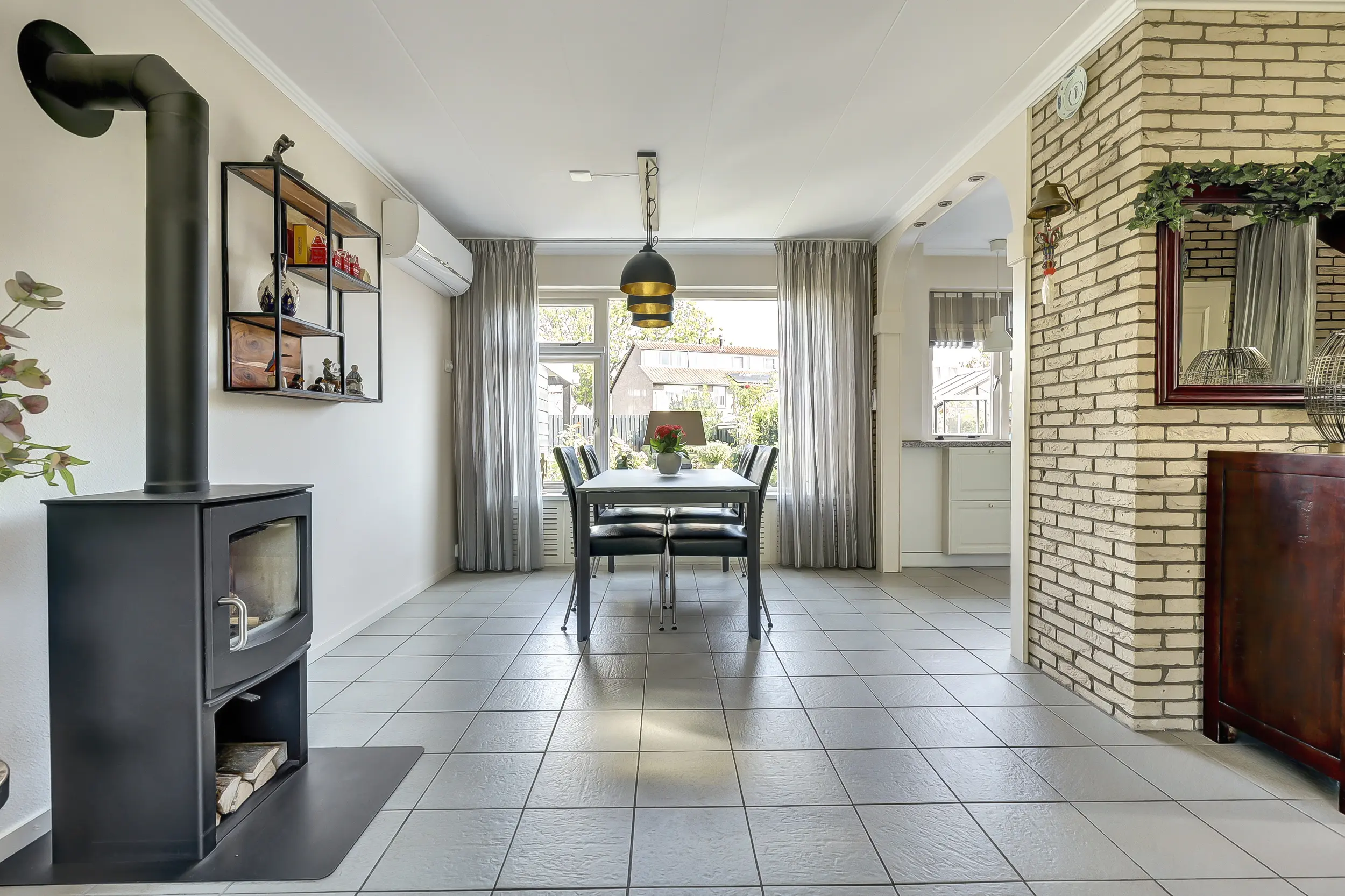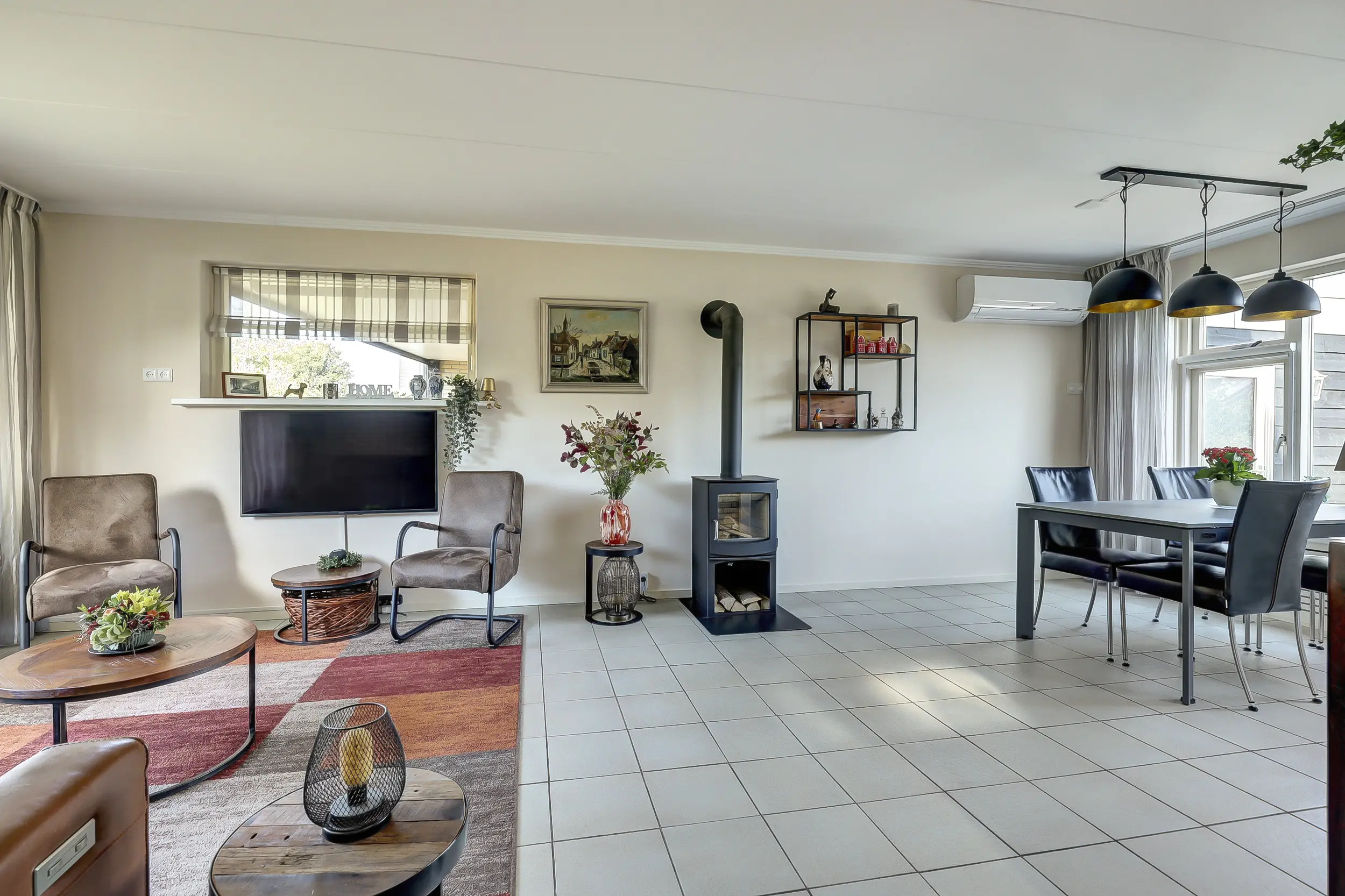 De sfeervolle woonkamer is voorzien van een tegelvloer met vloerverwarming met als middelpunt de moderne Dik Geurts houtkachel. De woonkamer heeft een airco unit.