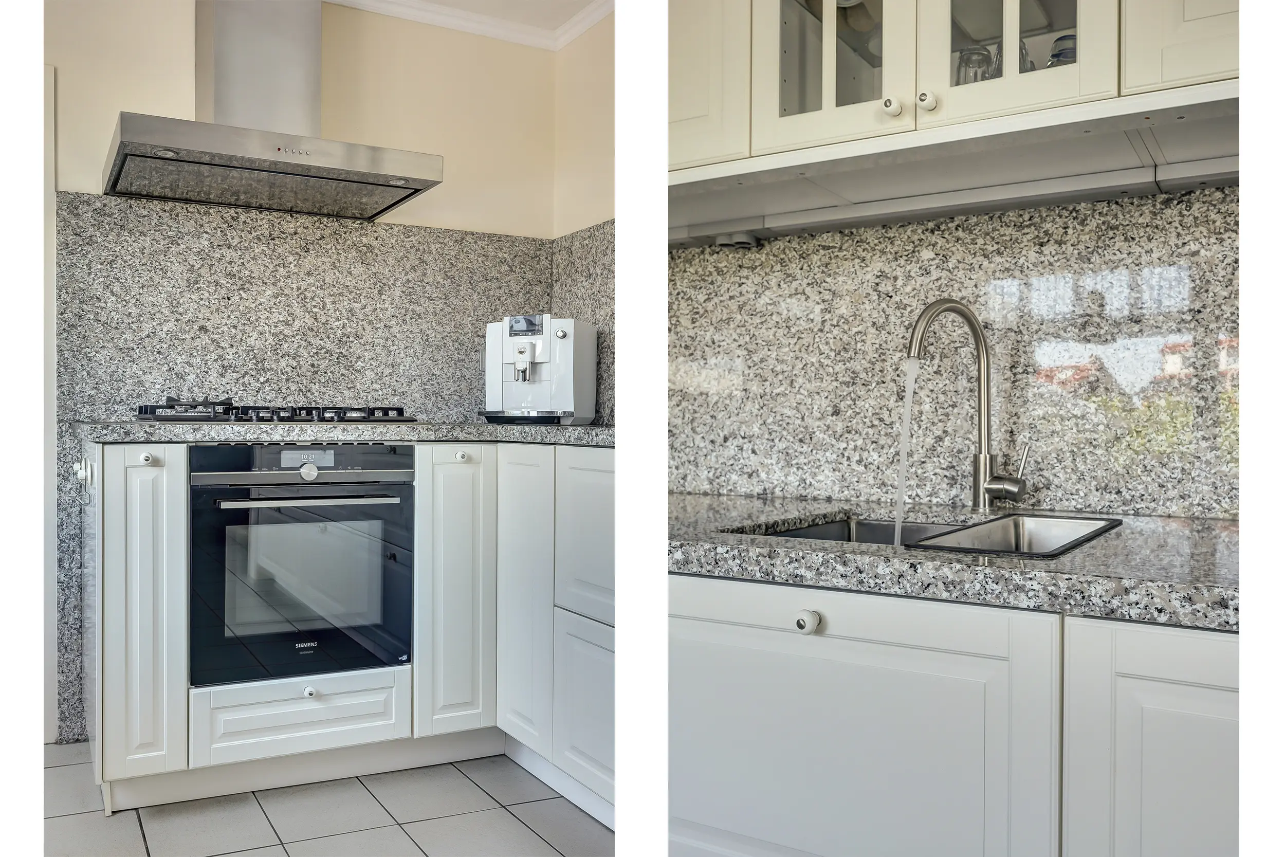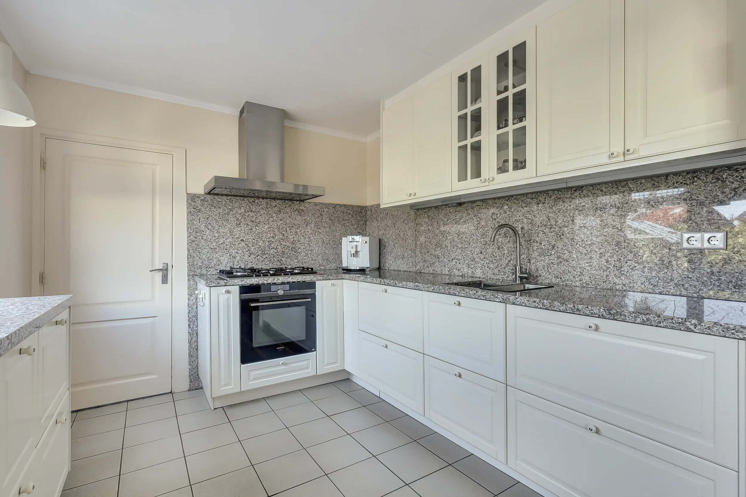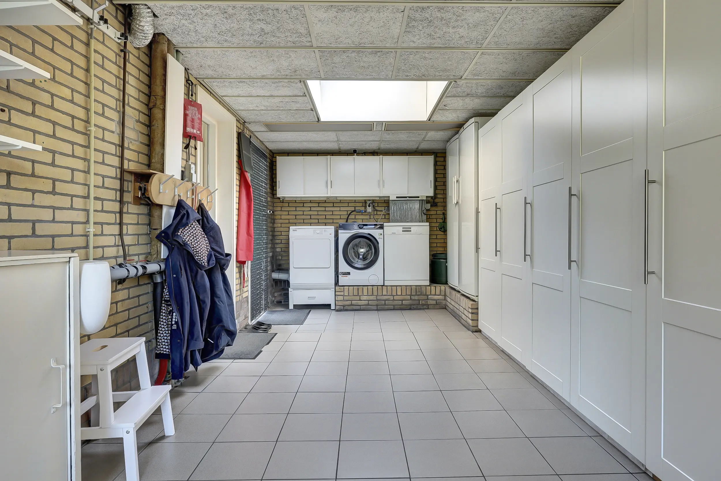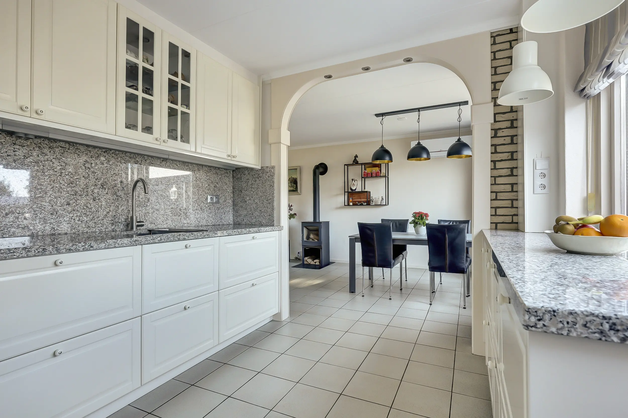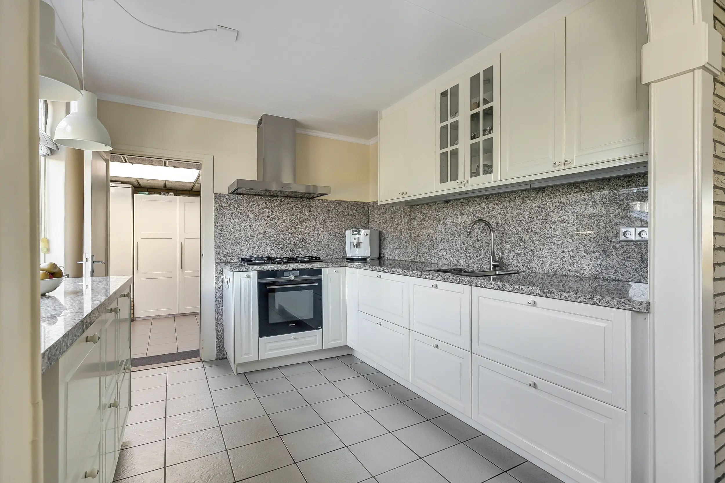 De open keuken is aan de achterzijde van de woning gelegen en is voorzien van keukenapparatuur en veel werk- en opbergruimte. De aangrenzende voormalige garage is in gebruik als bijkeuken/berging met een wasmachine- en drogeraansluiting en heeft een toegang naar de voorzijde en een deur naar de achtertuin.