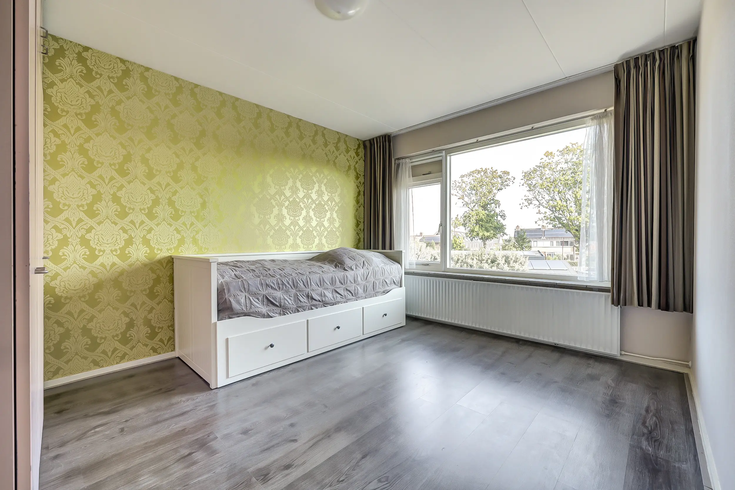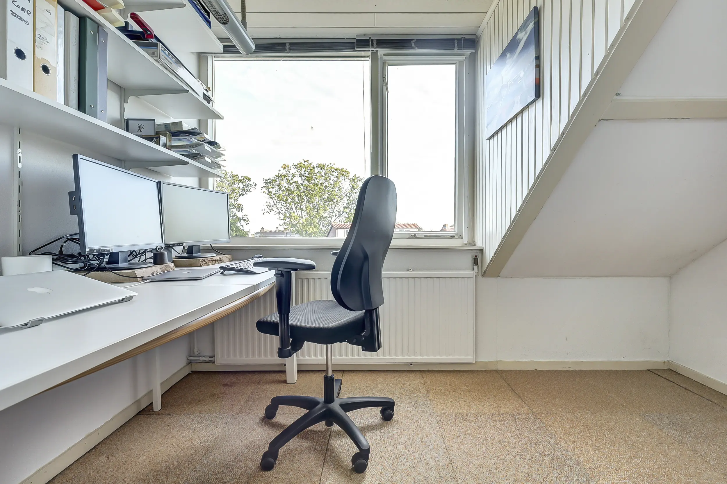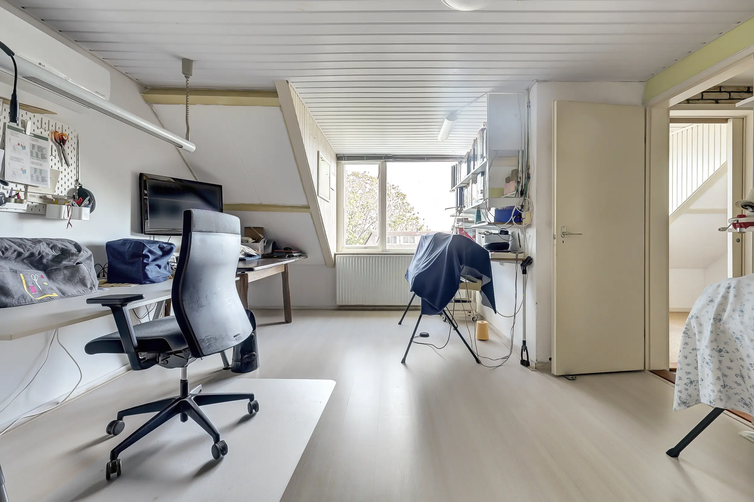 Via de vaste trap ga je naar de tweede verdieping die verrassend ruim is. Een overloop met bergruimte en twee kamers met dakkapel. Goed te gebruiken als slaap- en -of werkkamer.