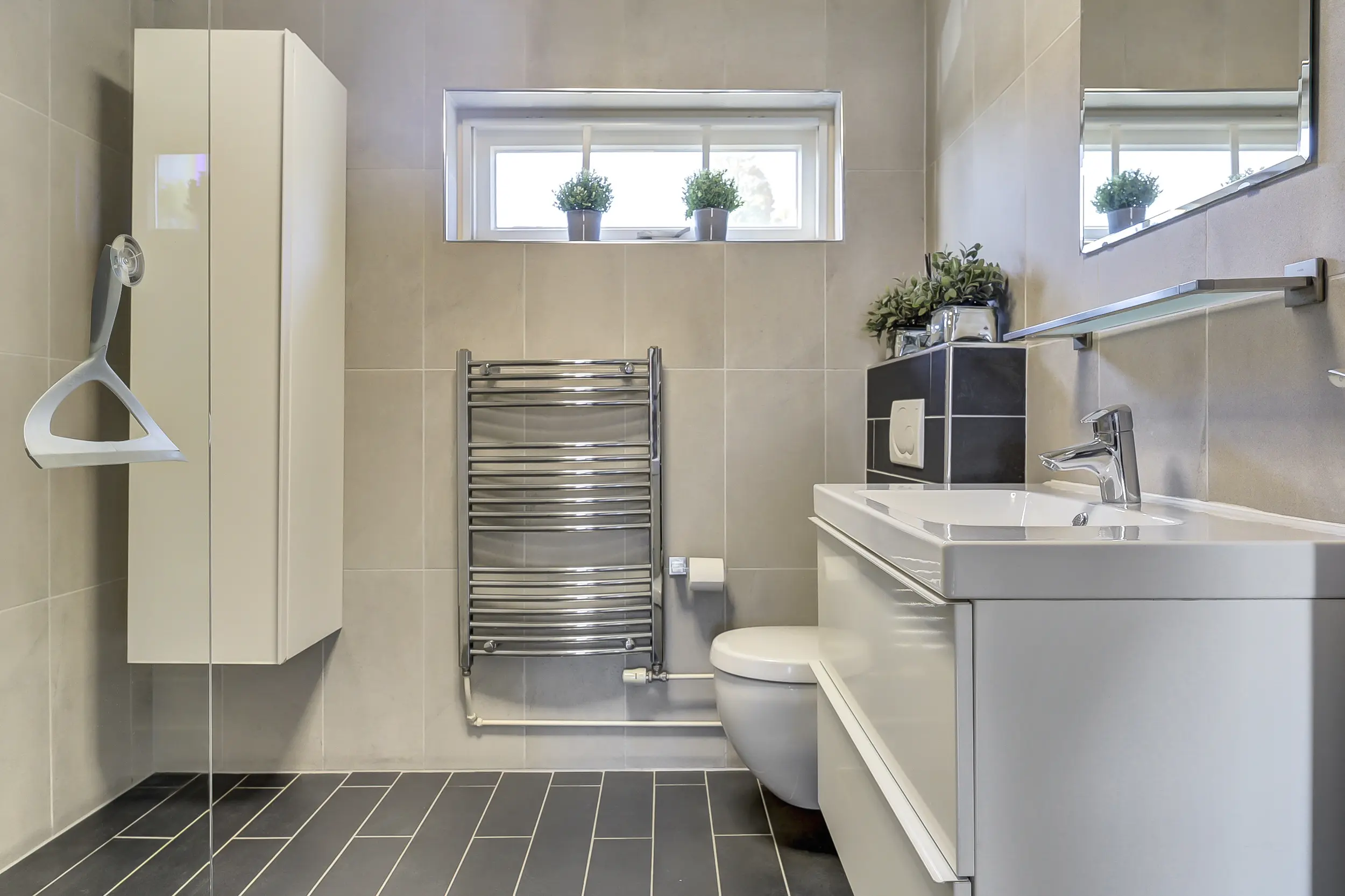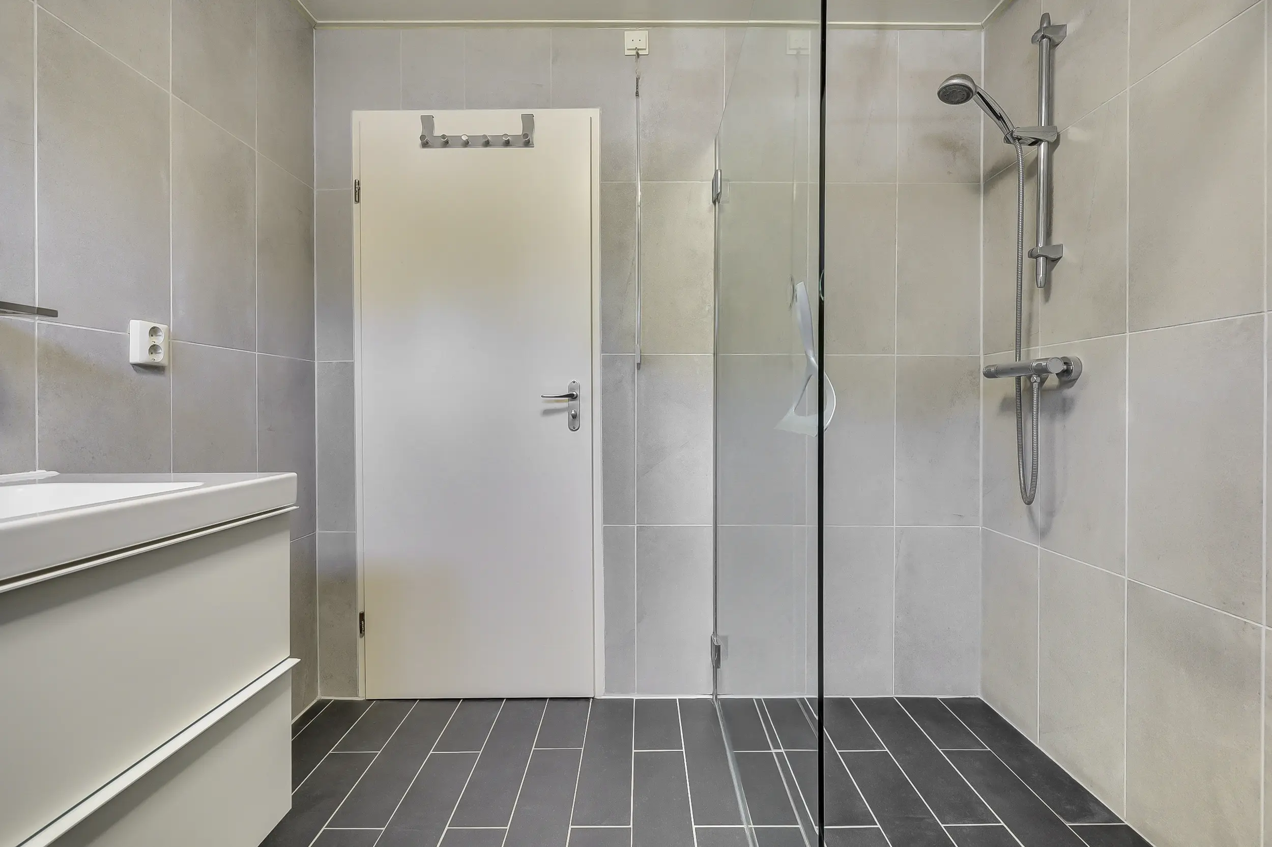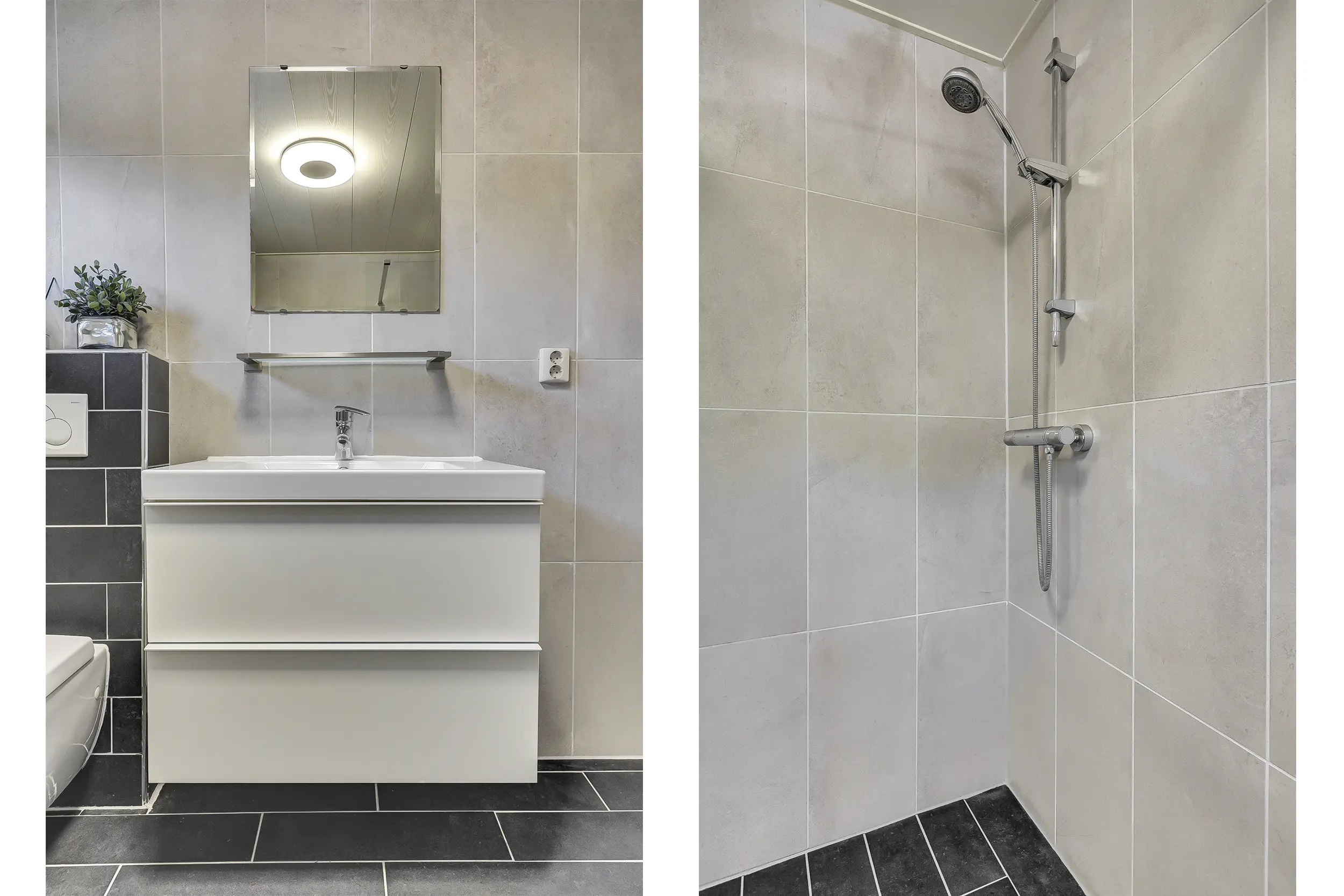 De moderne badkamer is geheel betegeld en is uitgerust met een inloopdouche, wastafelmeubel en een toilet.