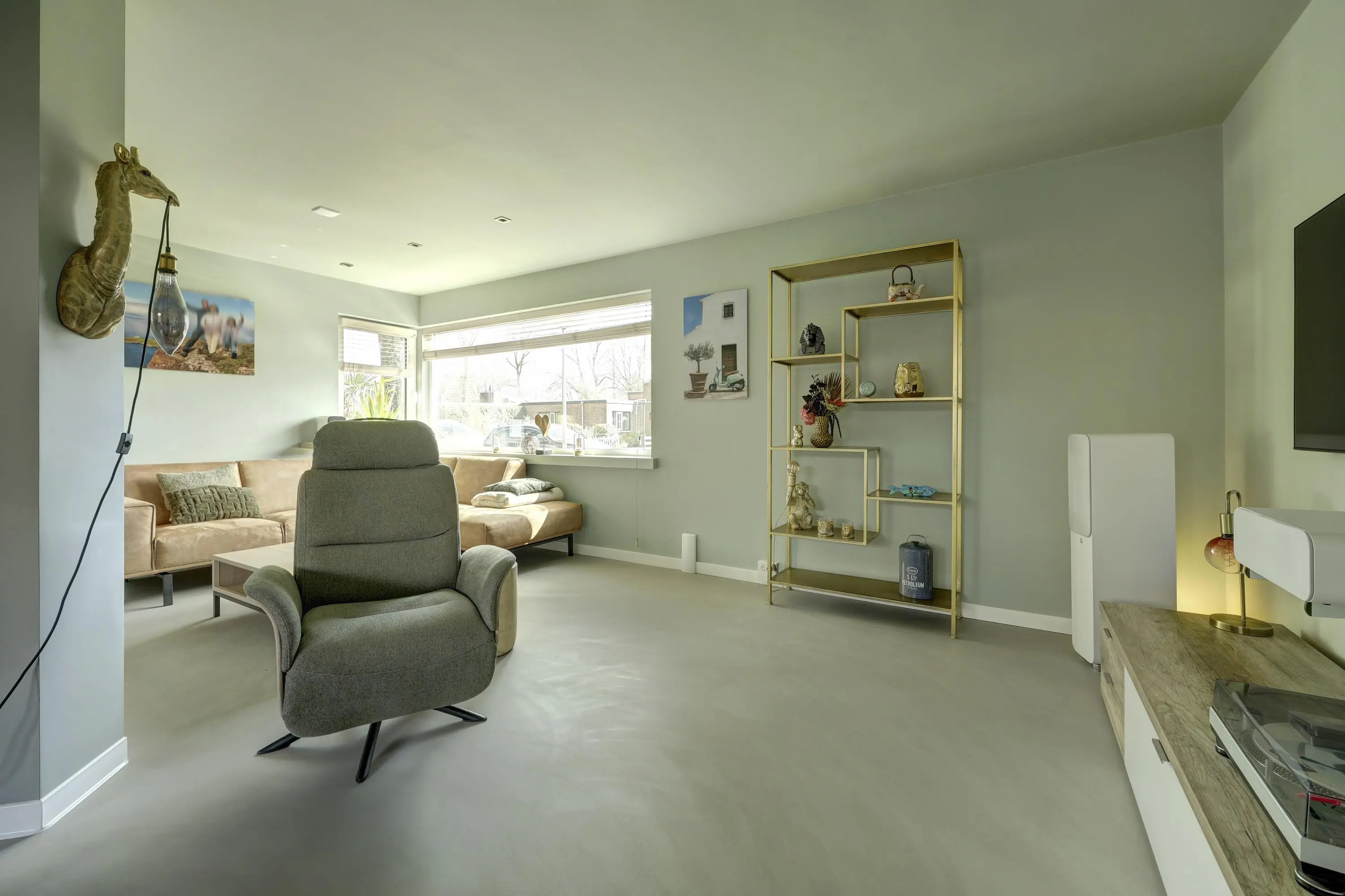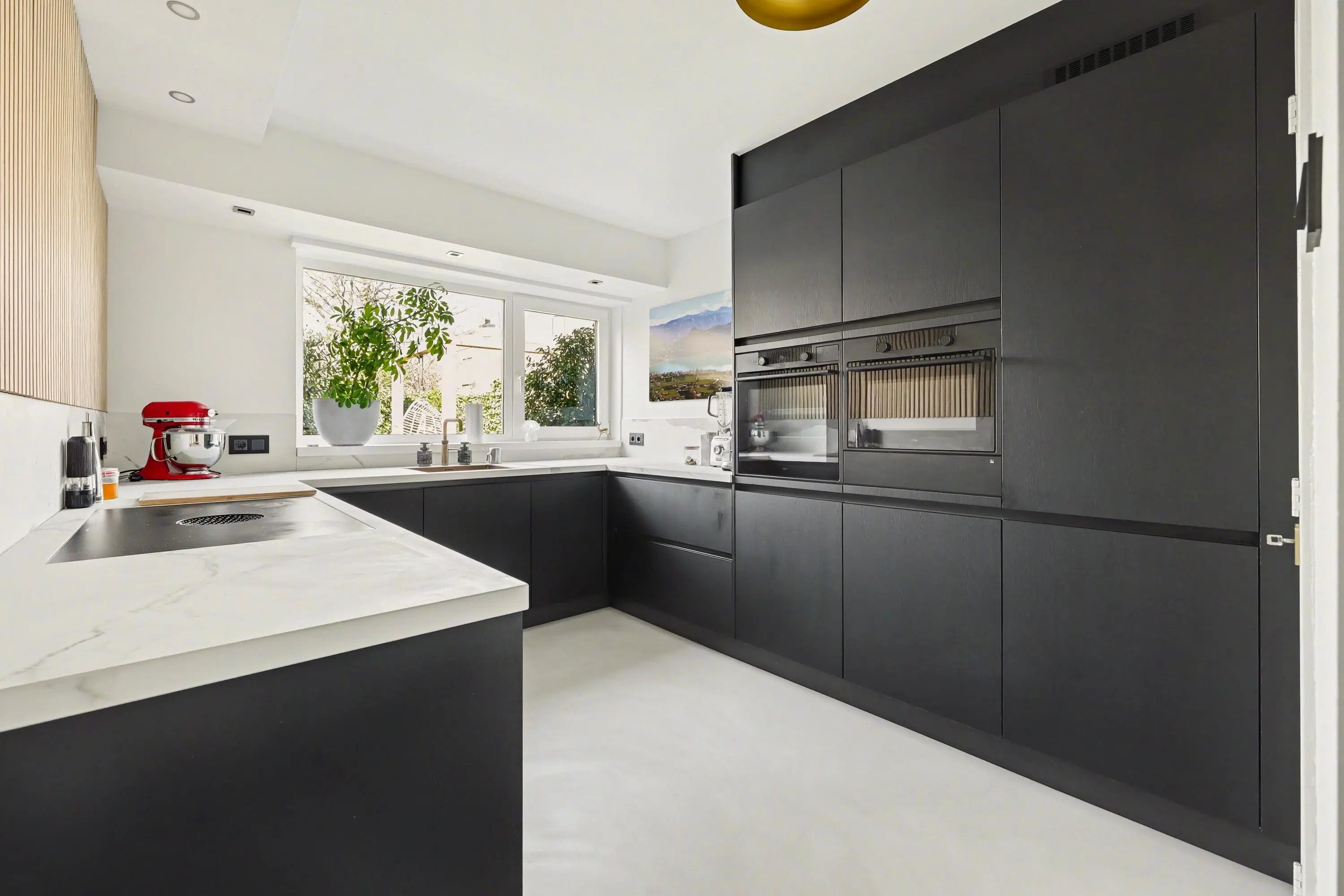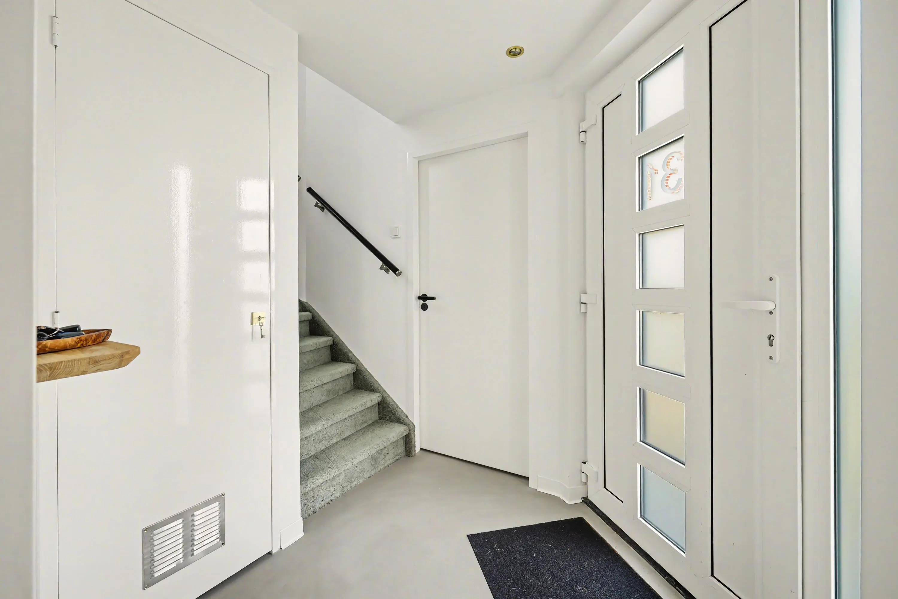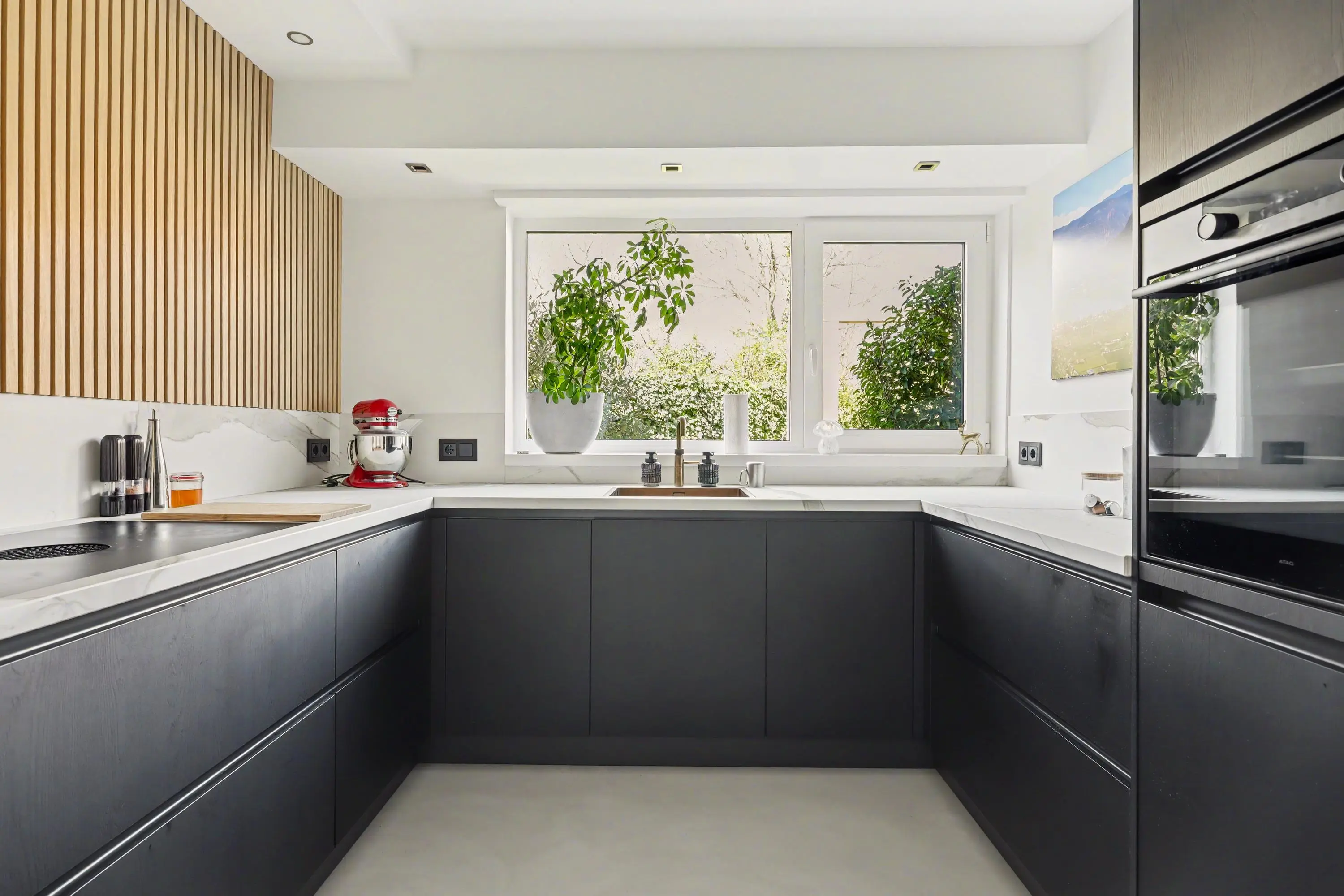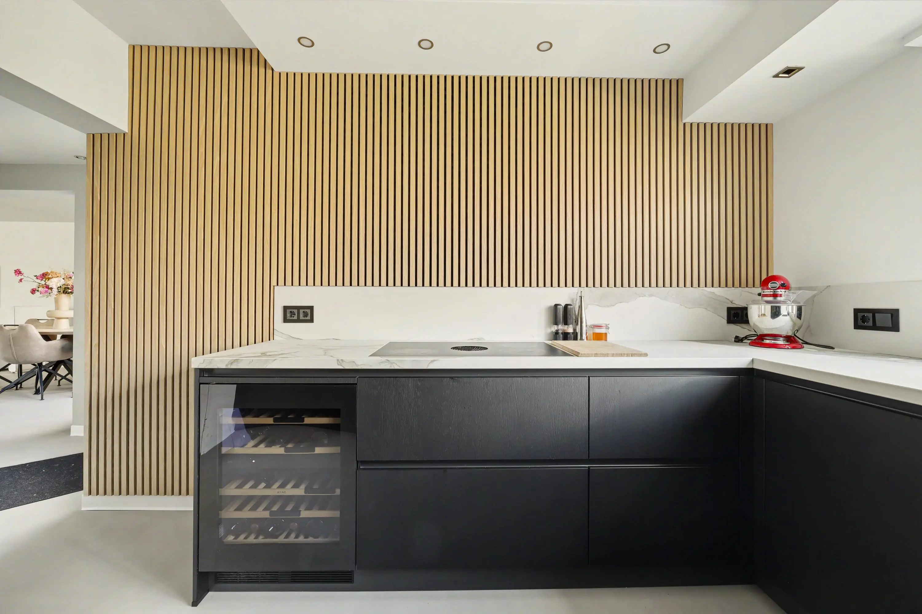 Entree in het ‘torengedeelte’ welke centraal in het huis ligt. Vanuit hier is de woonruimte, garage en 1e verdieping bereikbaar. In de entree is een bergkast waarin de CV-ketel is opgesteld (Remeha Calenta 2014). De woonverdieping is voorzien van een eigentijdse strijkvloer met vloerverwarming en is modern en sfeervol ingericht. Het woongedeelte ligt aan de voorzijde van de woning. Hier vind je een open haard en mooi lichtinval in huis. Door de open indeling aan de achterzijde van de kamer is ruimte voor de eettafel om heerlijk te zitten met familie of vrienden. De halfopen keuken gelegen aan de tuinzijde is van 2025 en van alle gemakken voorzien. De inbouwapparatuur bestaat uit een Bora inductieplaat met downdraft afzuiging, Quooker, een wijnkast, een vaatwasser, een stoomoven en oven met warmhoud lade en een koelkast en vriezer! Dit alles in een moderne uitvoering in U-opstelling. Hier is koken een feestje! Een grote inbouwkast biedt extra opbergruimte. Tussen de woonkamer en keuken zijn de betegelde toiletruimte en de meterkast gelegen. De tuin is bereikbaar via de tuindeur.
