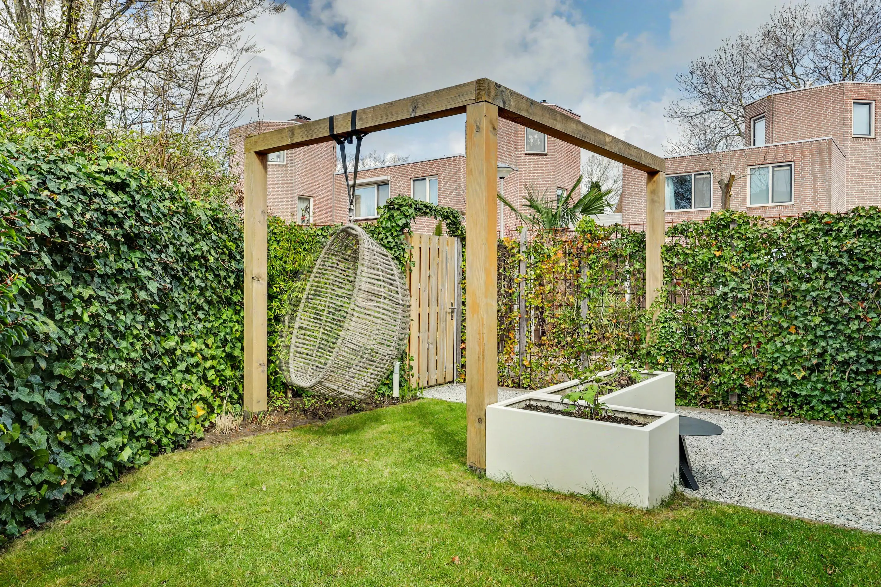 Aan de voorzijde is een mooi aangelegde tuin.