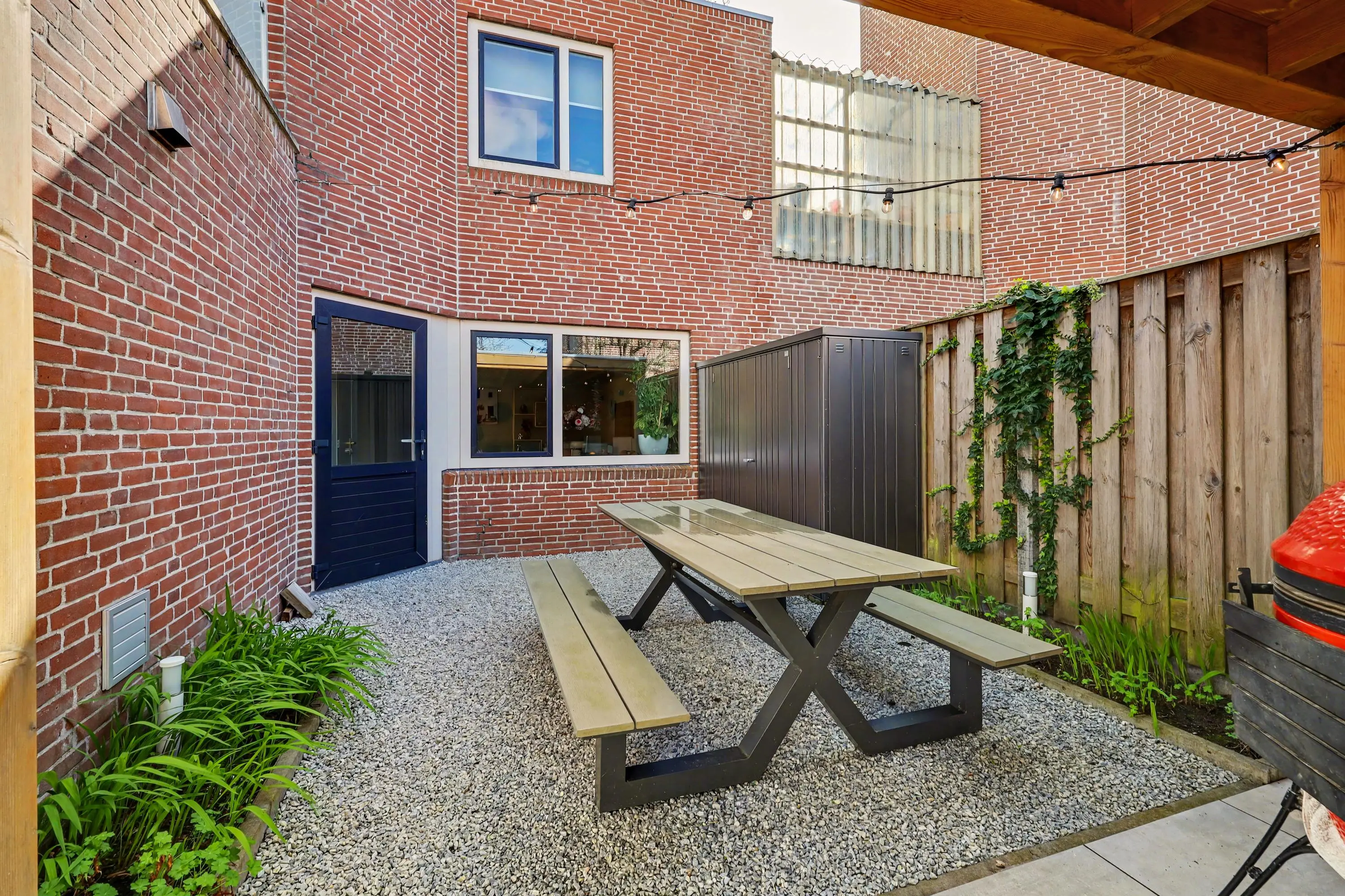 De verzorgde achtertuin met achterom biedt veel privacy, heeft een mooie overkapping met verlichting, een pergola, gazon en meerdere leuke zithoekjes. En natuurlijk is dan op de 1e verdieping het fijne dakterras.
