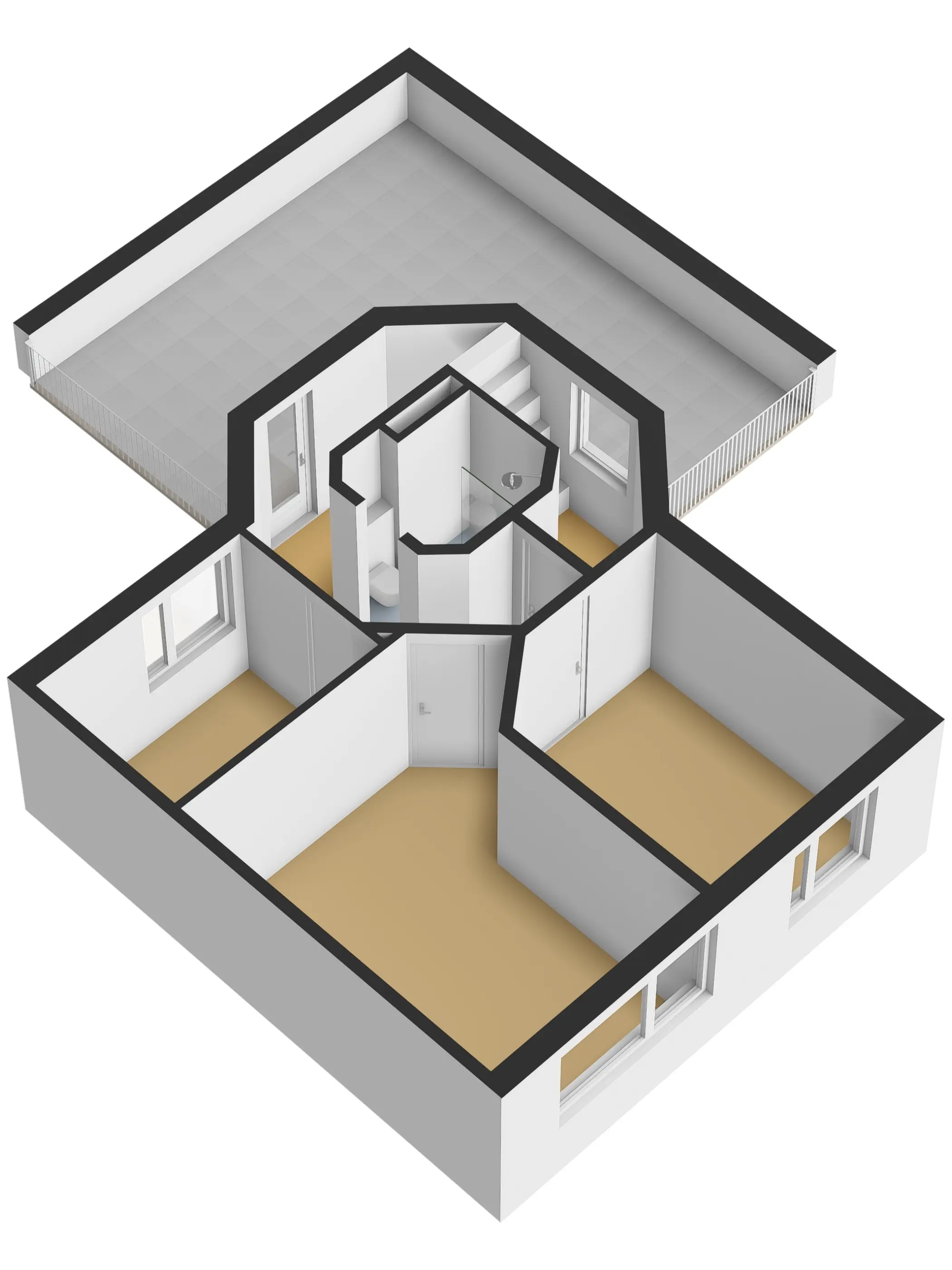 Deze verdieping heeft drie slaapkamers waarvan een kamer in gebruik is als kastenkamer. De badkamer ligt centraal in de toren en heeft een inloopdouche, 2e toilet en een wastafel. Alle ruimten zijn net als het dakterras bereikbaar vanaf de overloop. Het royale dakterras is voorzien van verlichting en wordt afgeschermd met een glazen wand. Vanaf hier zie je de mooiste zonsondergangen!