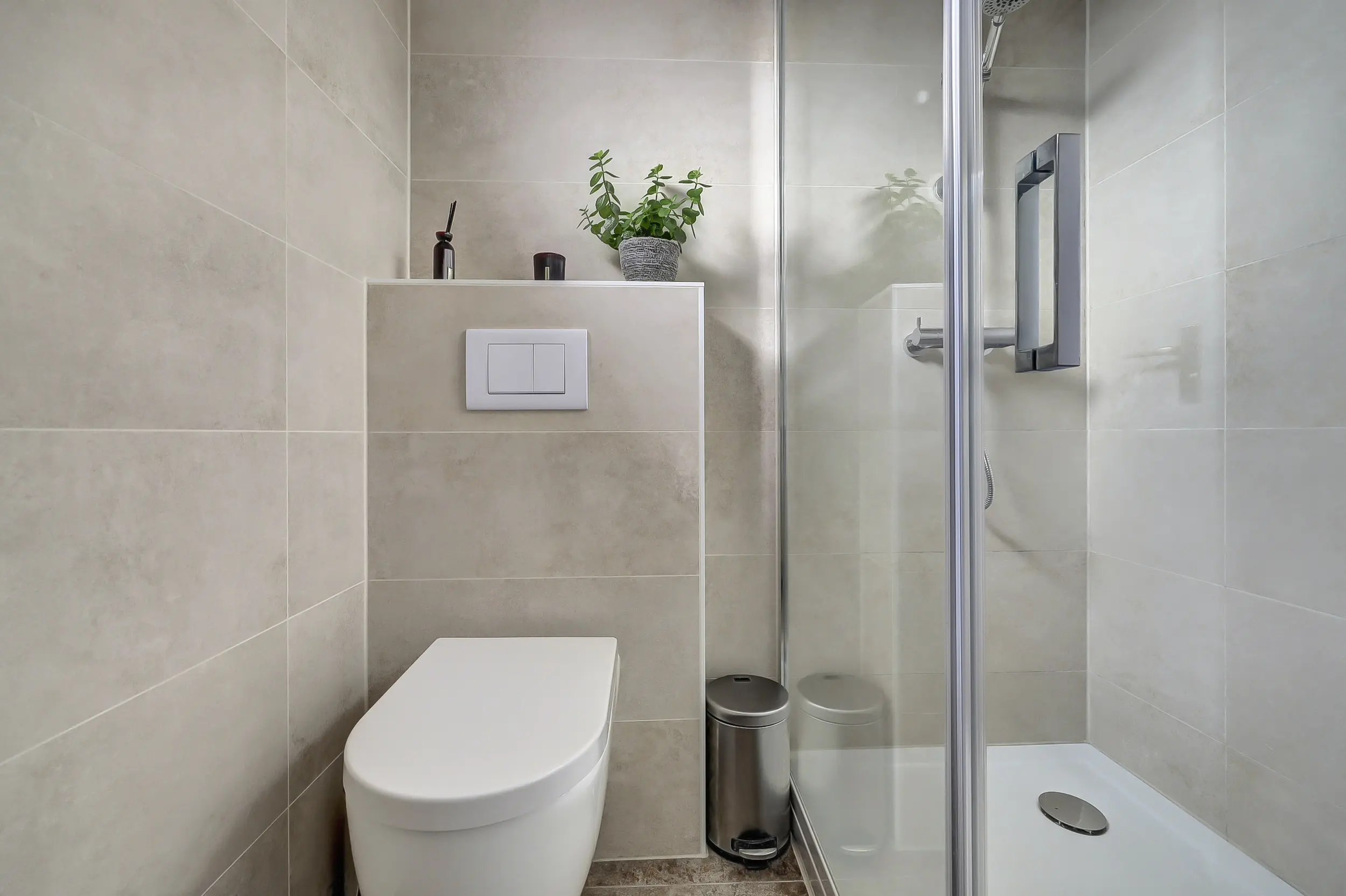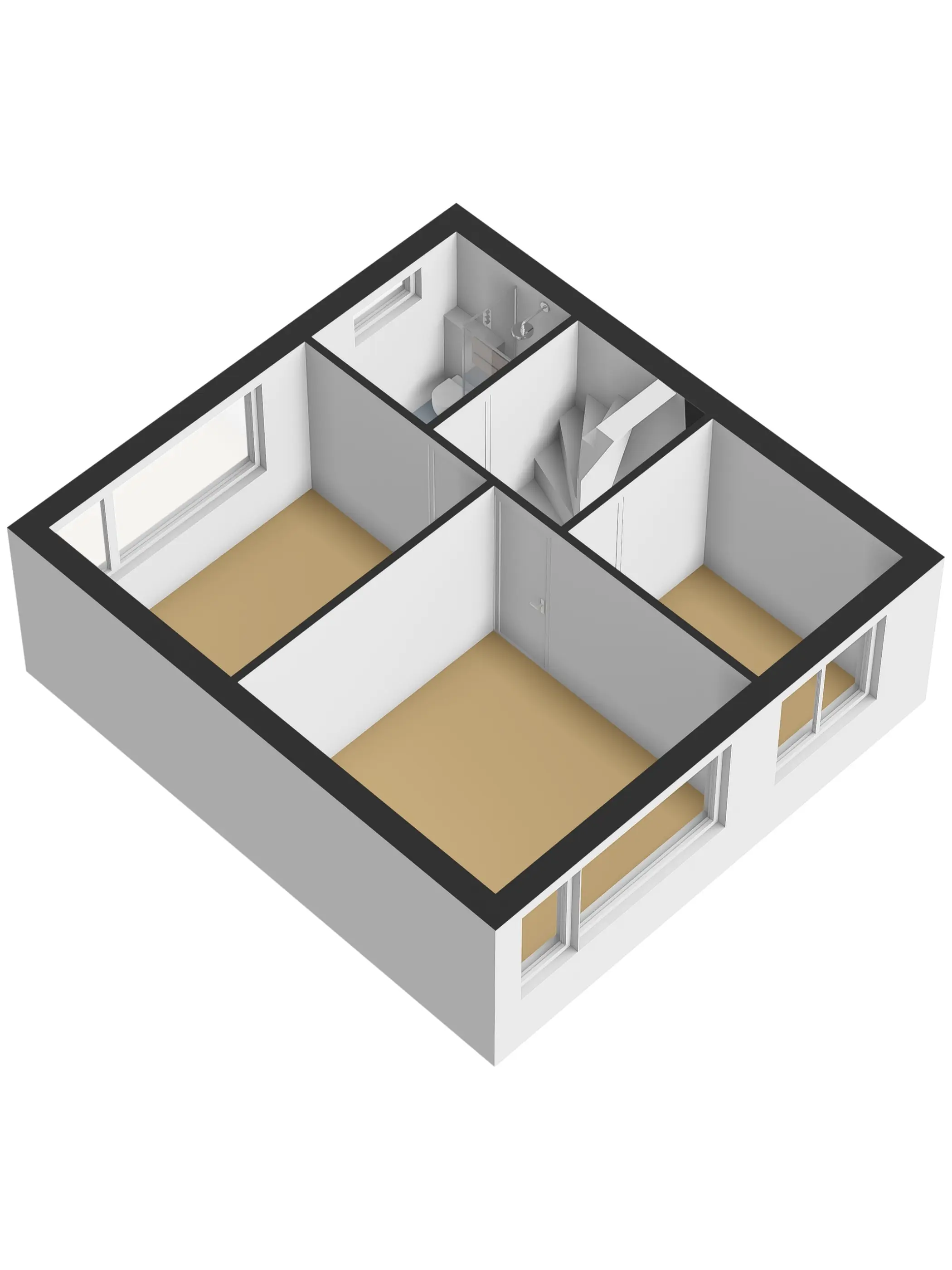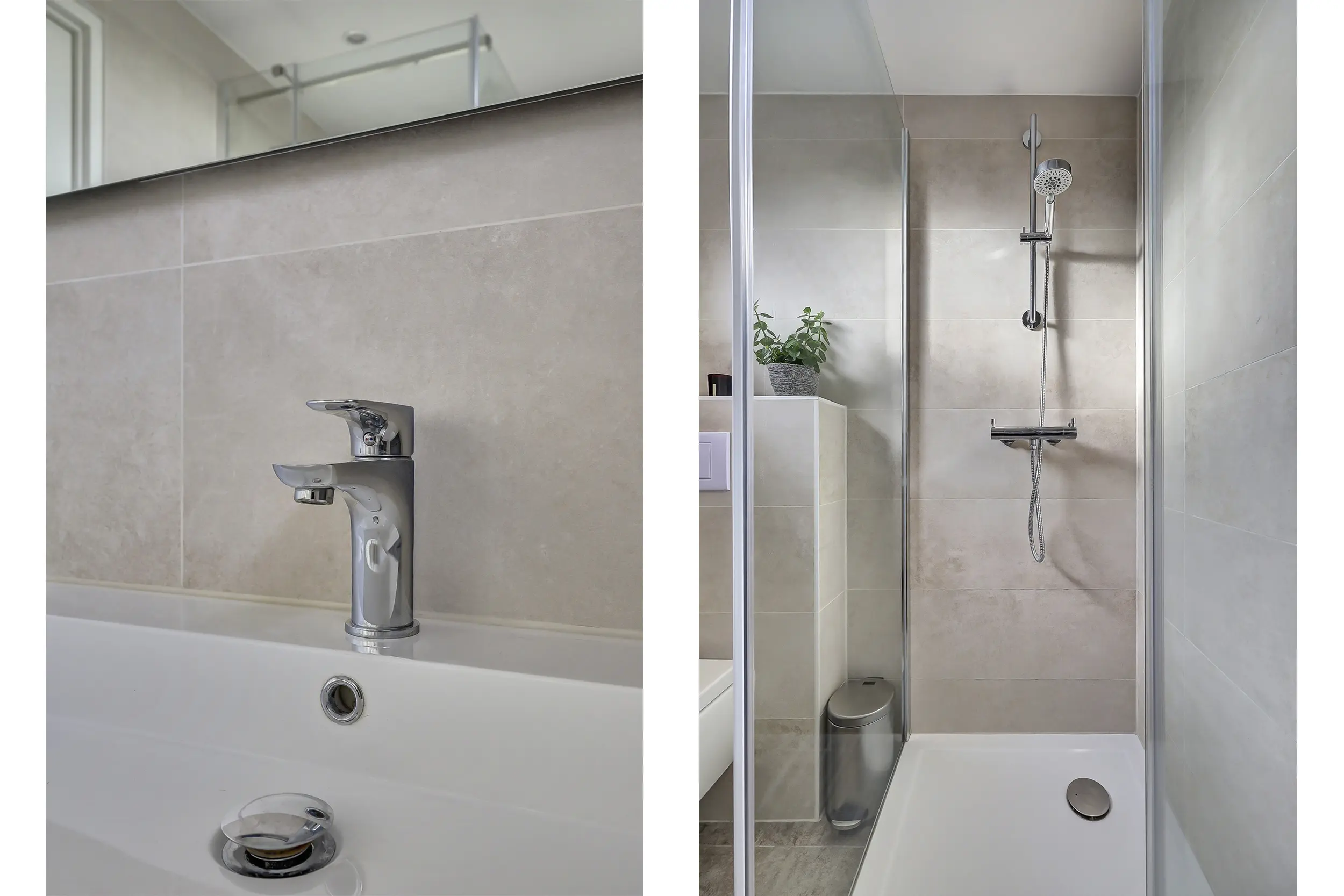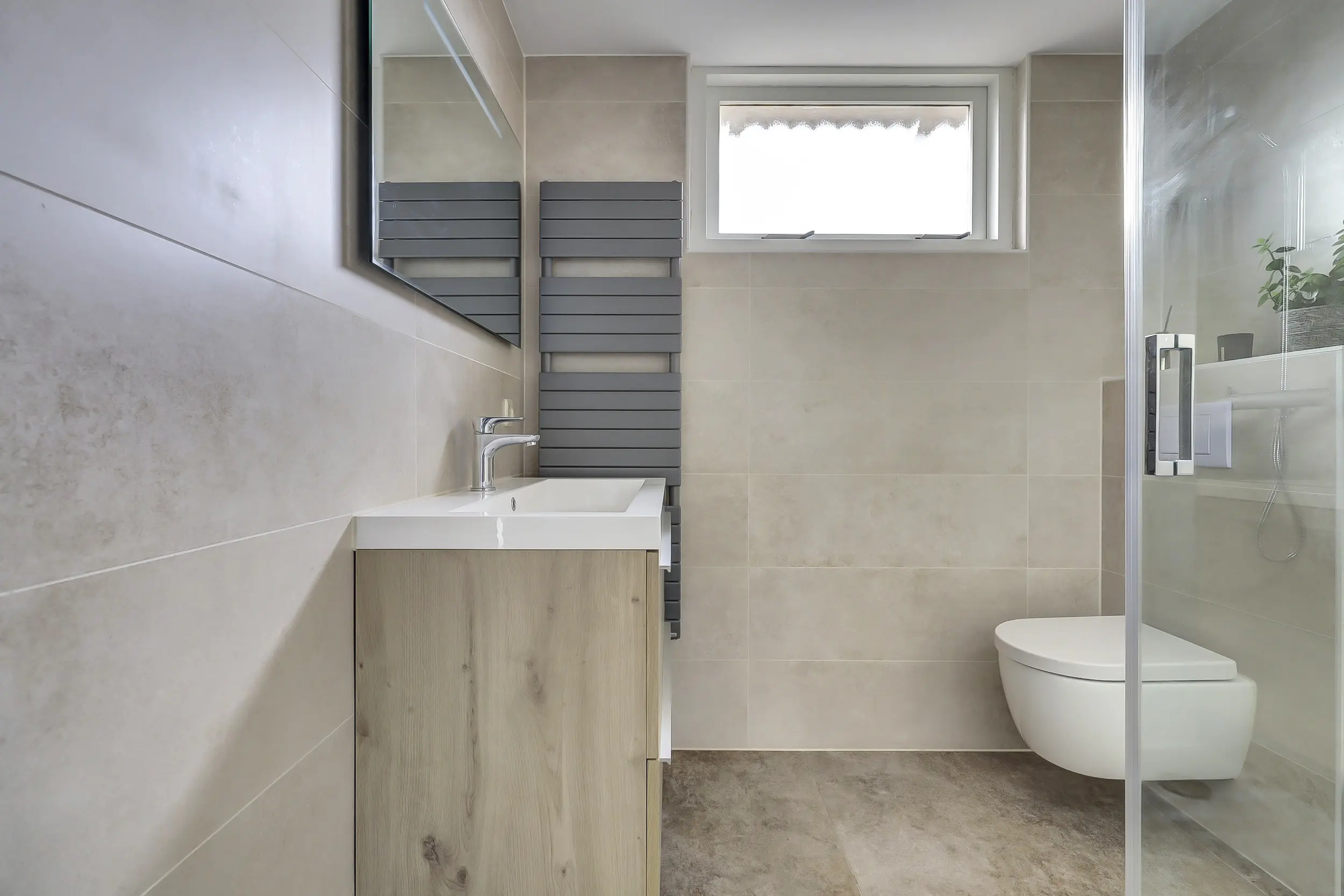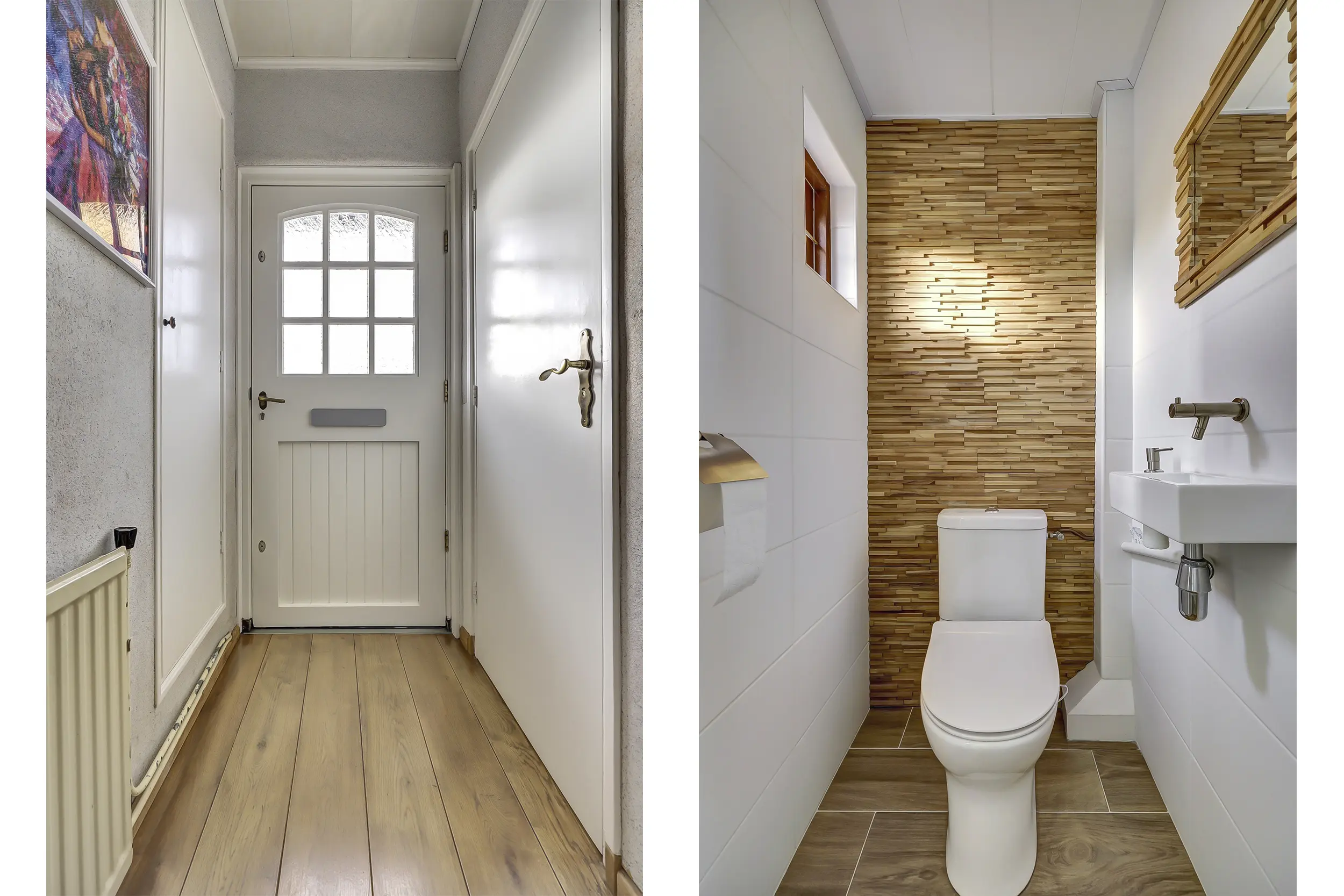 Overloop met drie comfortabele slaapkamers. De splinternieuwe, in 2024 gerealiseerde badkamer is met een 2e toilet, fraaie douche en een wastafelmeubel van alle gemakken voorzien.
