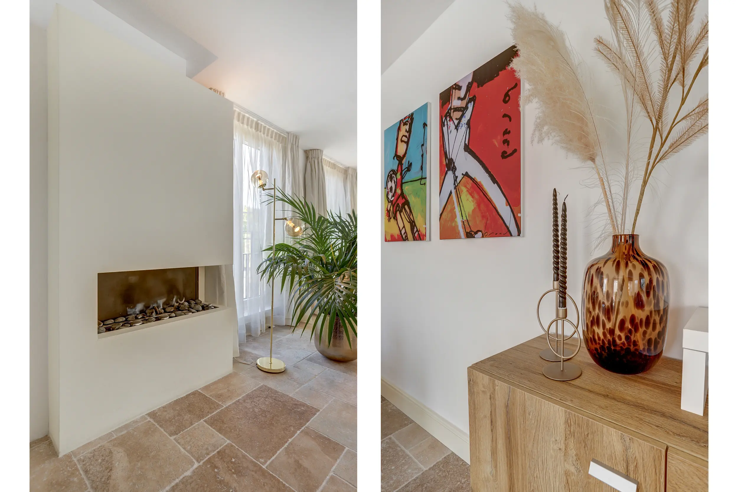 Via de entree kom je binnen in een ruime hal die toegang biedt tot alle vertrekken van het appartement. Aan de voorzijde bevindt zich de royale woonkamer, die dankzij de vele ramen over de volle breedte heerlijk licht is. Het natuurstenen vloeroppervlak en de strak gestuukte wanden en plafonds geven de ruimte een moderne en stijlvolle uitstraling. Vanuit de woonkamer leiden openslaande deuren naar de afgesloten keuken. De strakke, zwarte inrichting met hoogwaardige inbouwapparatuur geeft de keuken een luxe en eigentijdse sfeer.