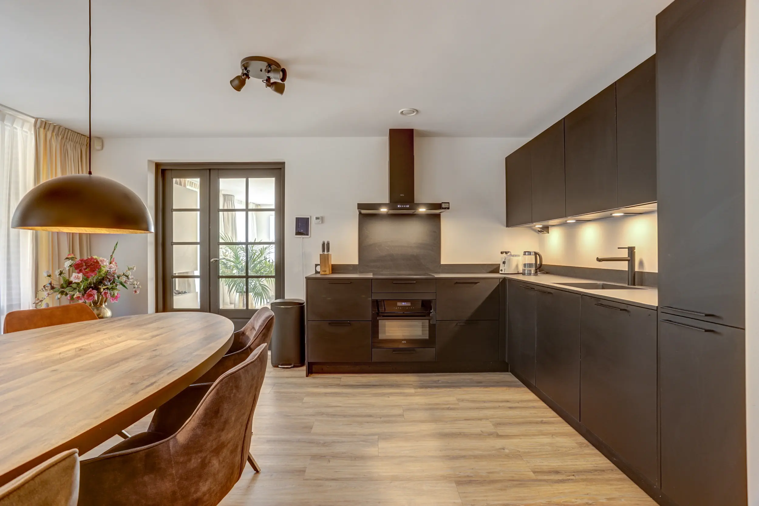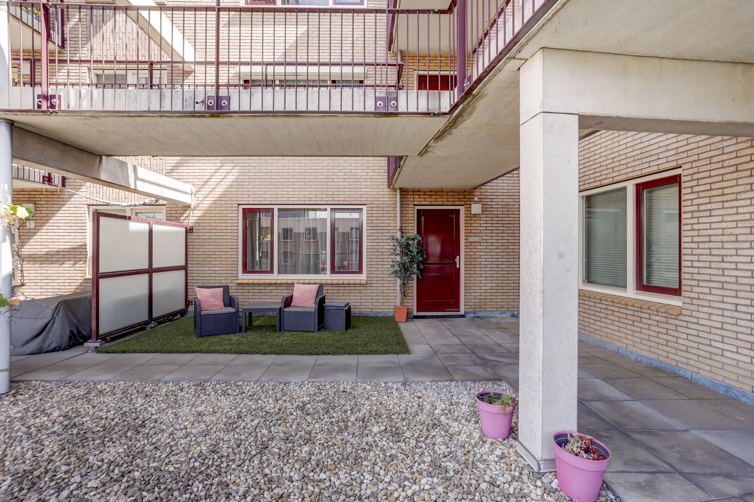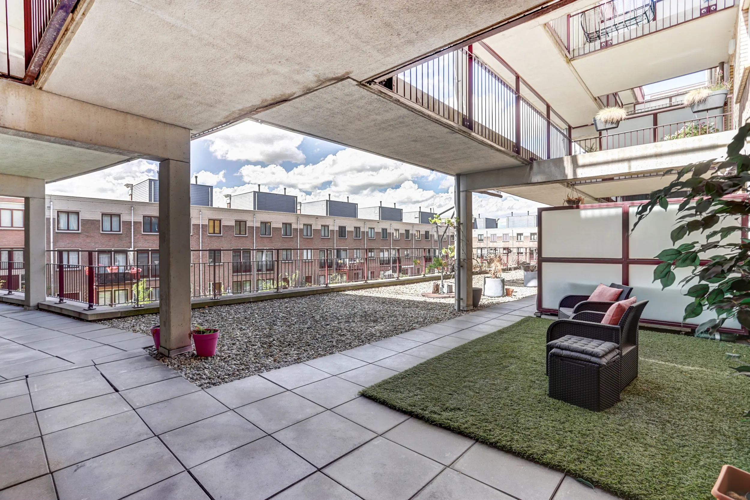 Grenzend aan de keuken ligt het ruime, overdekte terras waar je ’s ochtends kunt genieten van een ontbijt in de zon. Voor de avonduren is er nog een tweede terras aan de galerijzijde, met uitzicht op de sfeervolle binnentuin van het complex.