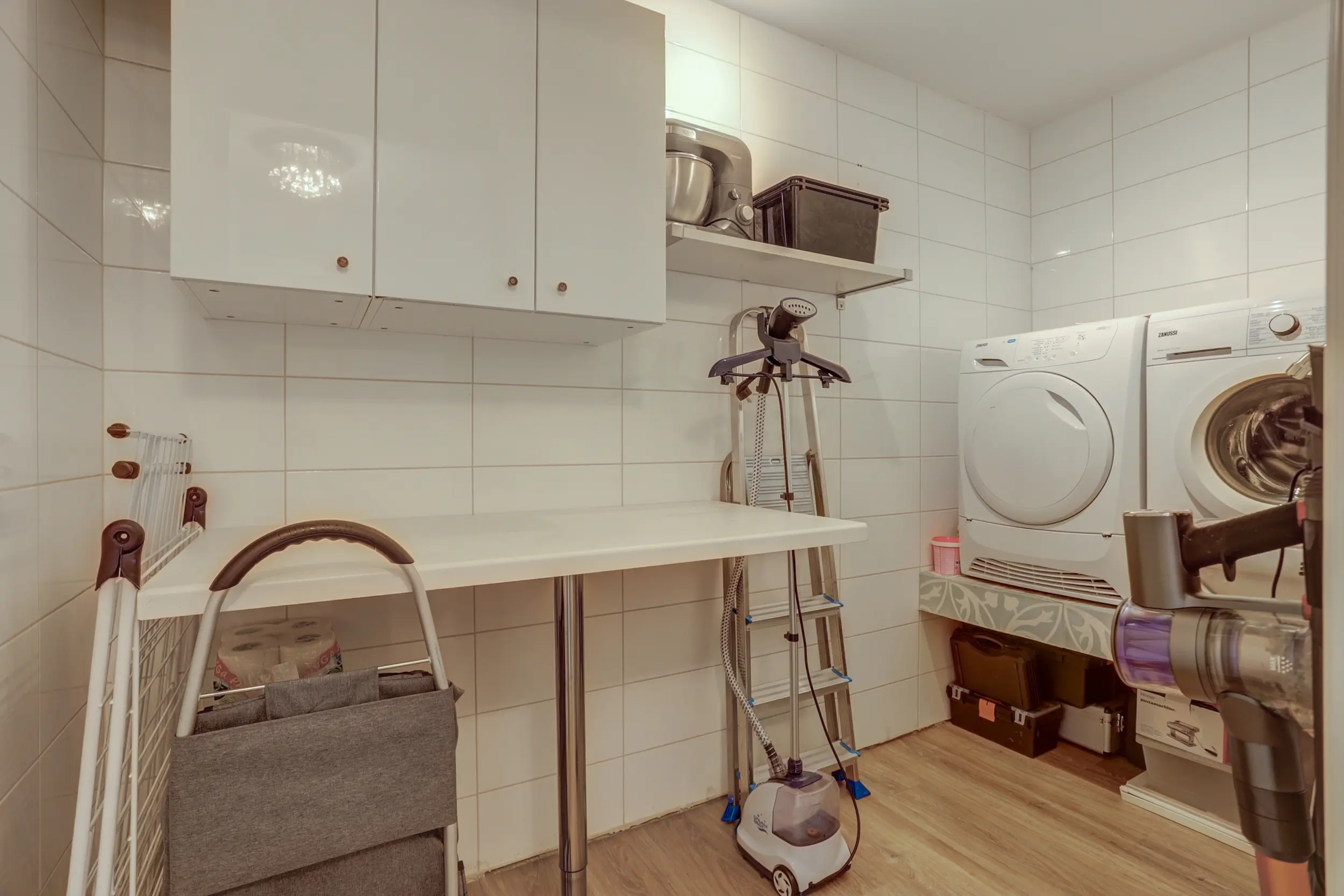 Daarnaast is er een afzonderlijk toilet aanwezig. In de brede gang bevinden zich verder een meterkast, een c.v.-kast met cv-ketel en warmte-terugwinunit, en een praktische wasruimte met verhoogde opstelling voor wasmachine en droger, voorzien van een extra wastafel.