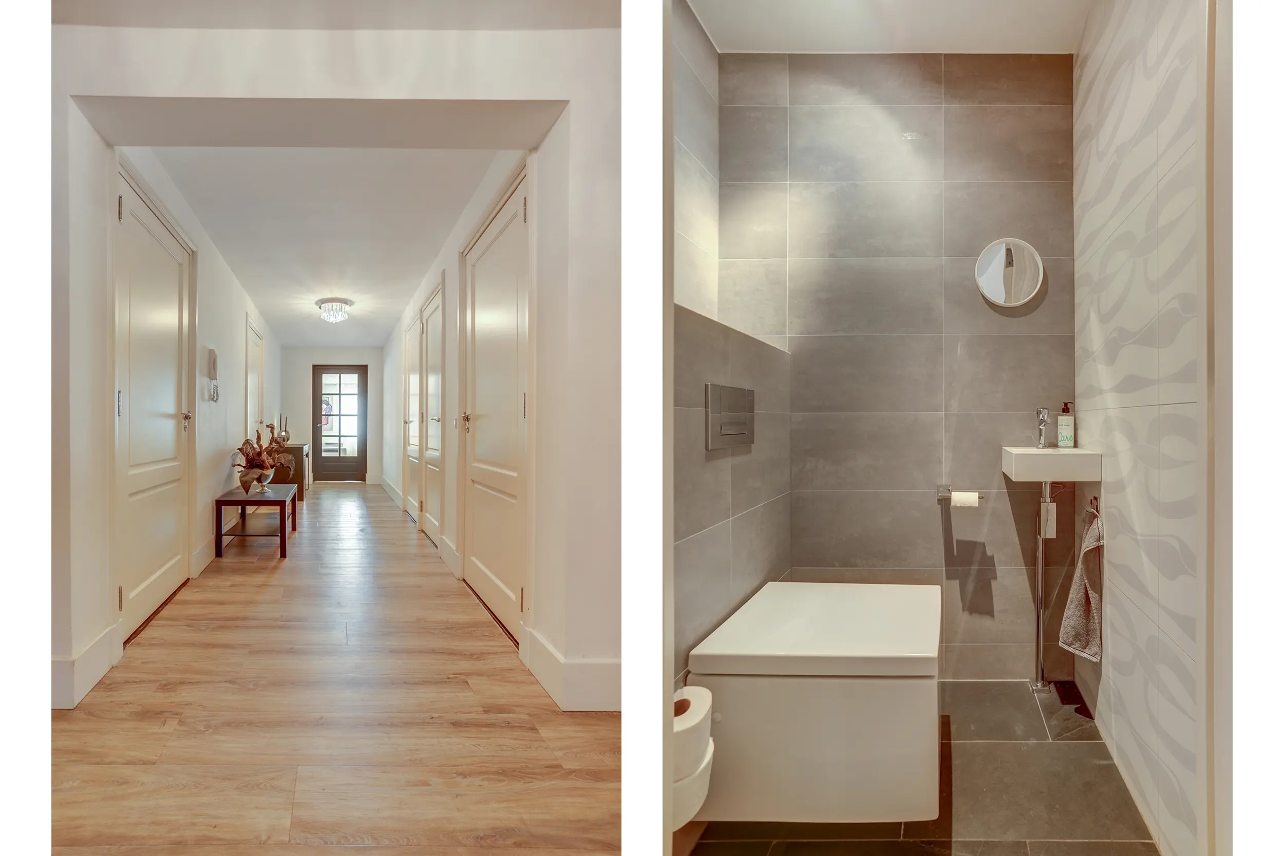 Het appartement beschikt over twee comfortabele slaapkamers, beide afgewerkt met een PVC vloer en glad gestuukte wanden. De hoofdslaapkamer is voorzien van een eigen badkamer met inloopdouche, ligbad, toilet en wastafel. De tweede slaapkamer maakt gebruik van de tweede badkamer, die eveneens modern is uitgevoerd met een inloopdouche en wastafel.