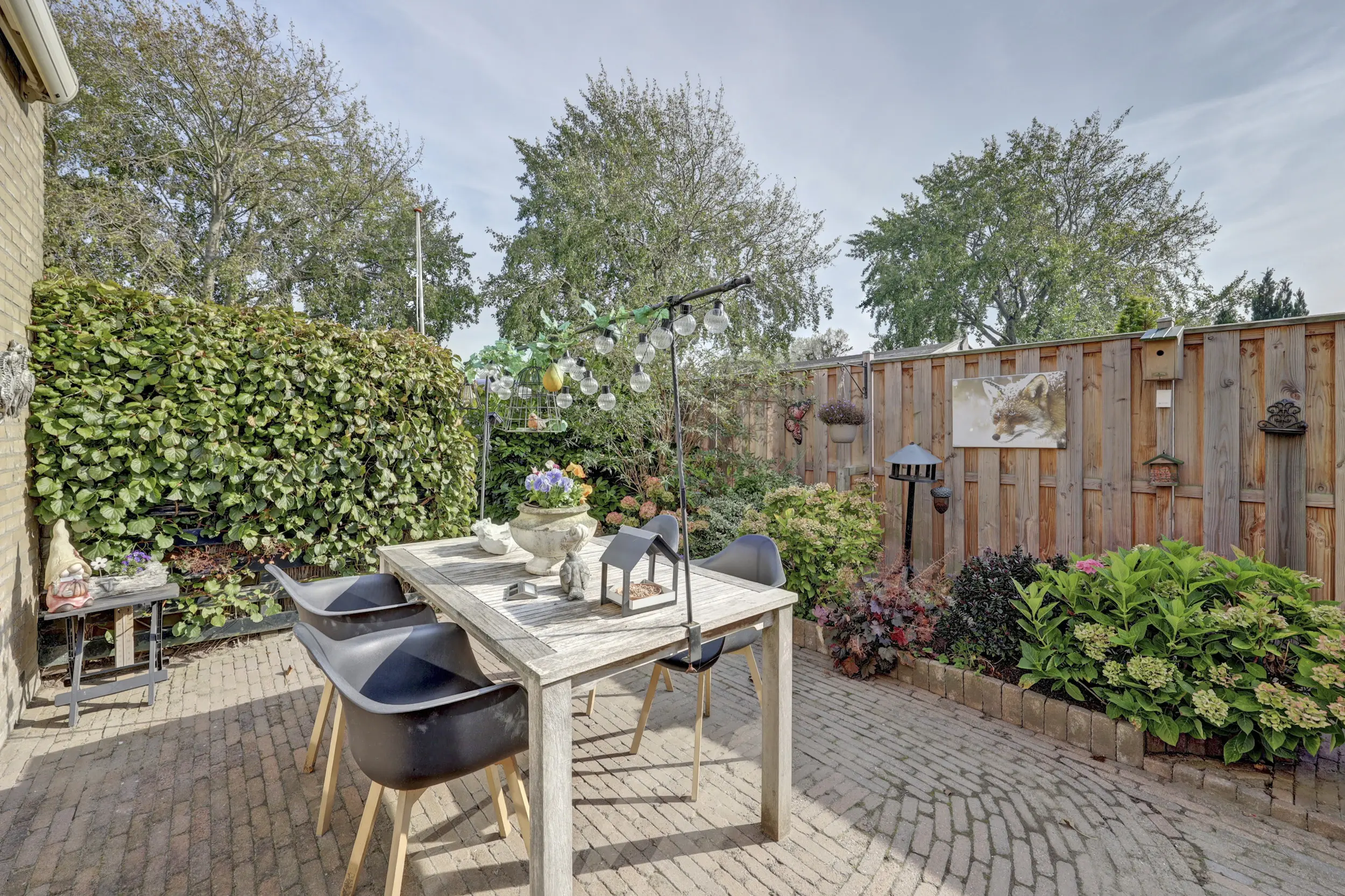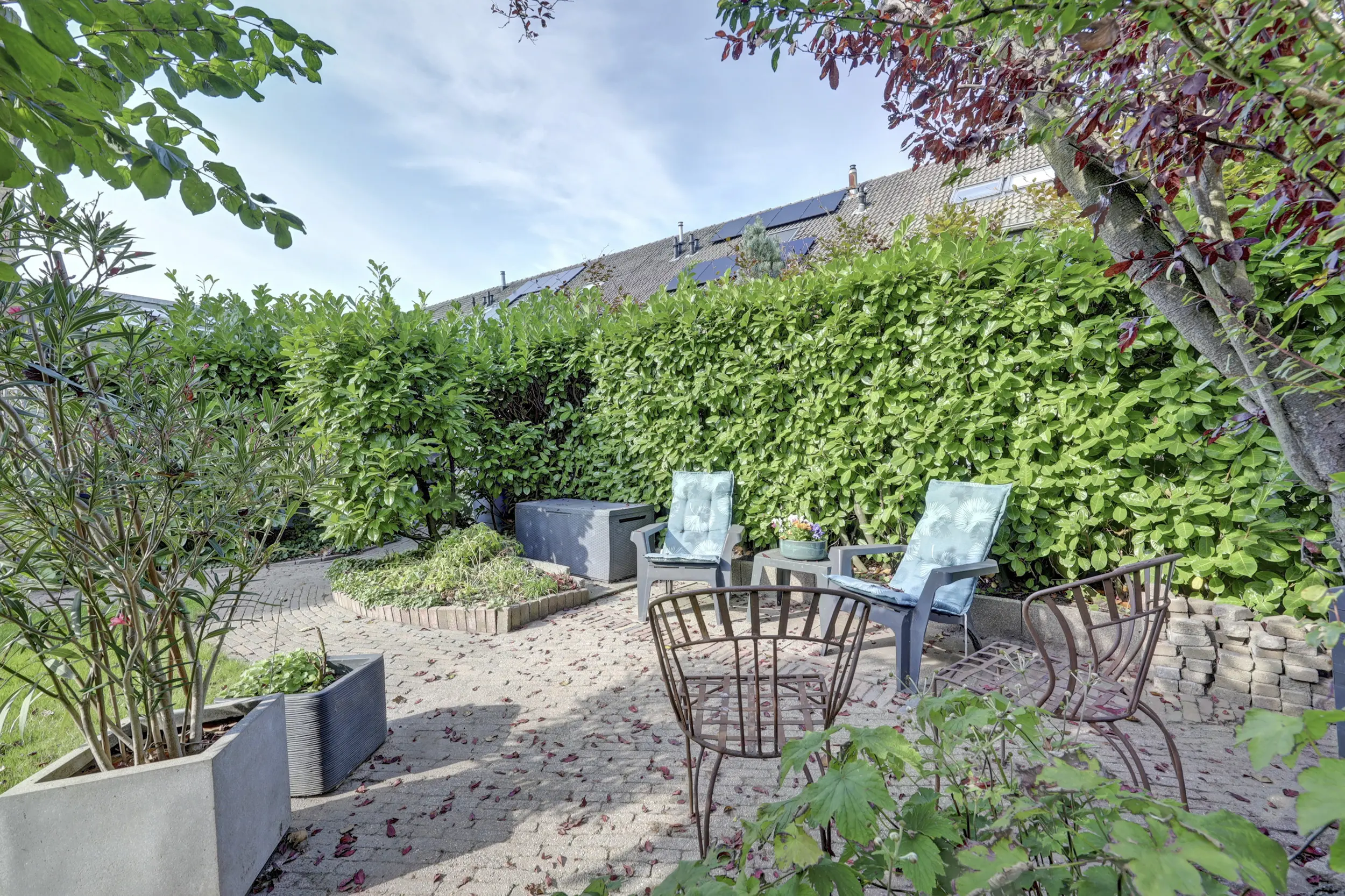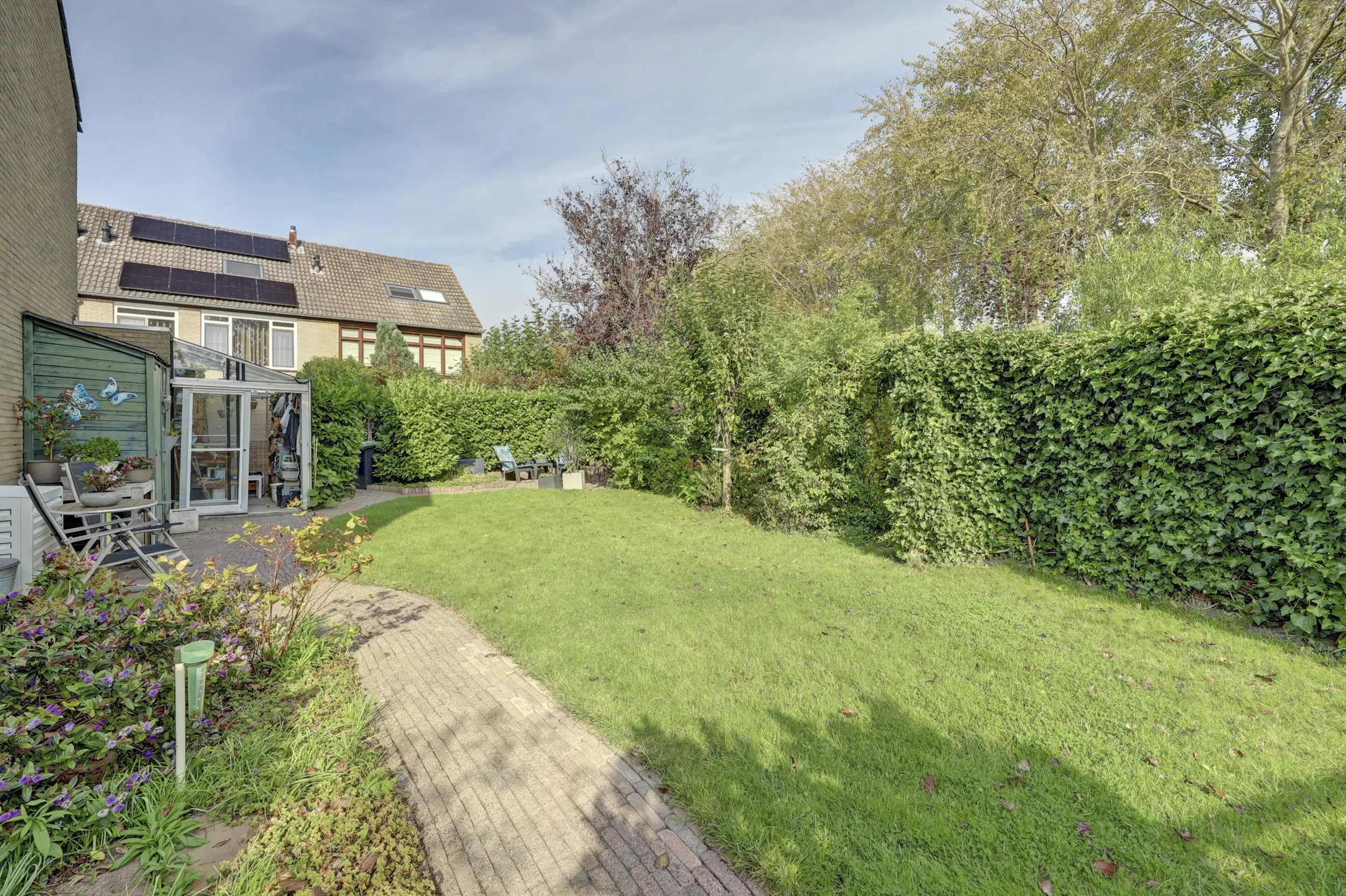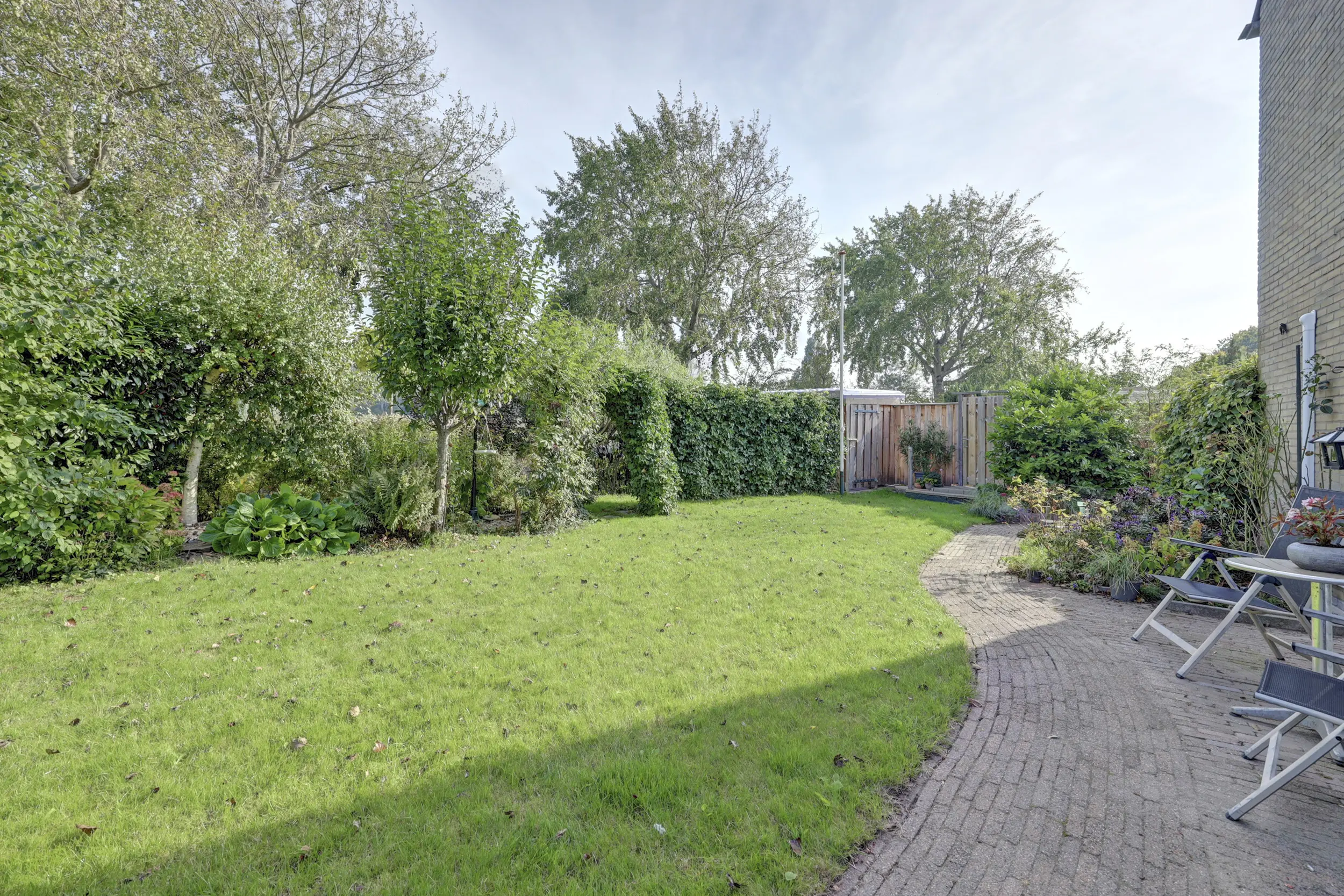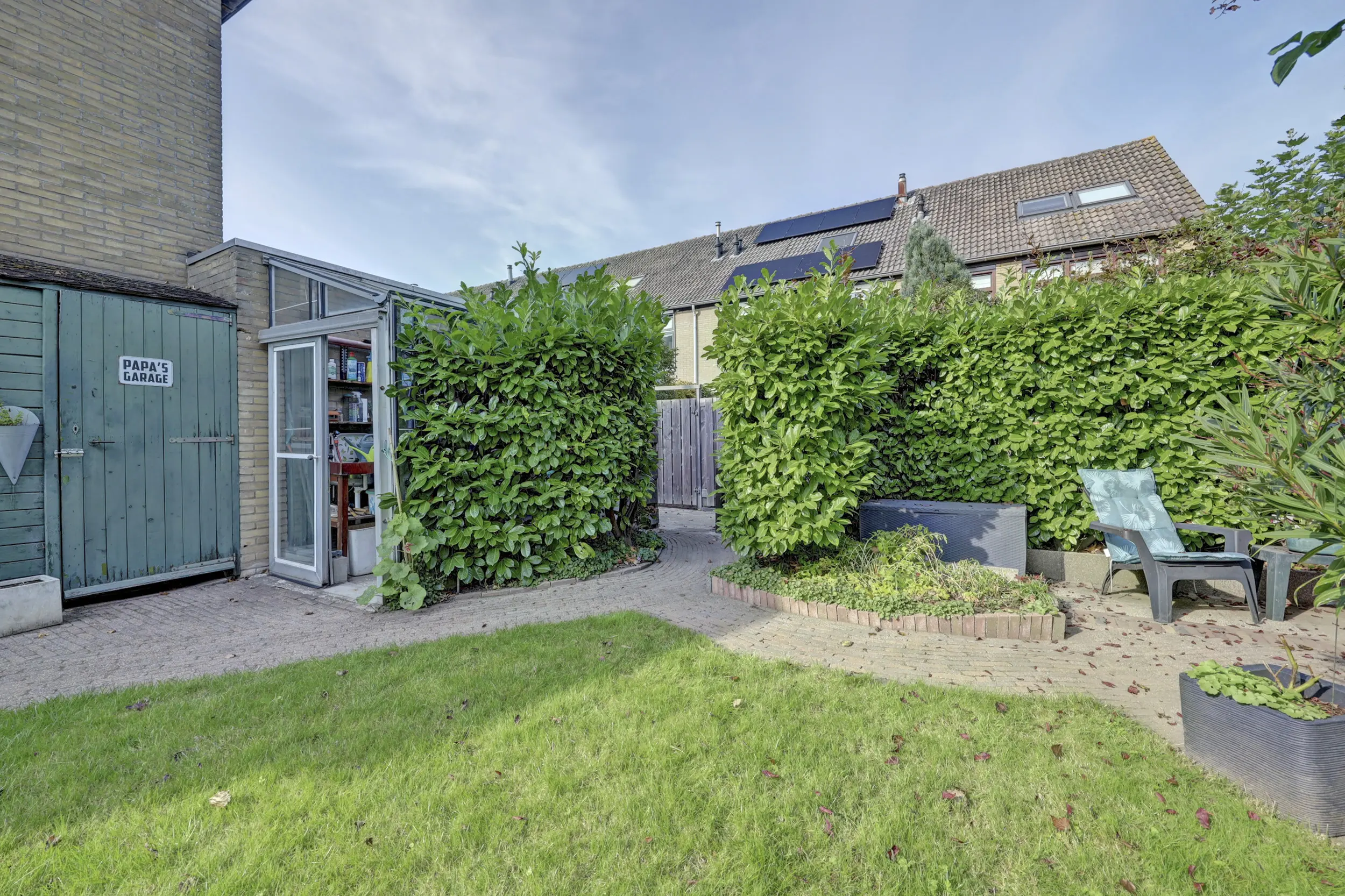 Aan de voorzijde van de woning is de tuin bestraat en is toegang tot de stenen berging. De woonkamer is gelegen aan de achter- en zij-tuin met houten berging, hobbykas, fijne zitjes, gazon en mooie beplanting. De hoofdtuin is zuidoost georiënteerd. Doordat de woning aan de rand van Rockanje is gelegen heb je mooi zicht op de landerijen.