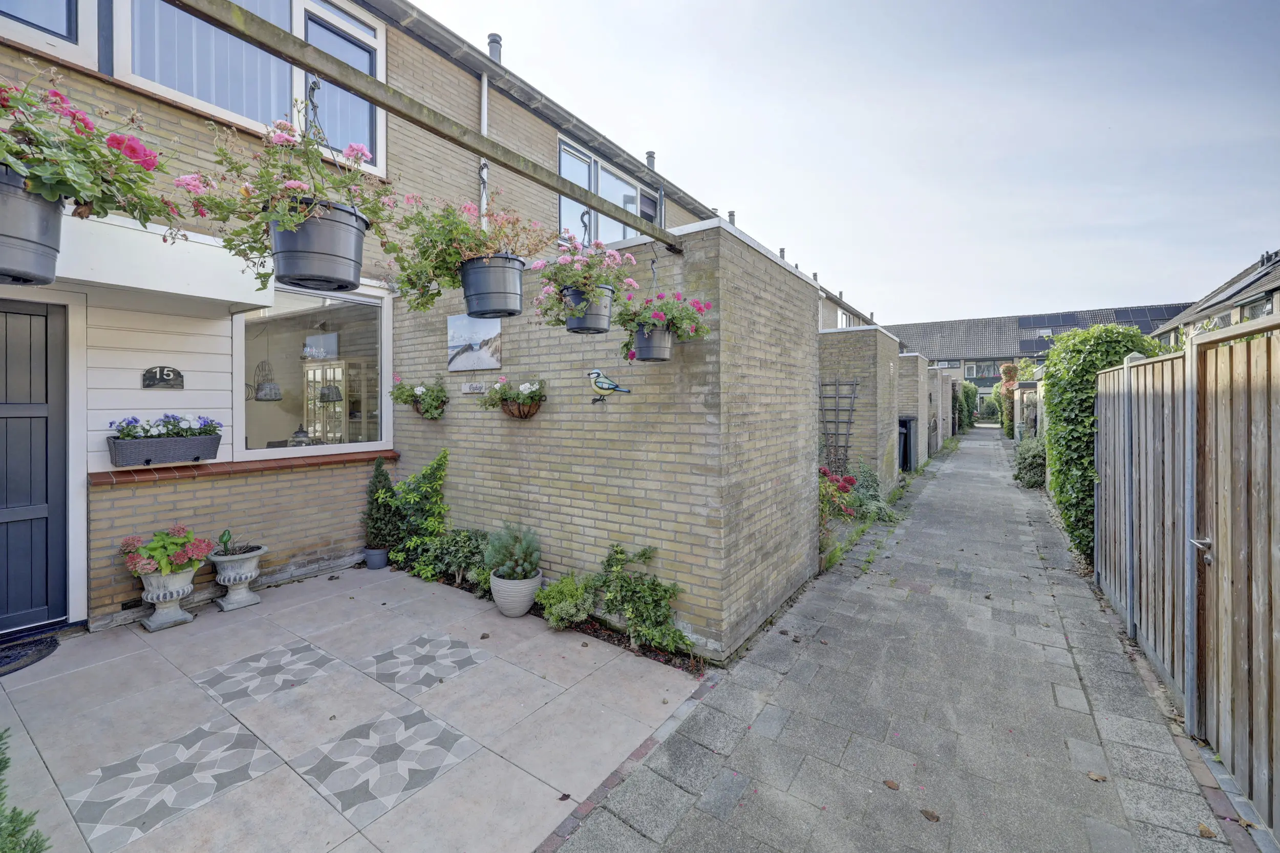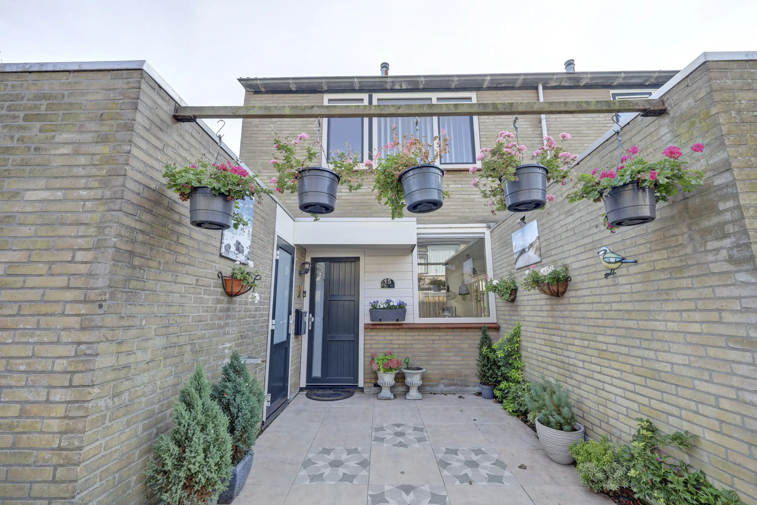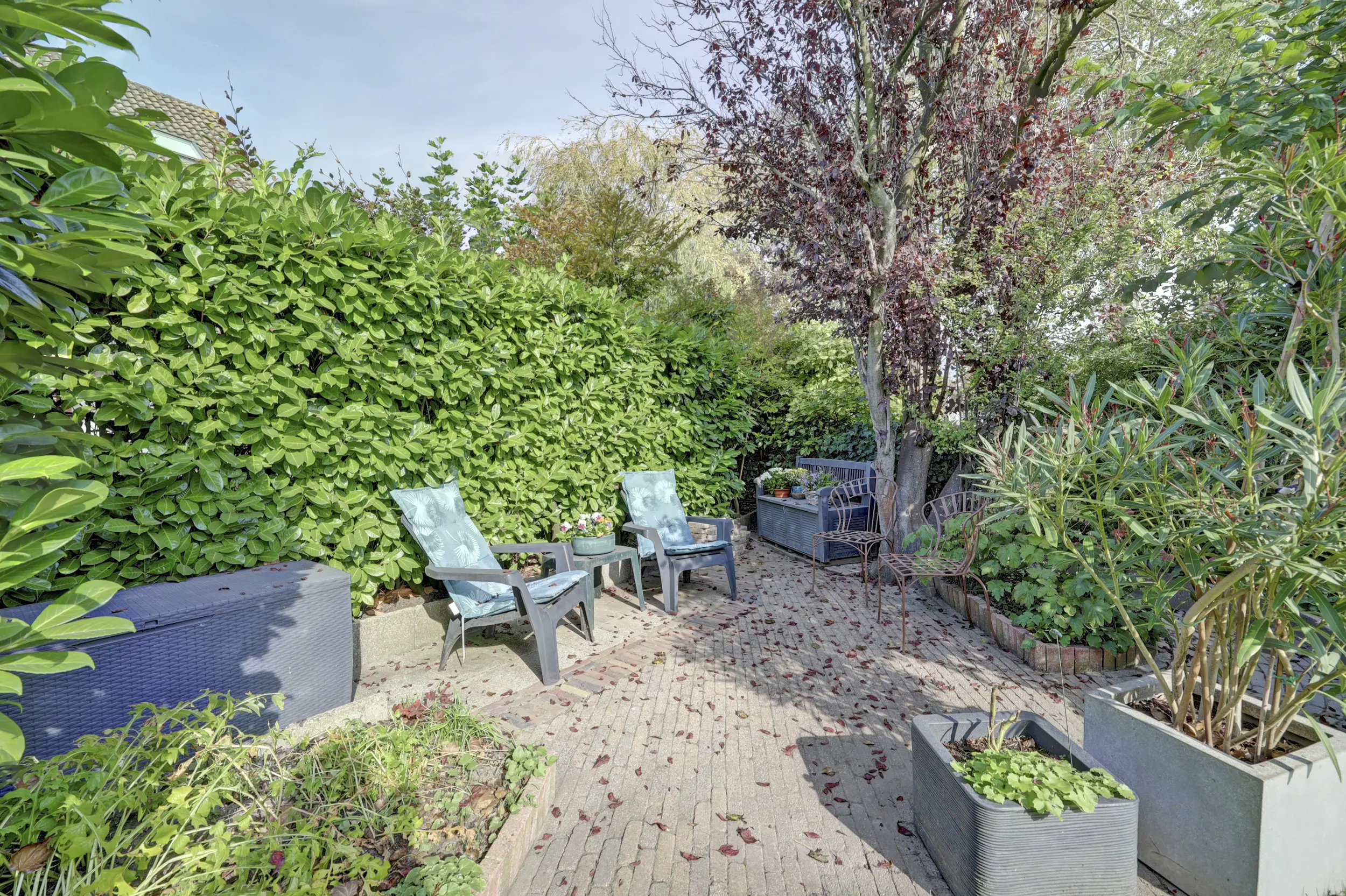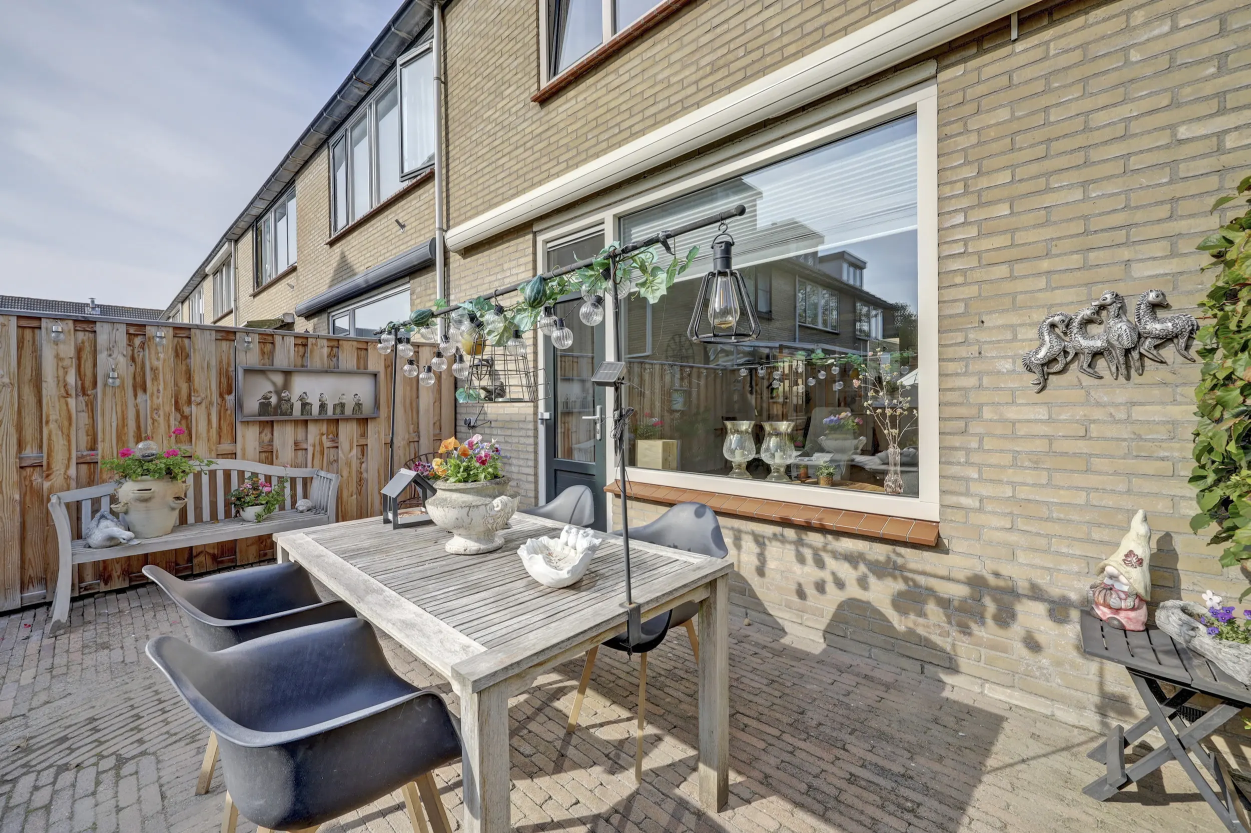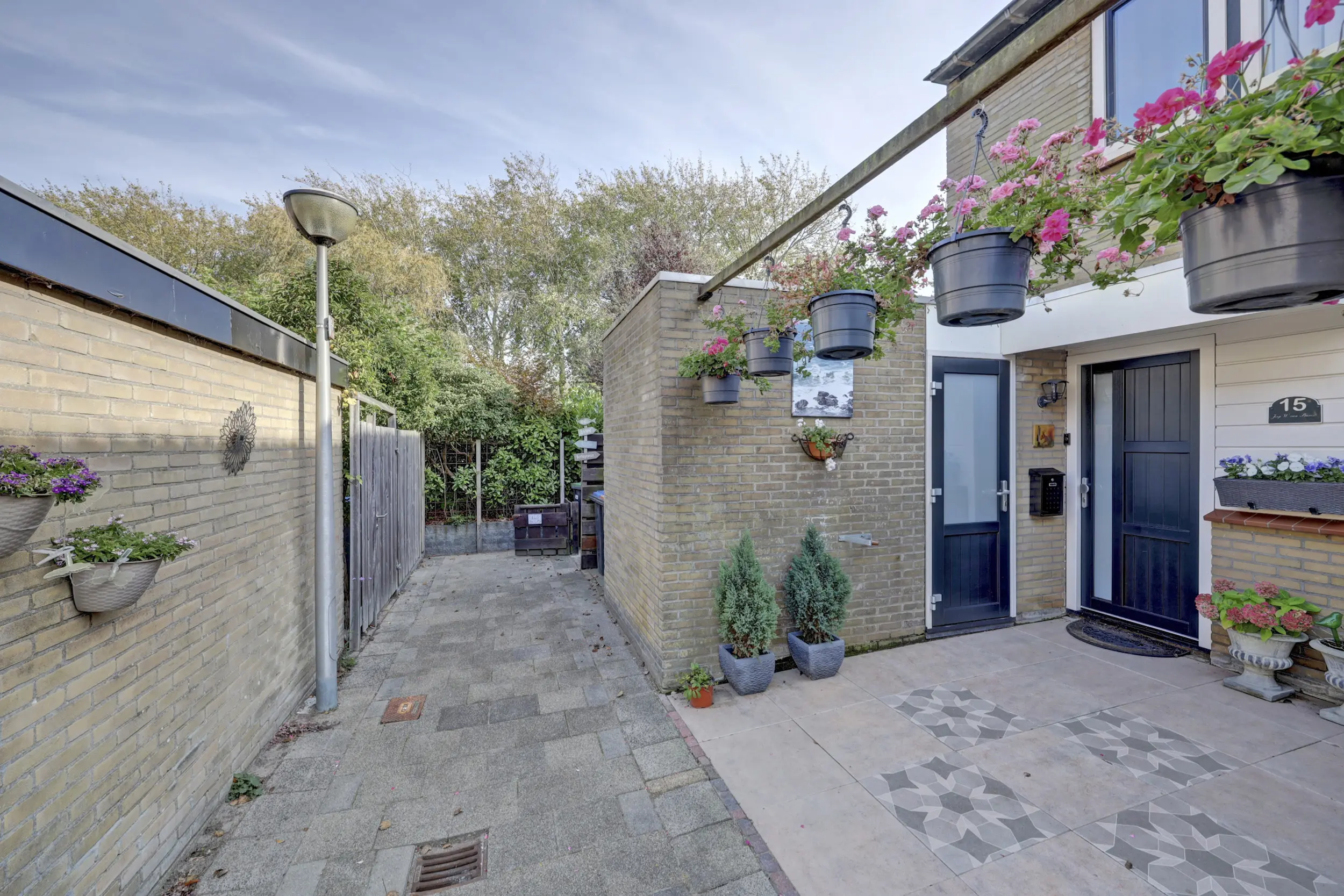 Aan de voorzijde van de woning is de tuin bestraat en is toegang tot de stenen berging. De woonkamer is gelegen aan de achter- en zij-tuin met houten berging, hobbykas, fijne zitjes, gazon en mooie beplanting. De hoofdtuin is zuidoost georiënteerd. Doordat de woning aan de rand van Rockanje is gelegen heb je mooi zicht op de landerijen.