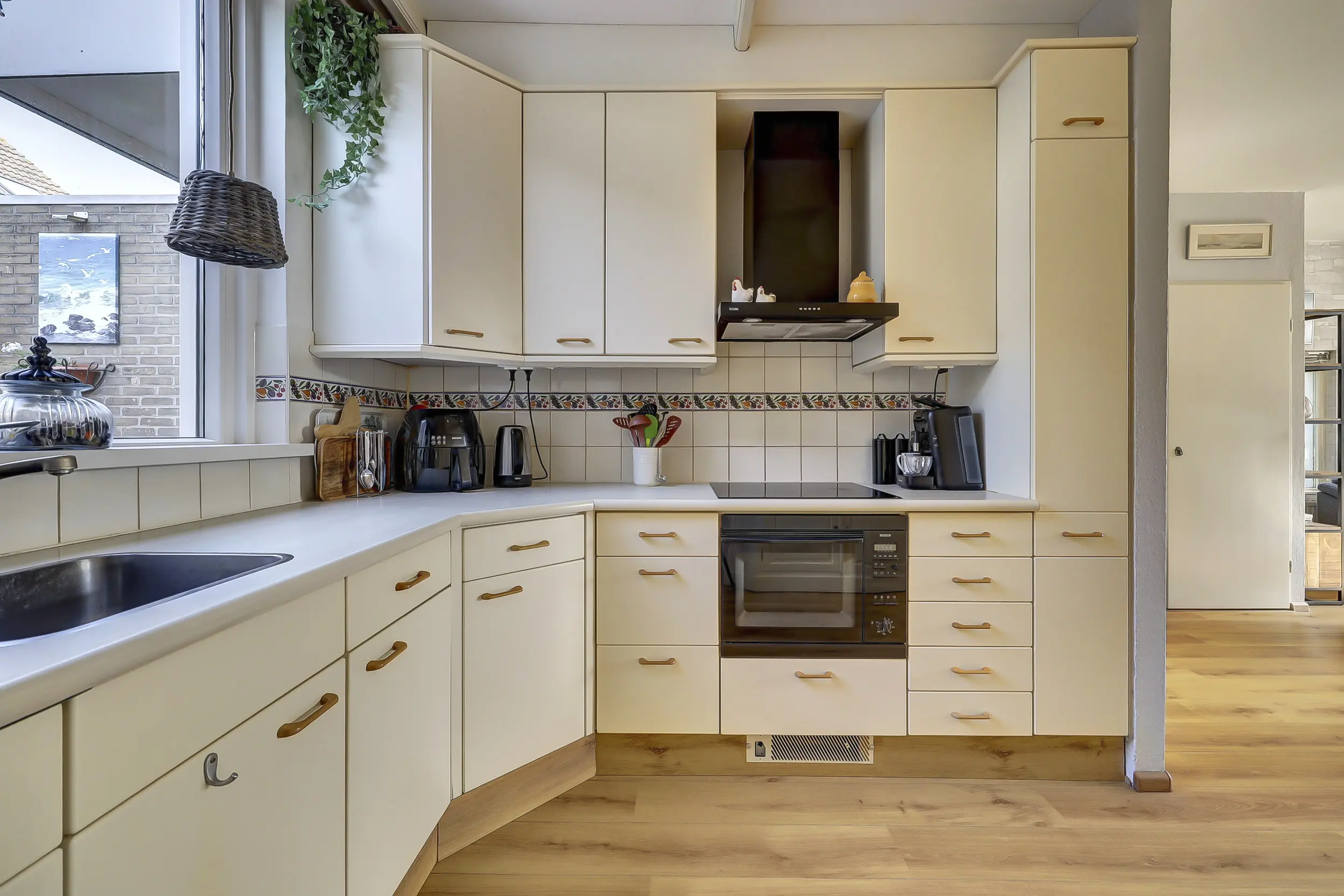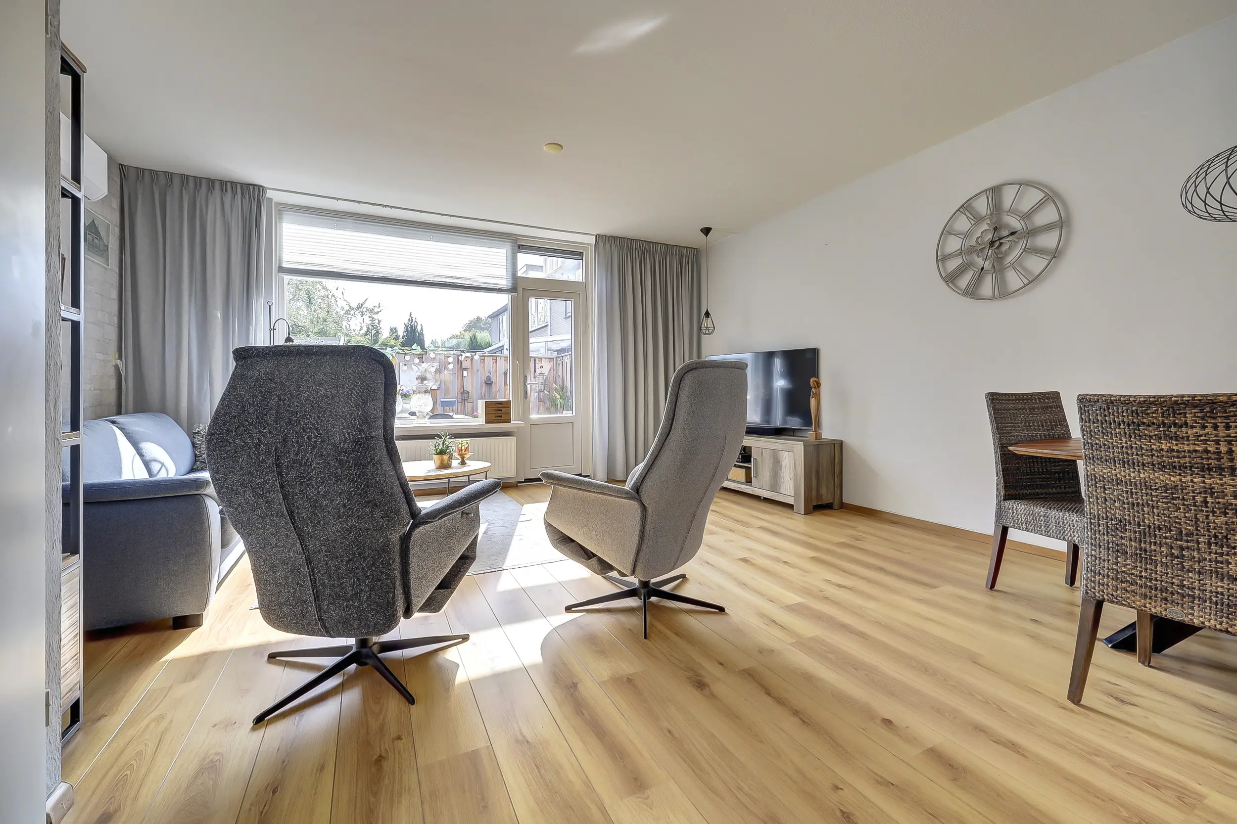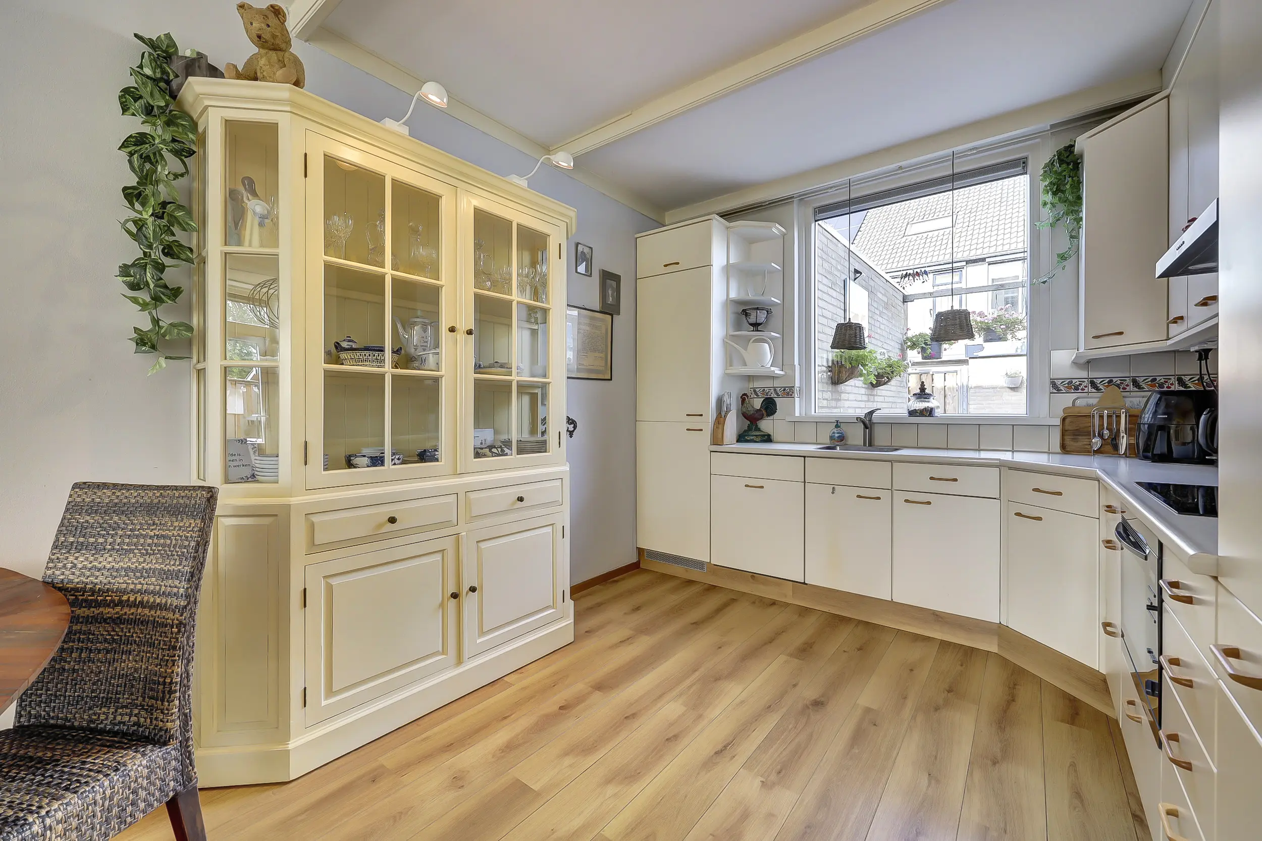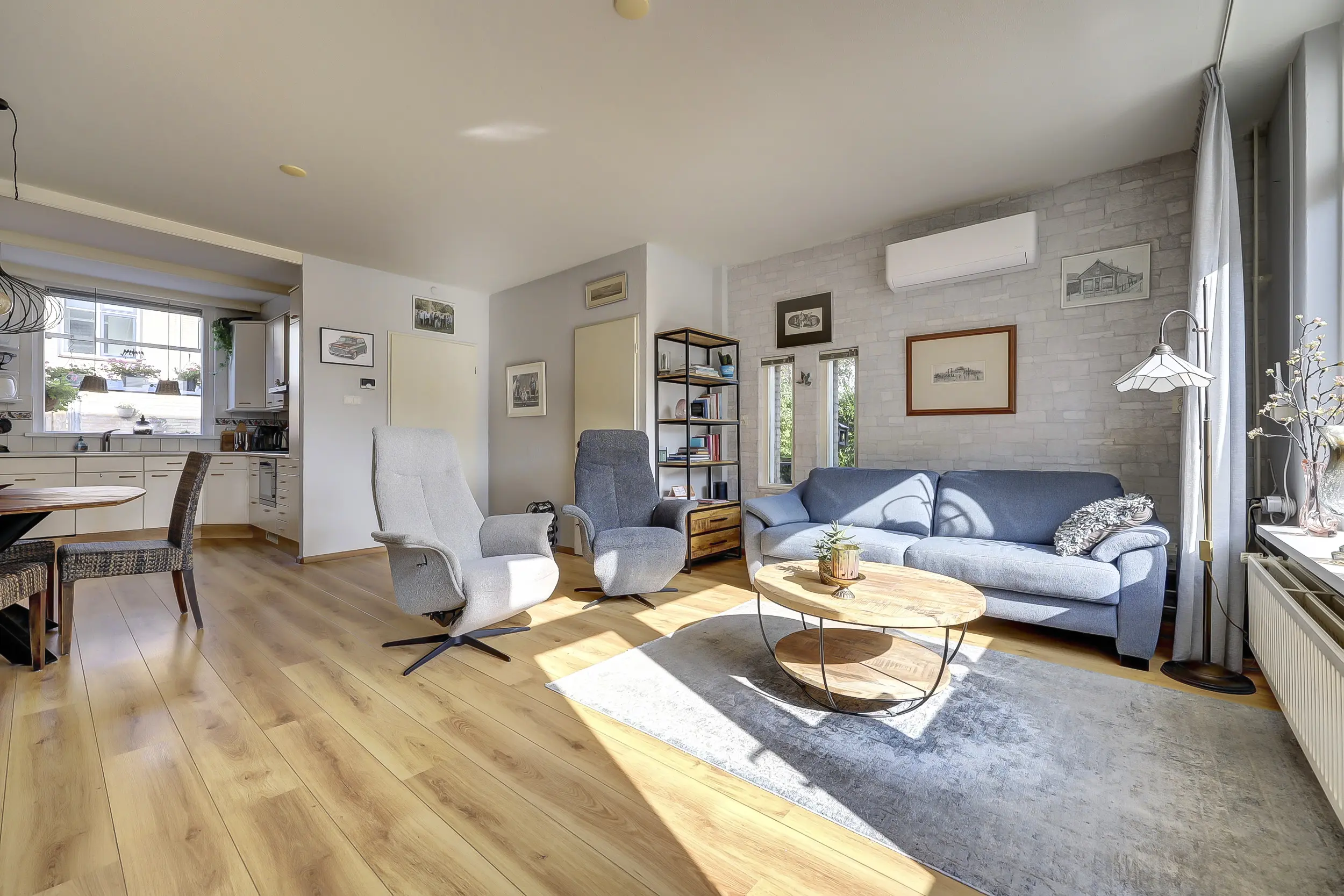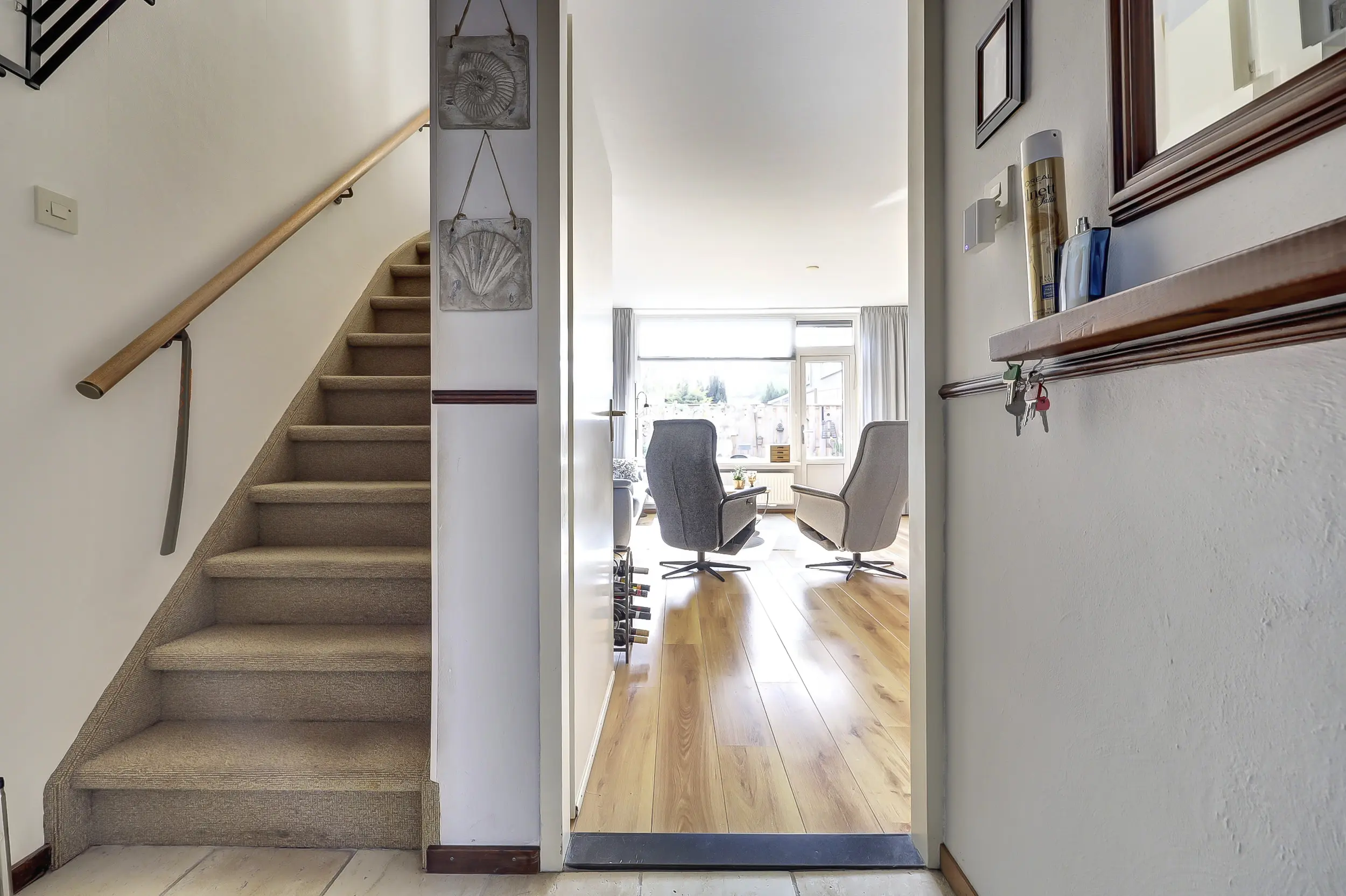 Entree met meterkast en geheel betegelde toiletruimte met handwasbakje. De tuingerichte woonkamer heeft een tuindeur en zijramen. Hierdoor is er veel lichtinval in de woonkamer. Onder de trap is een functionele vaste kast. De airco is fijn om de kamer met warm weer lekker koel te houden. De keuken in hoekopstelling is aan de voorzijde gelegen en is voorzien van inbouwapparatuur zoals inductiekookplaat, combioven, afzuigkap, koelkast, vriezer en vaatwasser. De meeste apparatuur is in 2022 vernieuwd. De woonkamer en keuken zijn voorzien van een laminaat vloer.