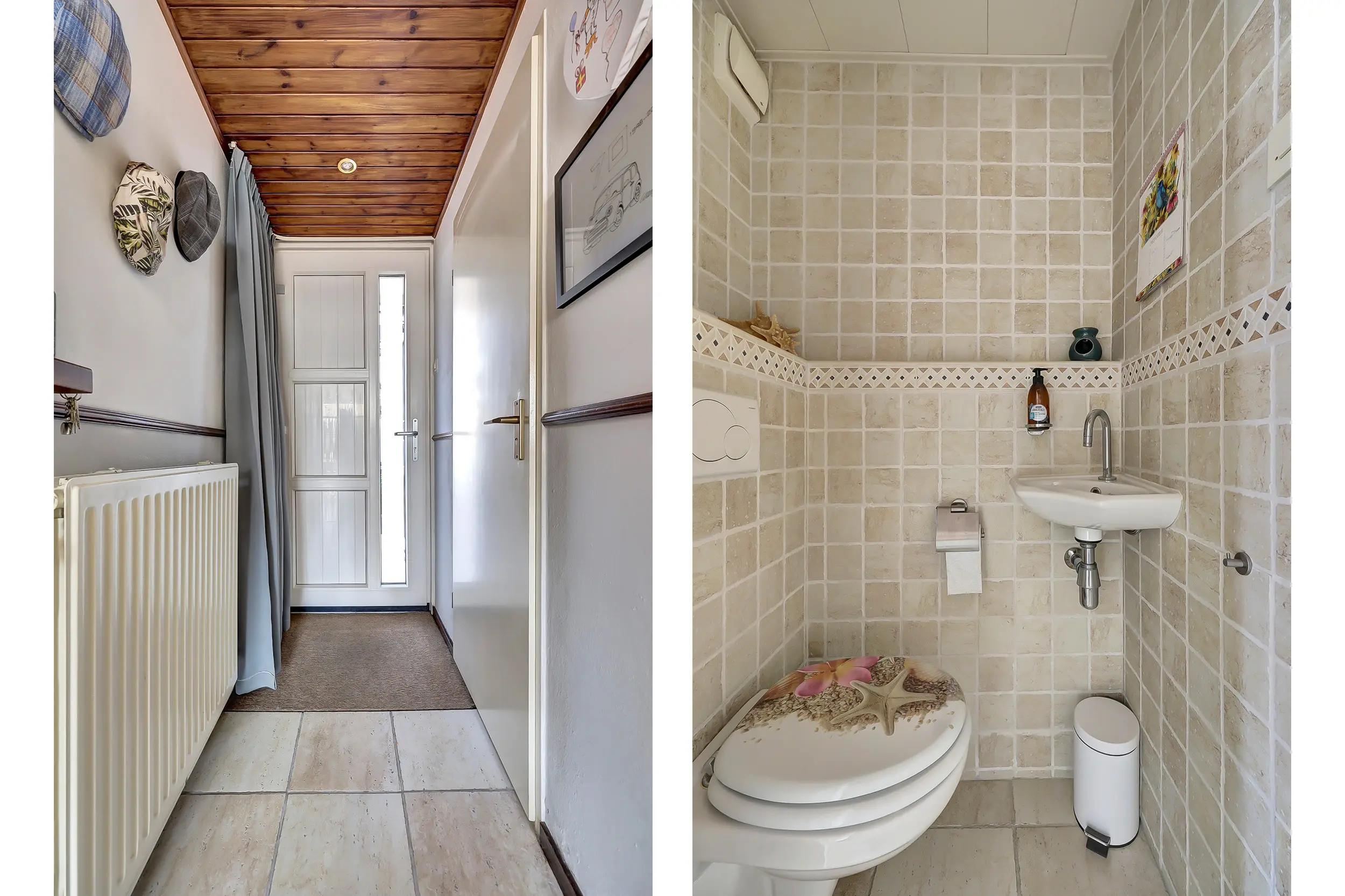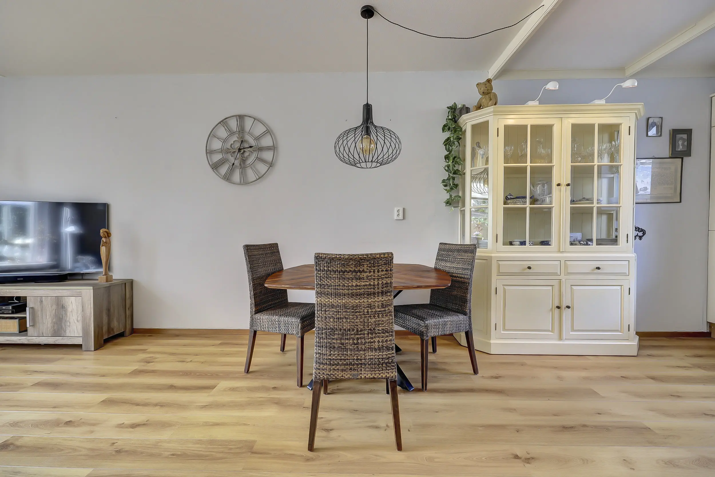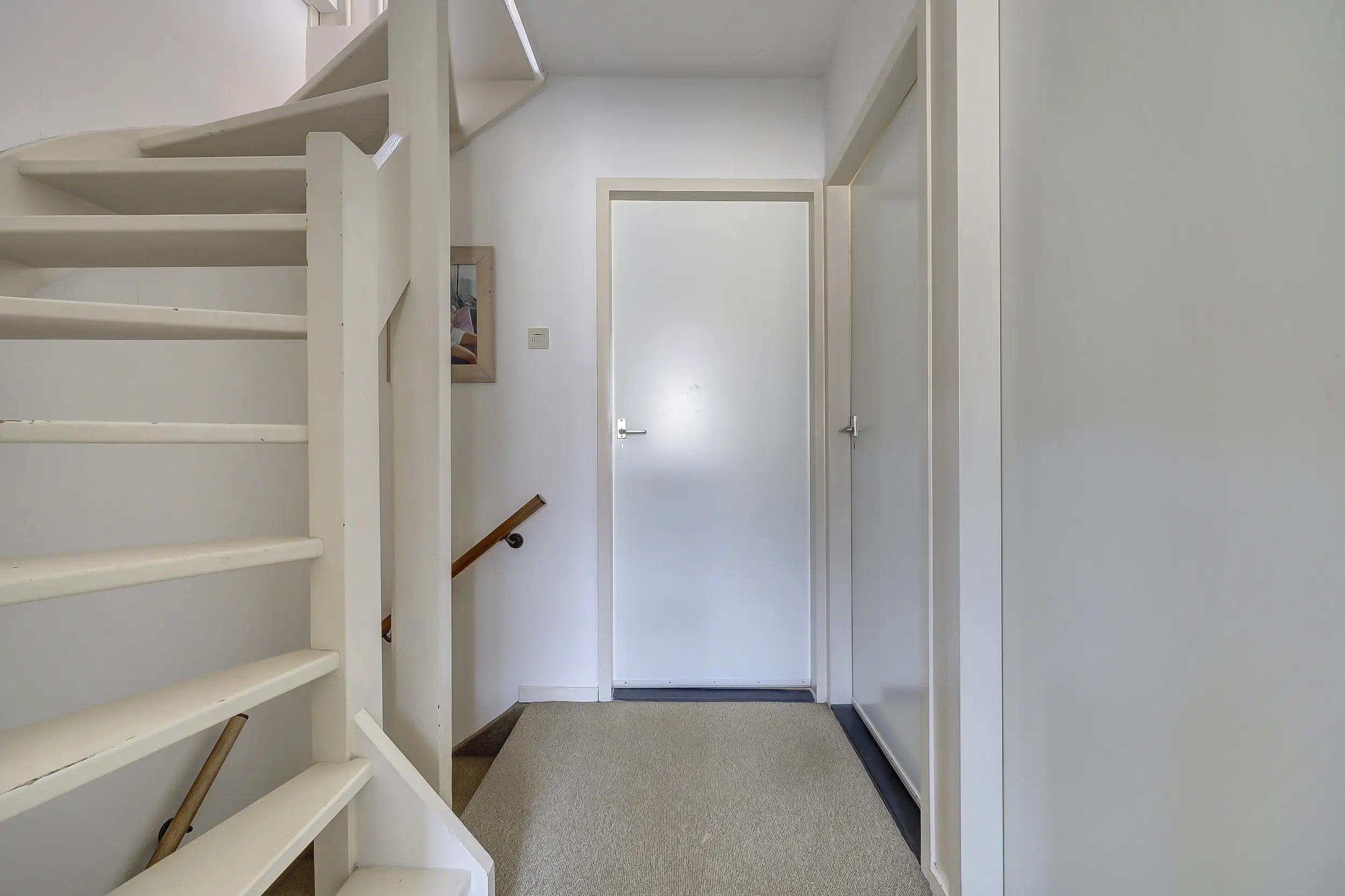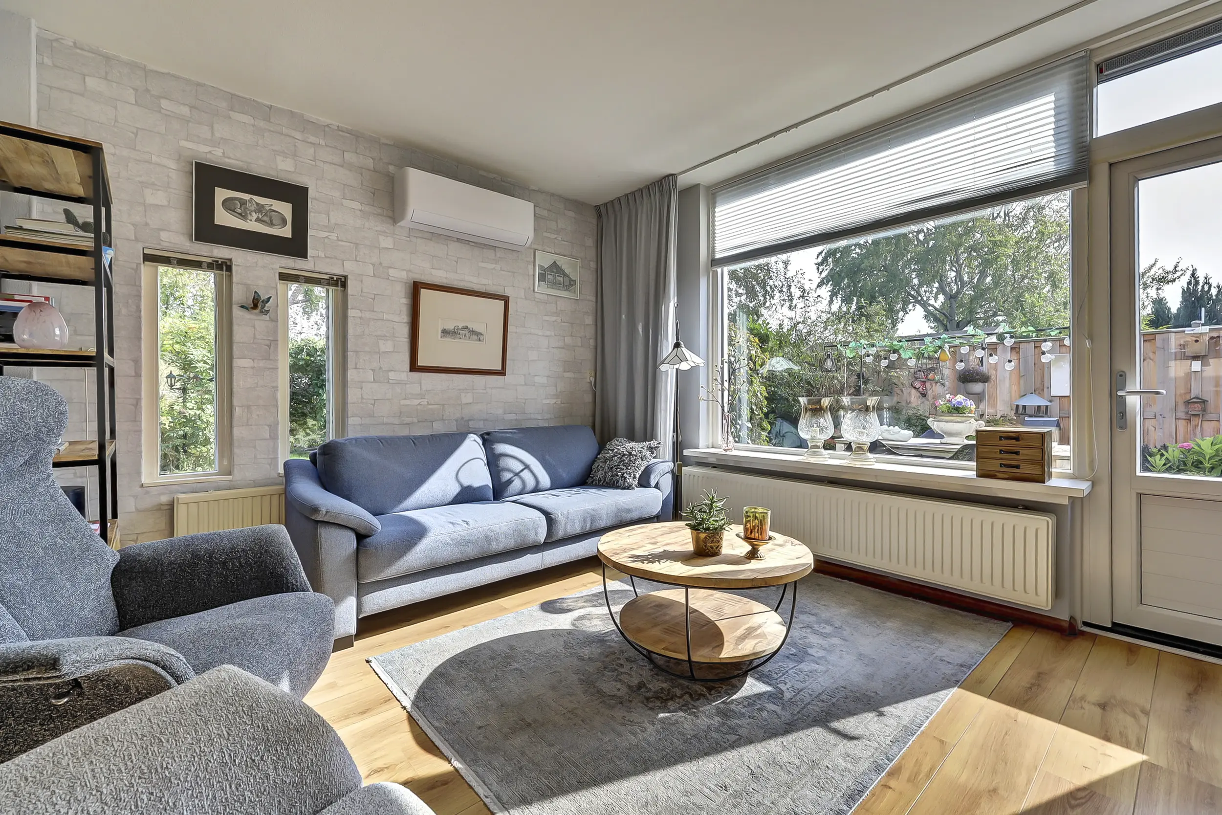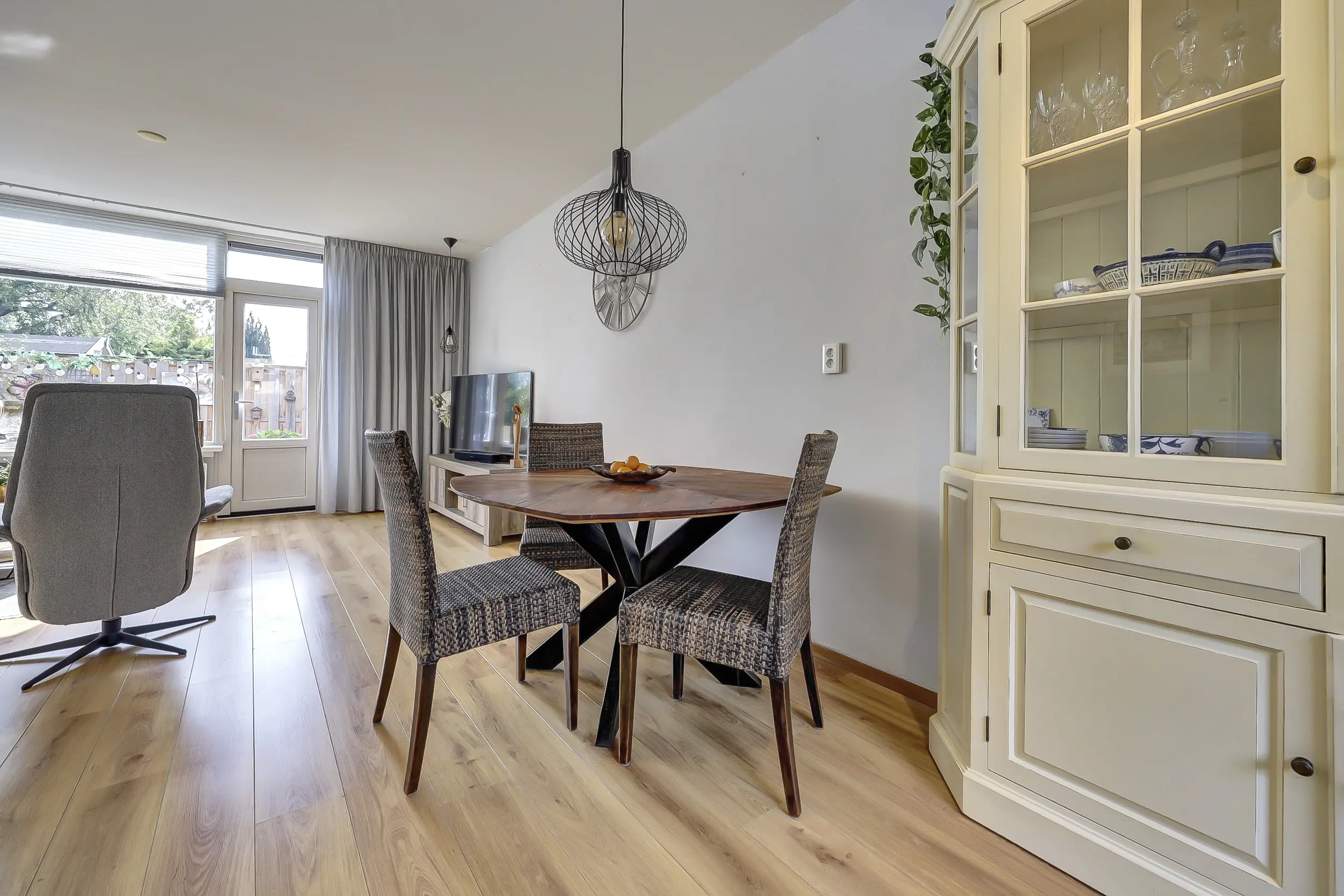 Entree met meterkast en geheel betegelde toiletruimte met handwasbakje. De tuingerichte woonkamer heeft een tuindeur en zijramen. Hierdoor is er veel lichtinval in de woonkamer. Onder de trap is een functionele vaste kast. De airco is fijn om de kamer met warm weer lekker koel te houden. De keuken in hoekopstelling is aan de voorzijde gelegen en is voorzien van inbouwapparatuur zoals inductiekookplaat, combioven, afzuigkap, koelkast, vriezer en vaatwasser. De meeste apparatuur is in 2022 vernieuwd. De woonkamer en keuken zijn voorzien van een laminaat vloer.