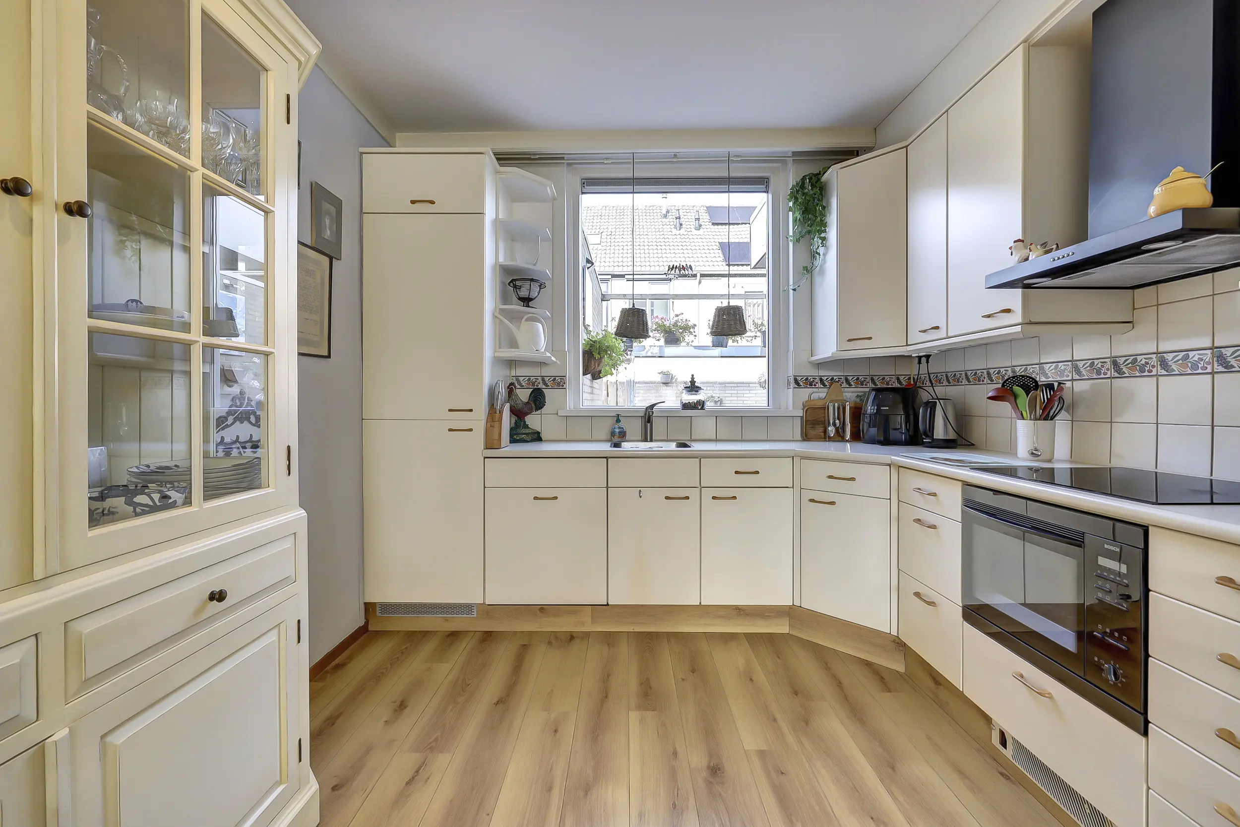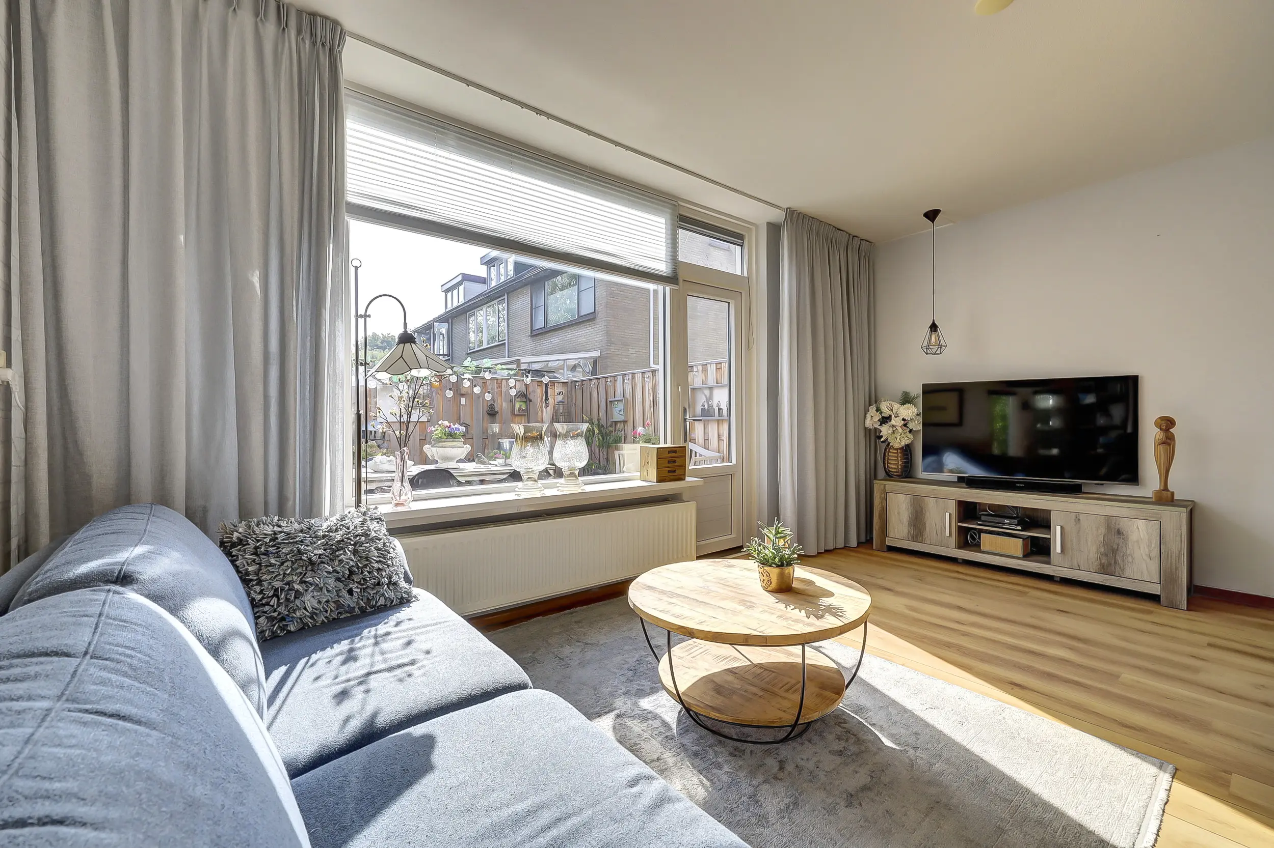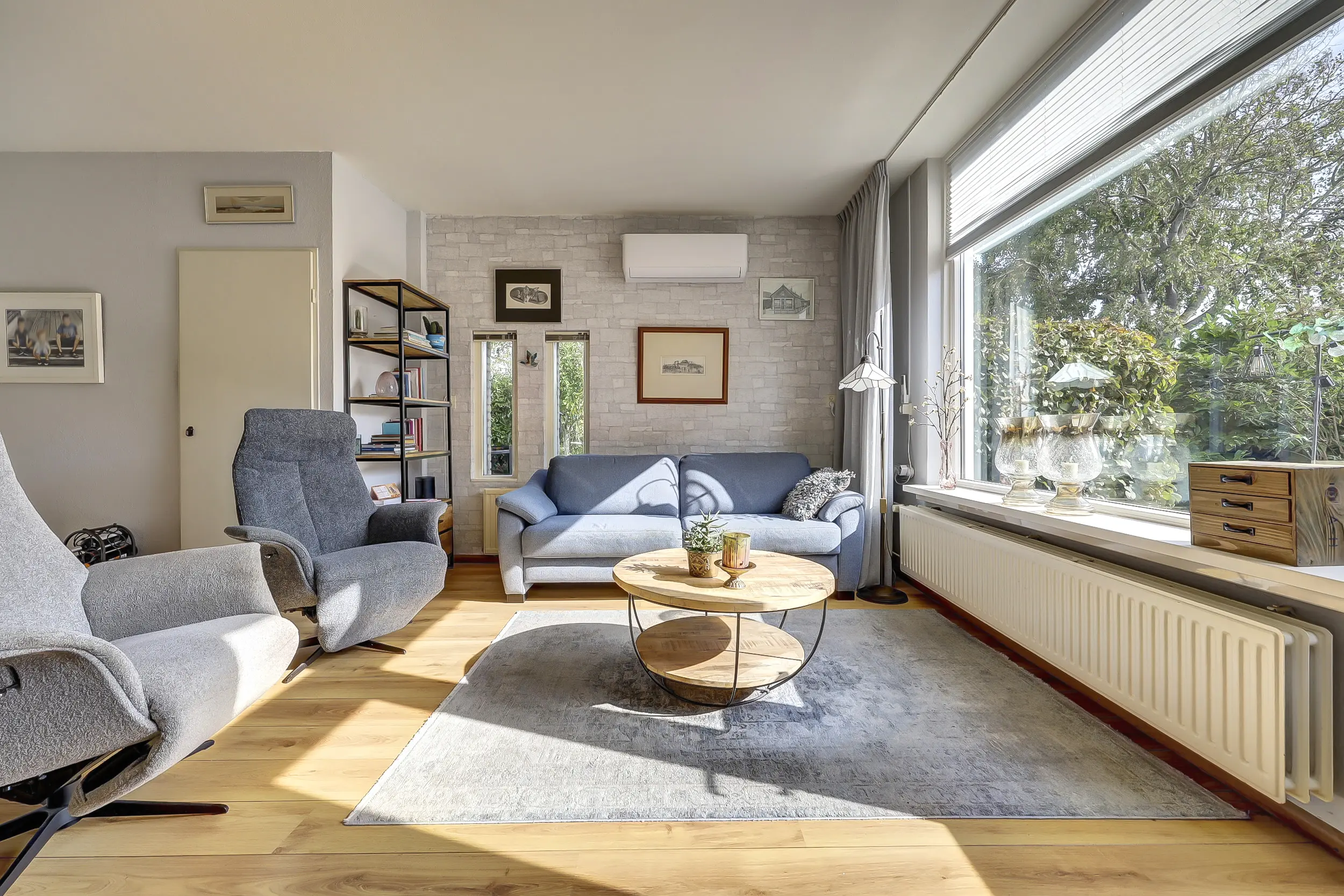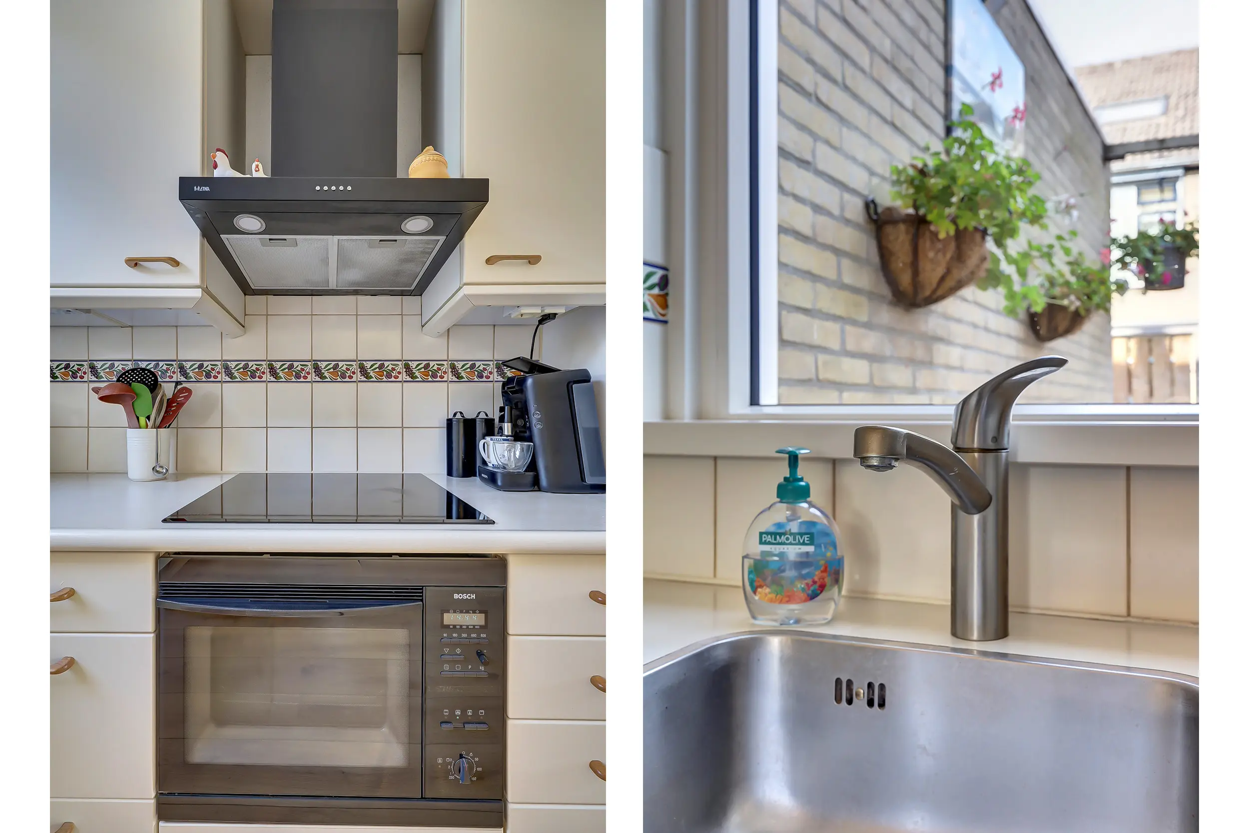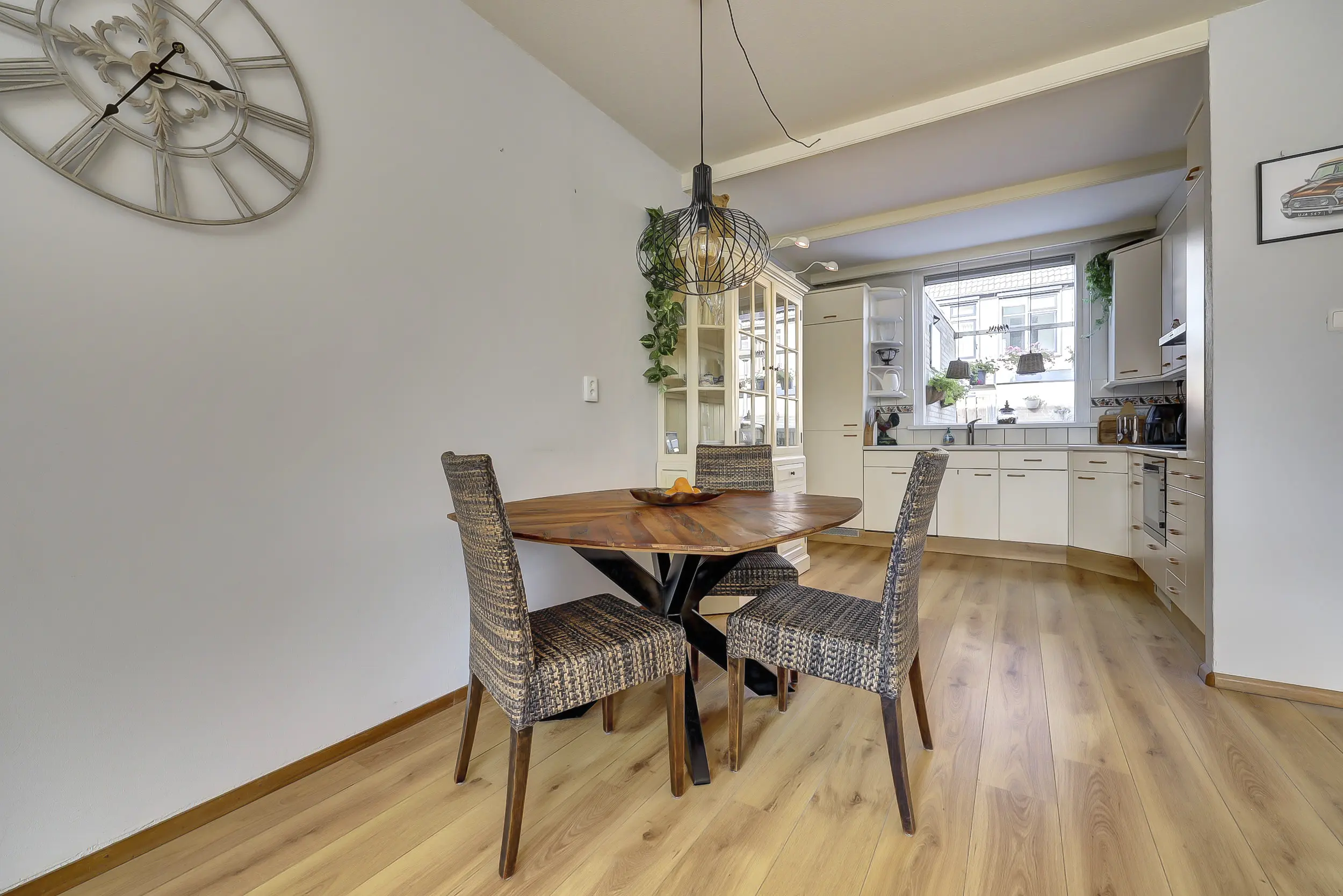 Entree met meterkast en geheel betegelde toiletruimte met handwasbakje. De tuingerichte woonkamer heeft een tuindeur en zijramen. Hierdoor is er veel lichtinval in de woonkamer. Onder de trap is een functionele vaste kast. De airco is fijn om de kamer met warm weer lekker koel te houden. De keuken in hoekopstelling is aan de voorzijde gelegen en is voorzien van inbouwapparatuur zoals inductiekookplaat, combioven, afzuigkap, koelkast, vriezer en vaatwasser. De meeste apparatuur is in 2022 vernieuwd. De woonkamer en keuken zijn voorzien van een laminaat vloer.