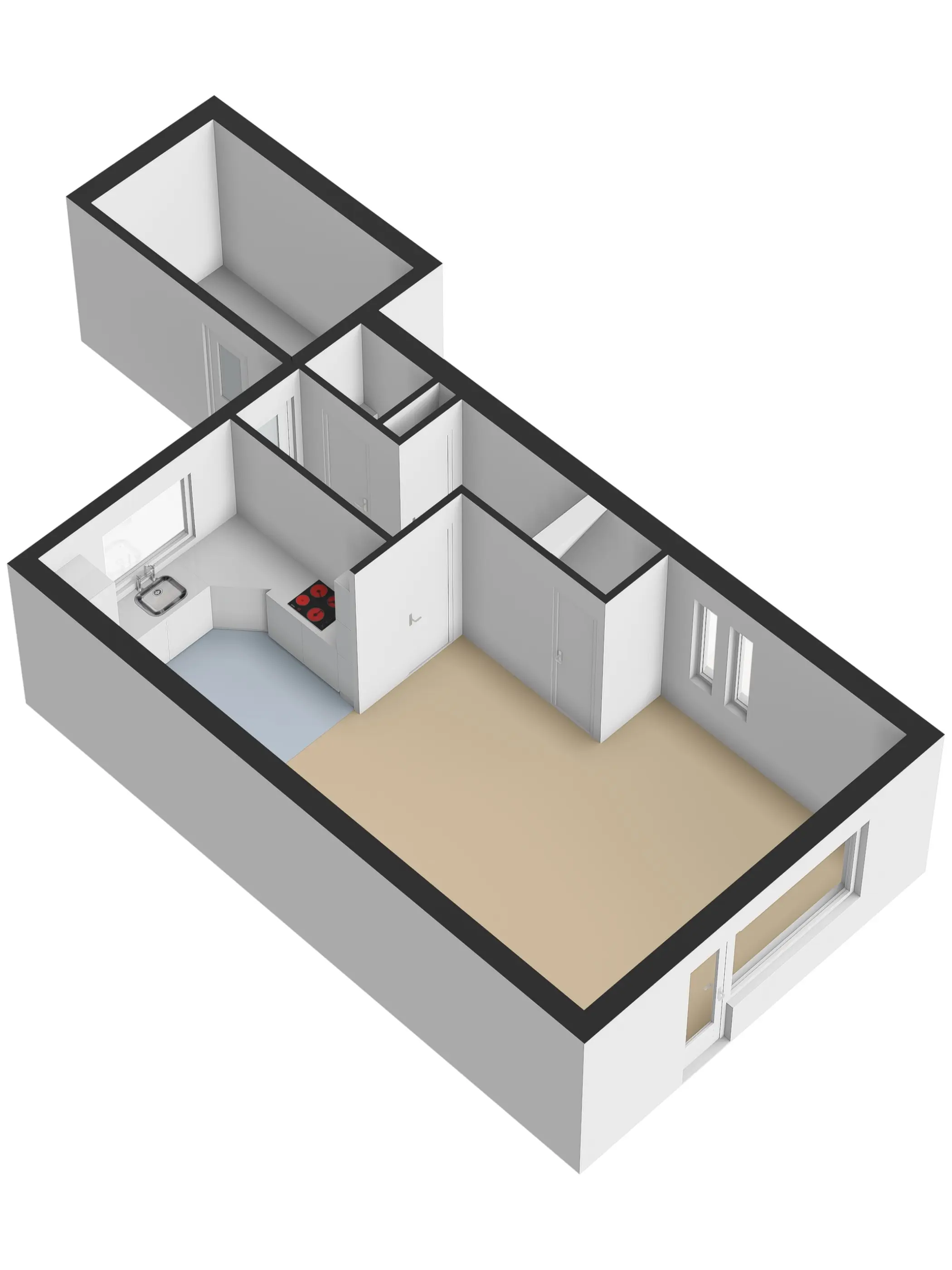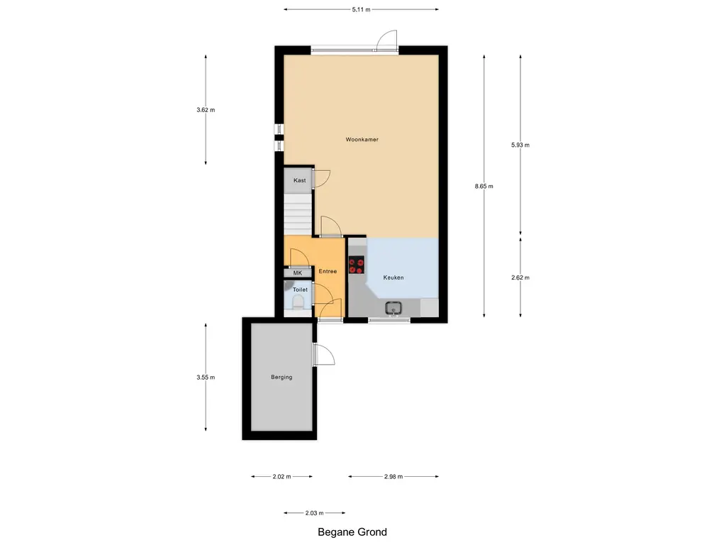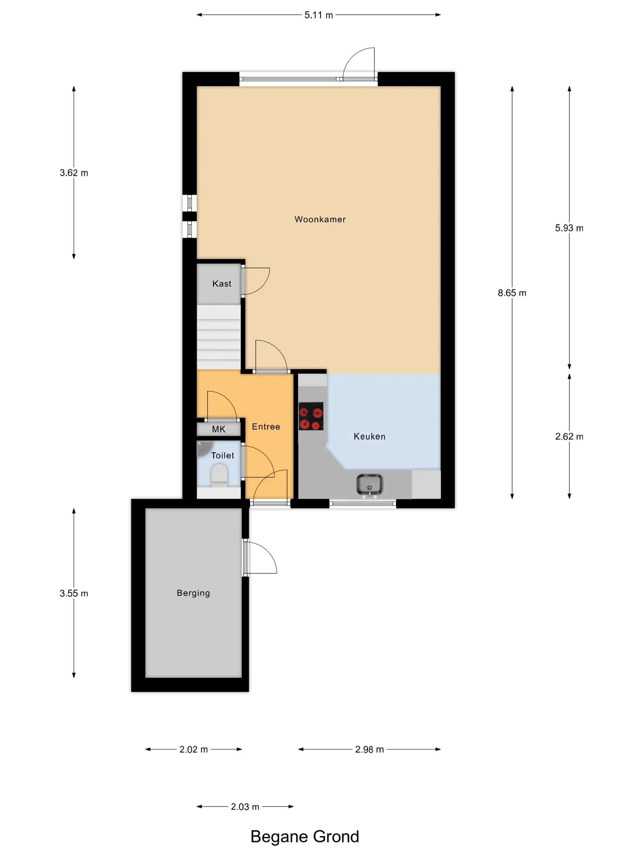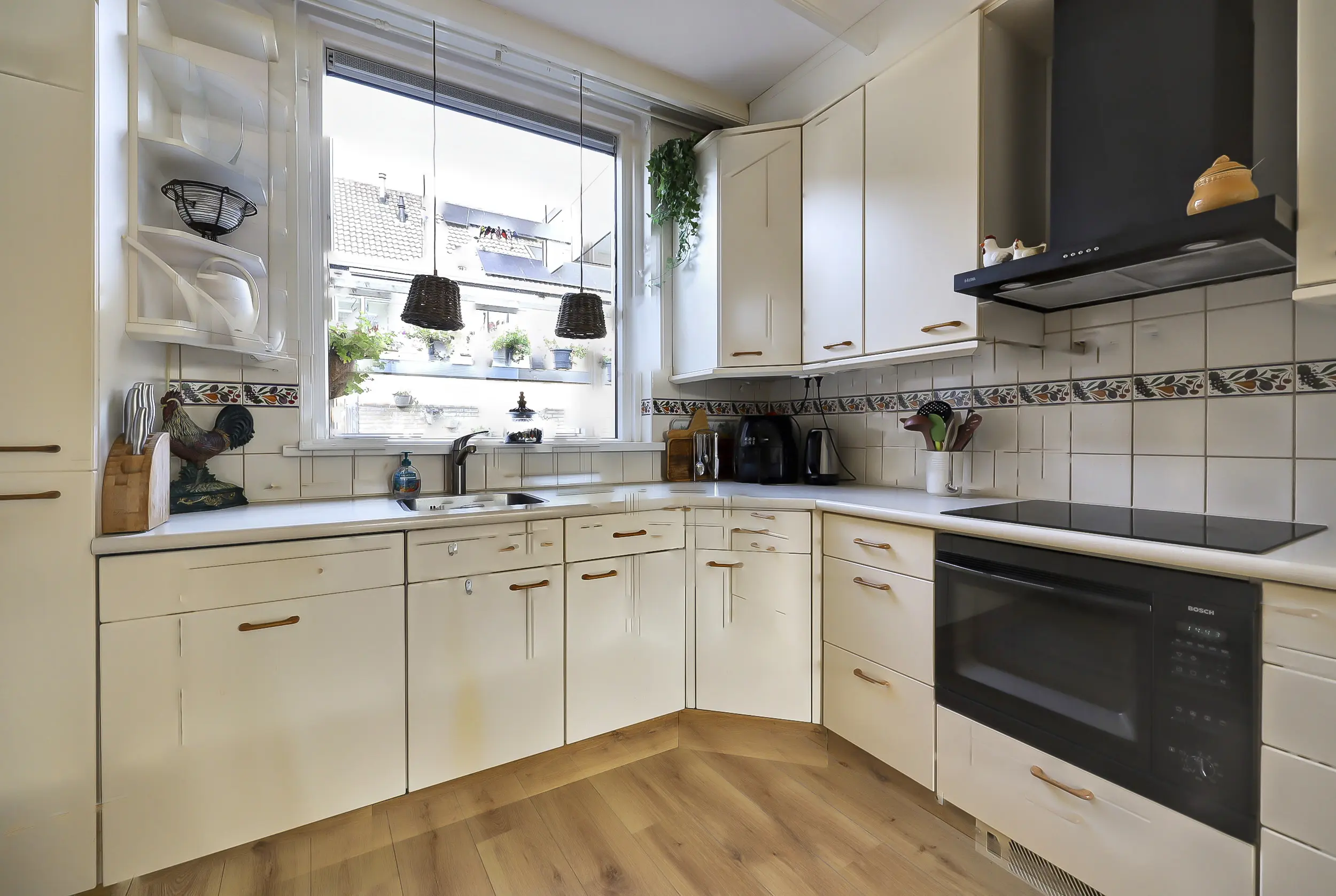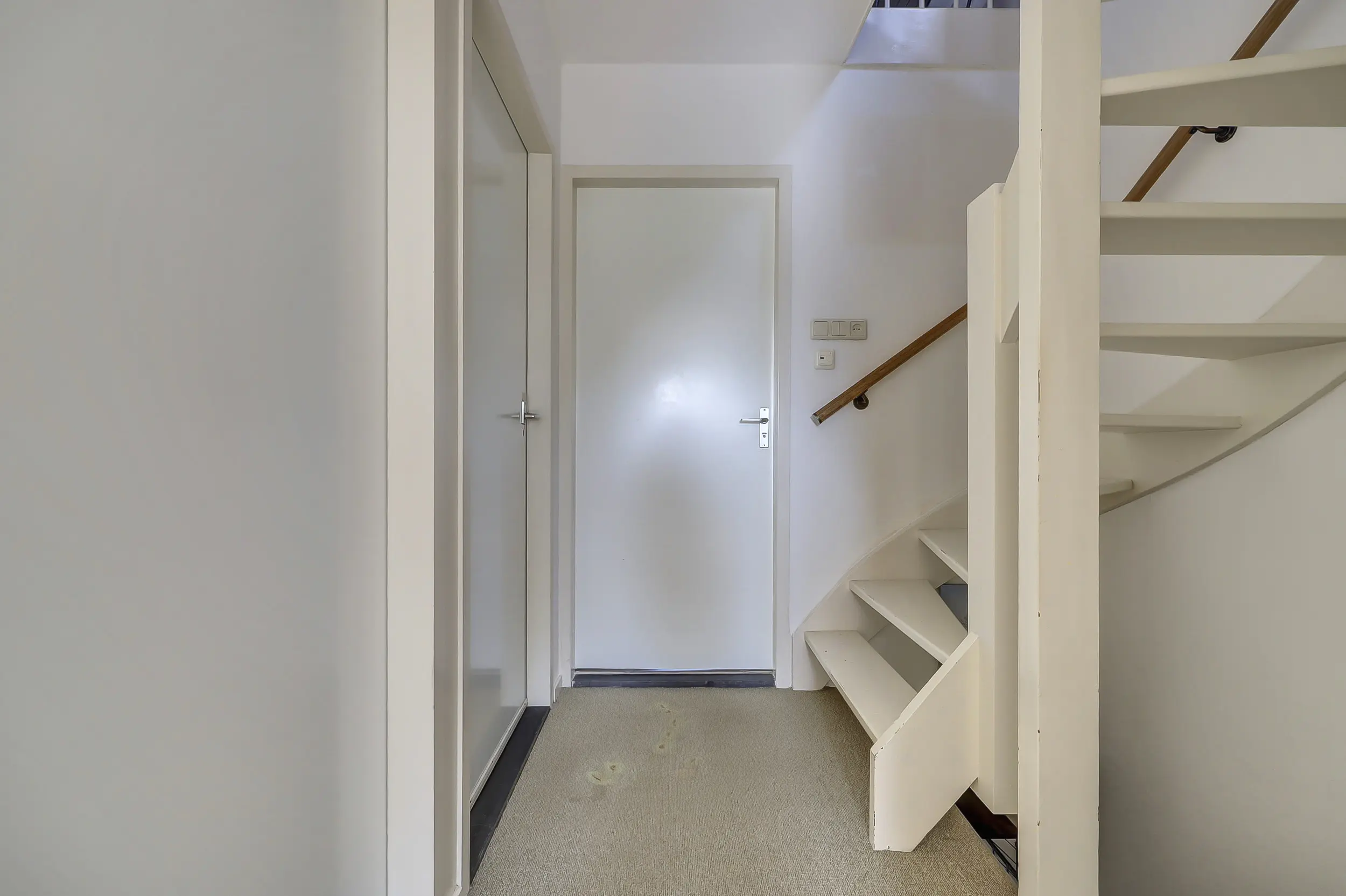 Entree met meterkast en geheel betegelde toiletruimte met handwasbakje. De tuingerichte woonkamer heeft een tuindeur en zijramen. Hierdoor is er veel lichtinval in de woonkamer. Onder de trap is een functionele vaste kast. De airco is fijn om de kamer met warm weer lekker koel te houden. De keuken in hoekopstelling is aan de voorzijde gelegen en is voorzien van inbouwapparatuur zoals inductiekookplaat, combioven, afzuigkap, koelkast, vriezer en vaatwasser. De meeste apparatuur is in 2022 vernieuwd. De woonkamer en keuken zijn voorzien van een laminaat vloer.