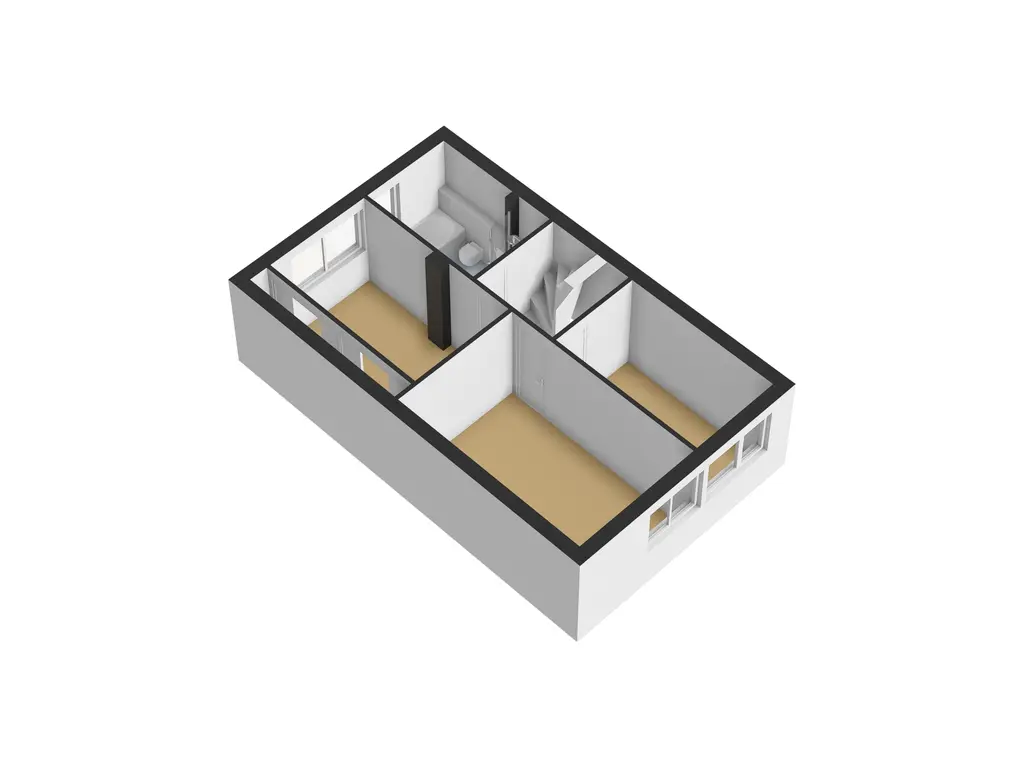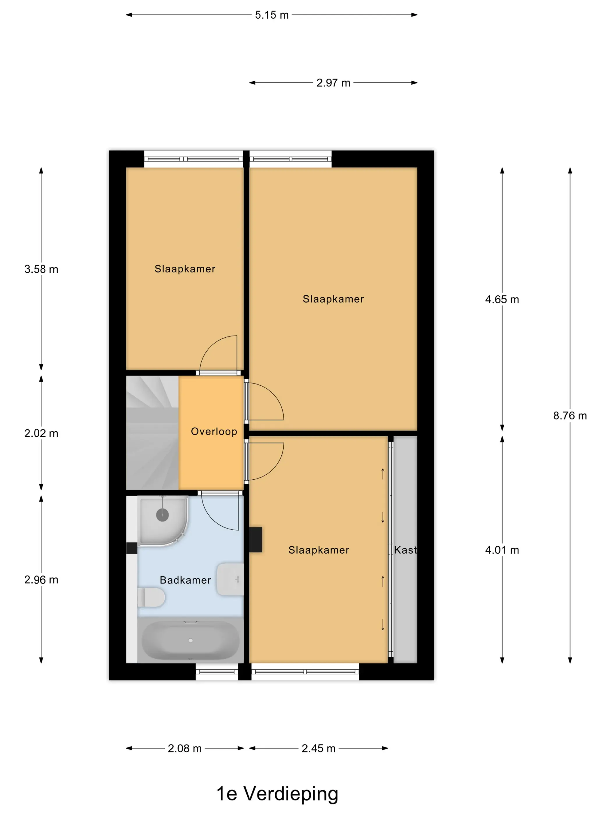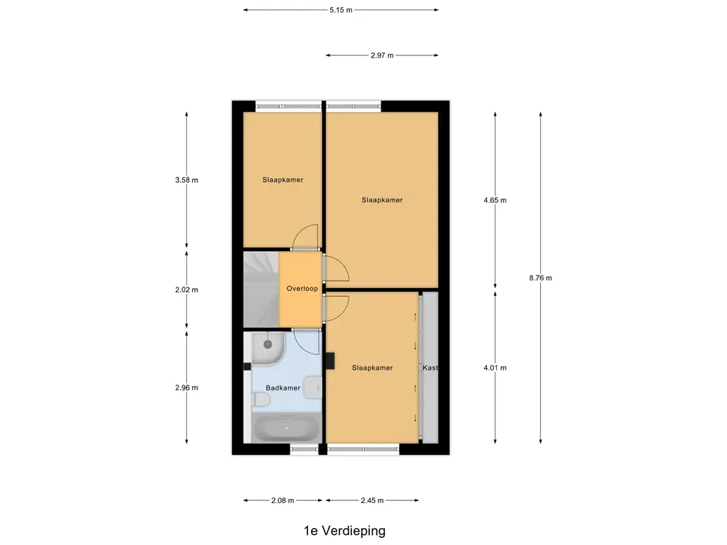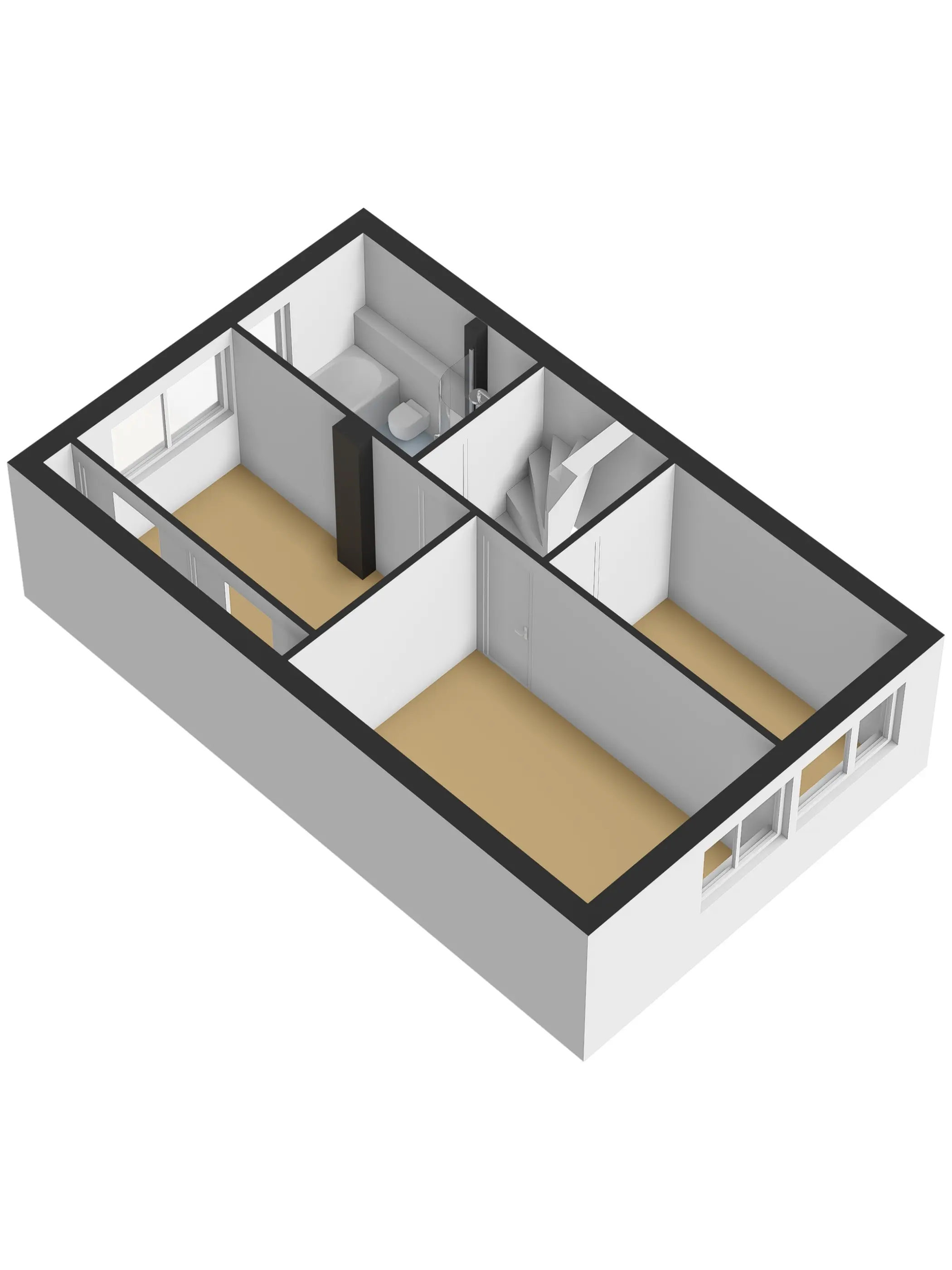 Vanuit de entree/hal is de trap naar de eerste verdieping waar drie slaapkamers aanwezig zijn. Deze zijn voorzien van laminaat vloeren. De slaapkamer aan de voorzijde heeft een grote kastenwand. De badkamer is aan de voorzijde gelegen en is luxe. Deze is geheel betegeld en voorzien van een bad en separate douchecabine, een 2e toilet en een wastafel.
