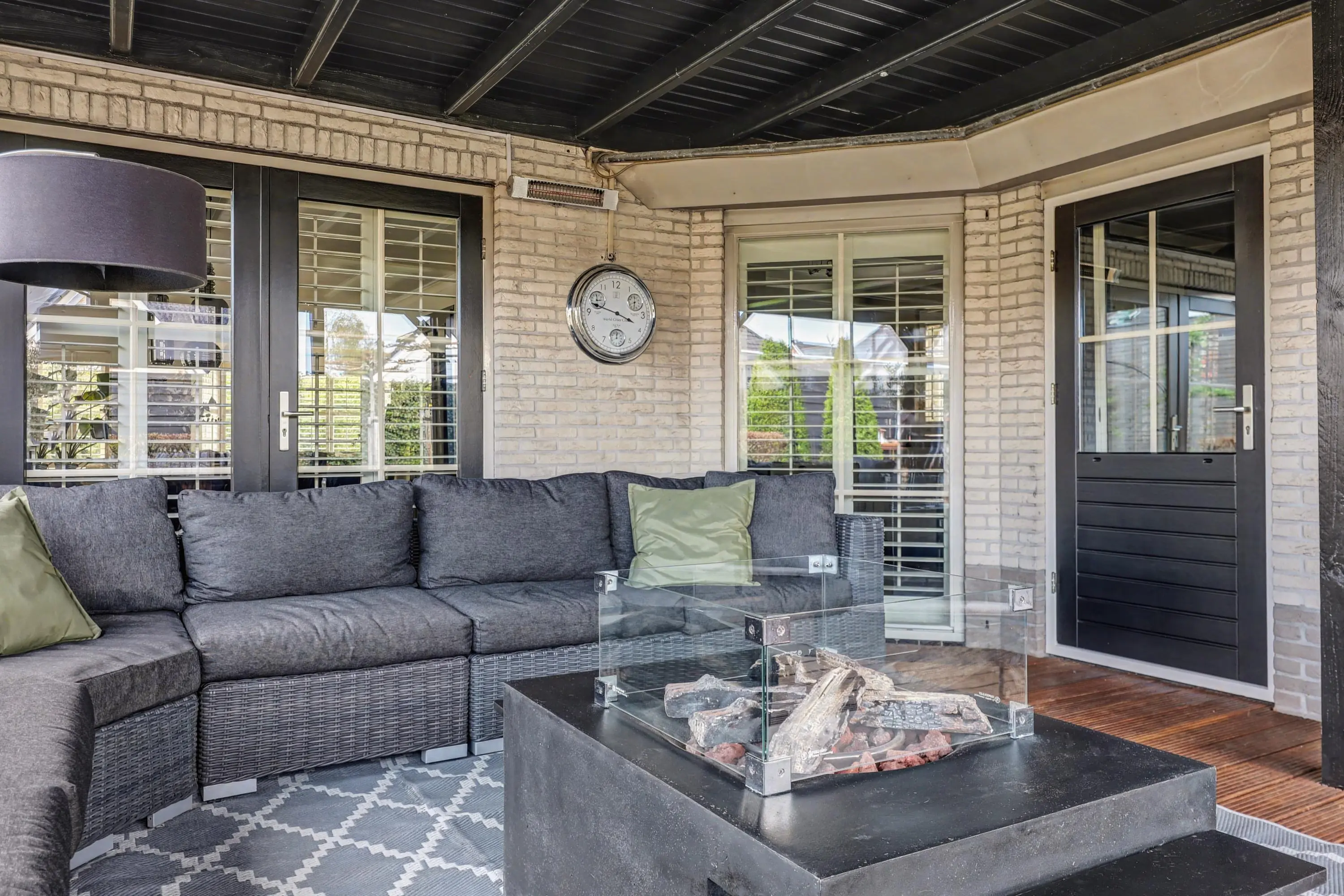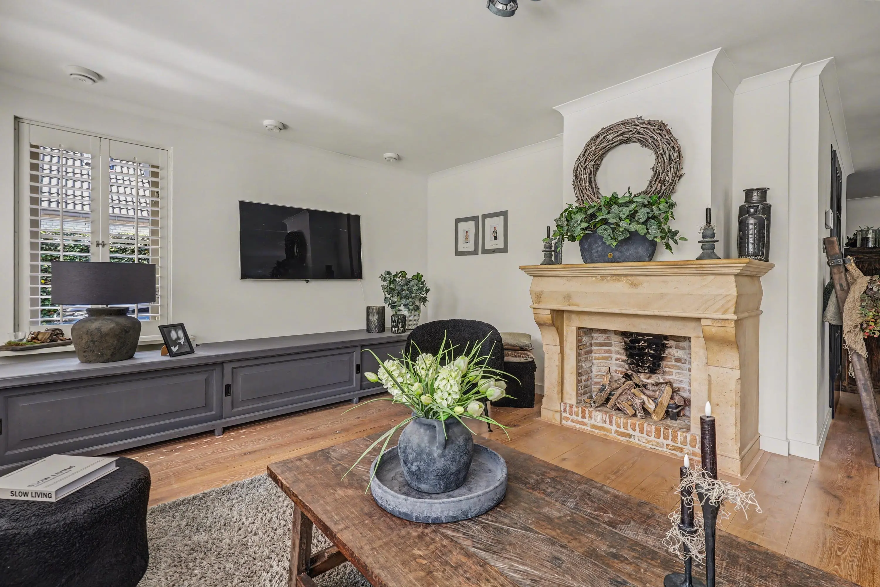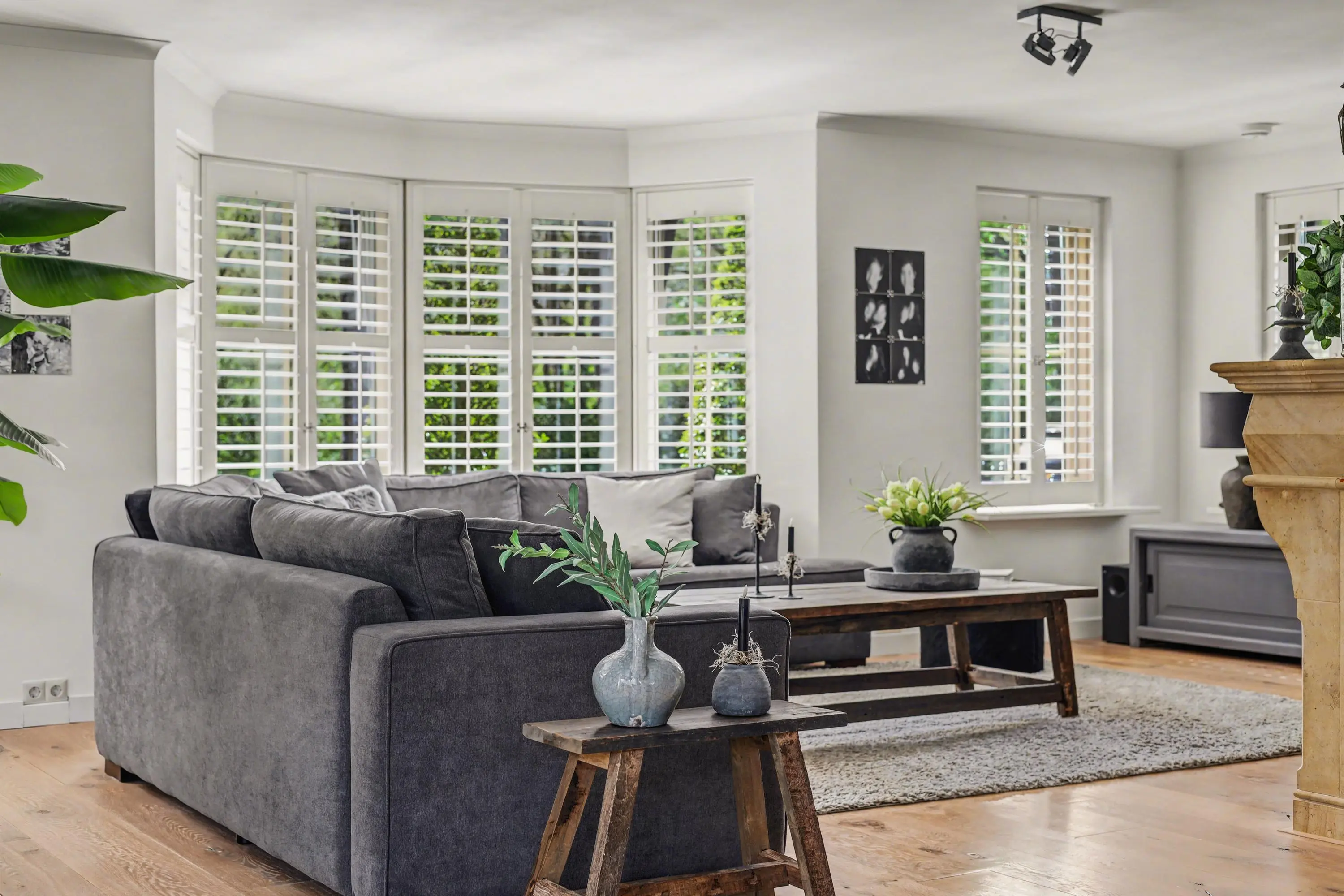 De ruim opgezette woonkamer met open haard heeft veel lichtinval door de raampartijen rondom, alle ramen in het woon- en eetgedeelte zijn afgewerkt met op maat gemaakte shutters.