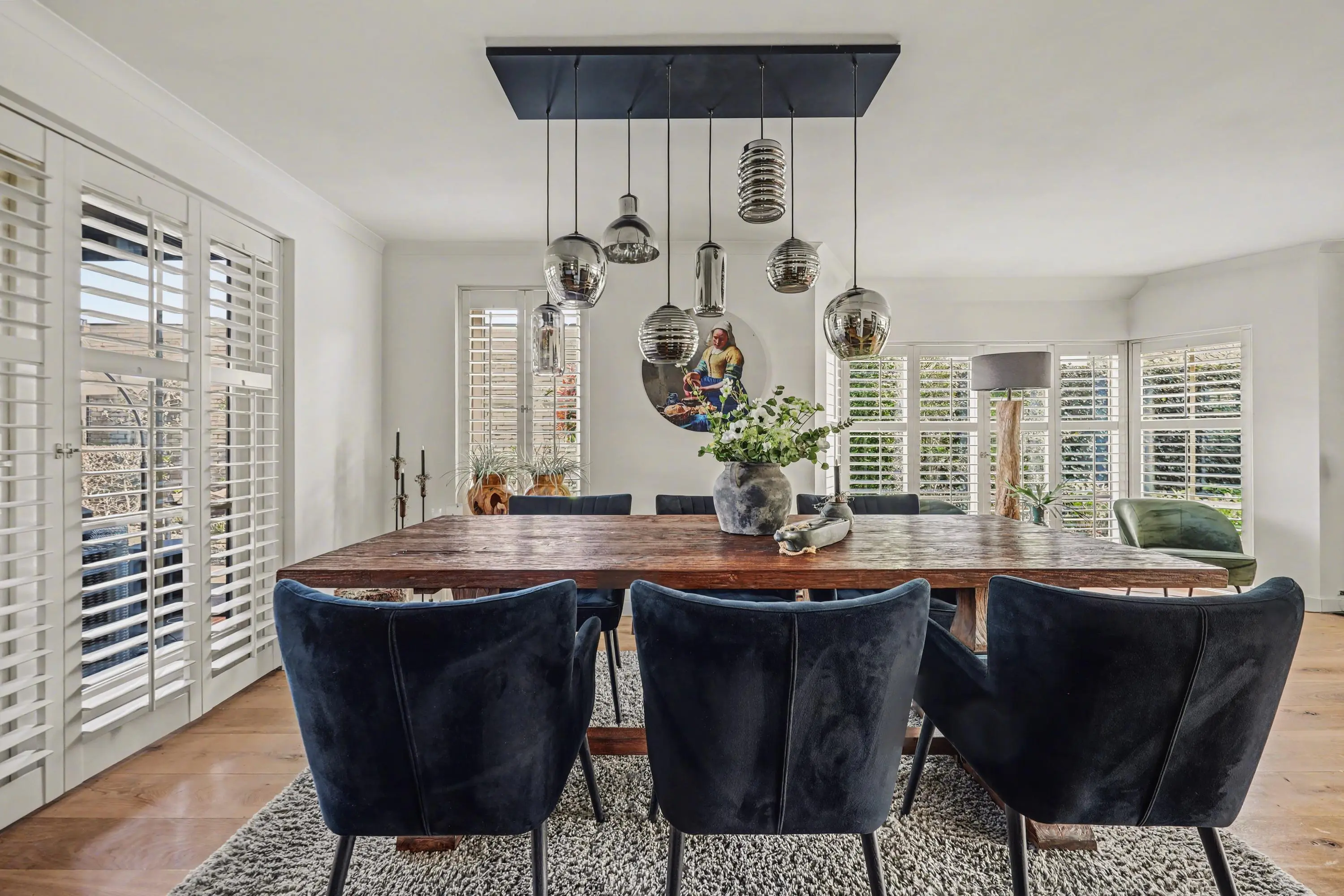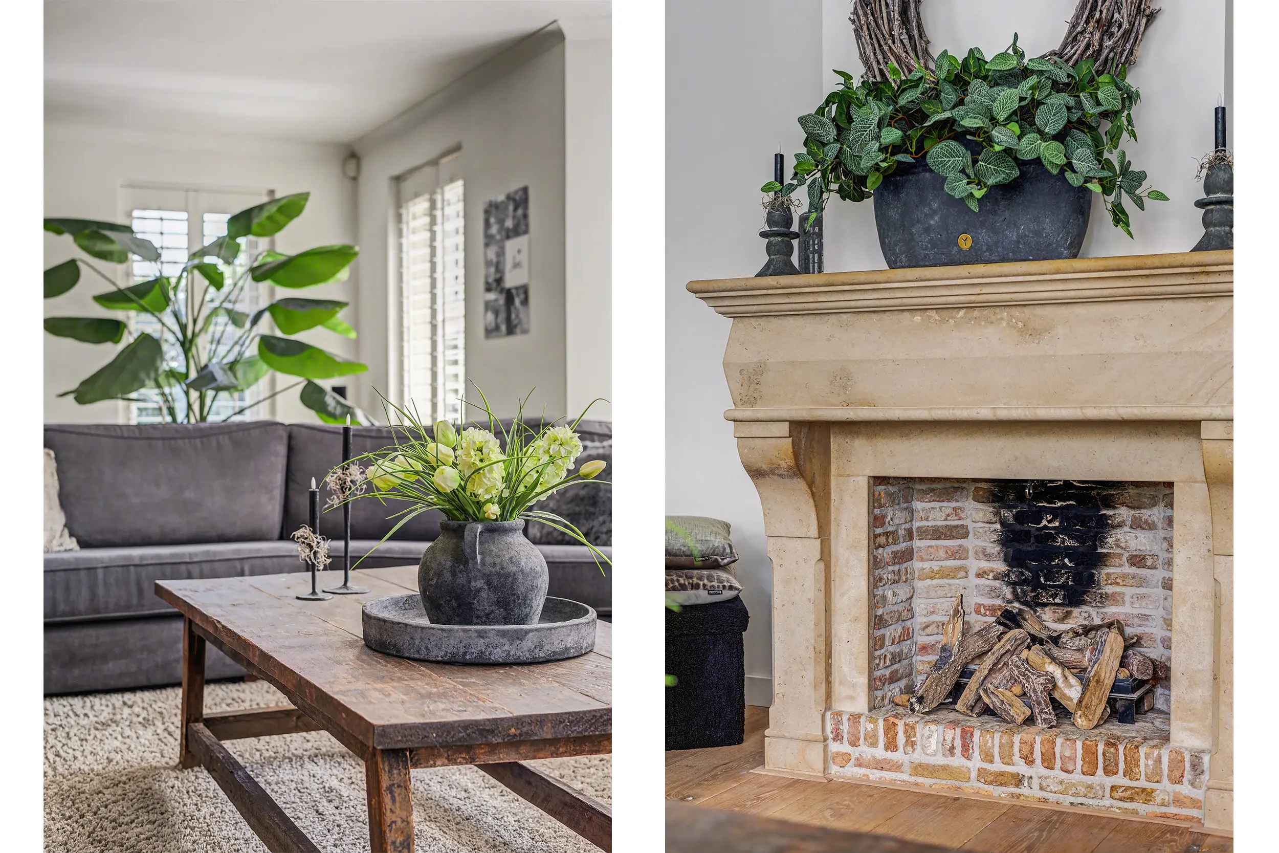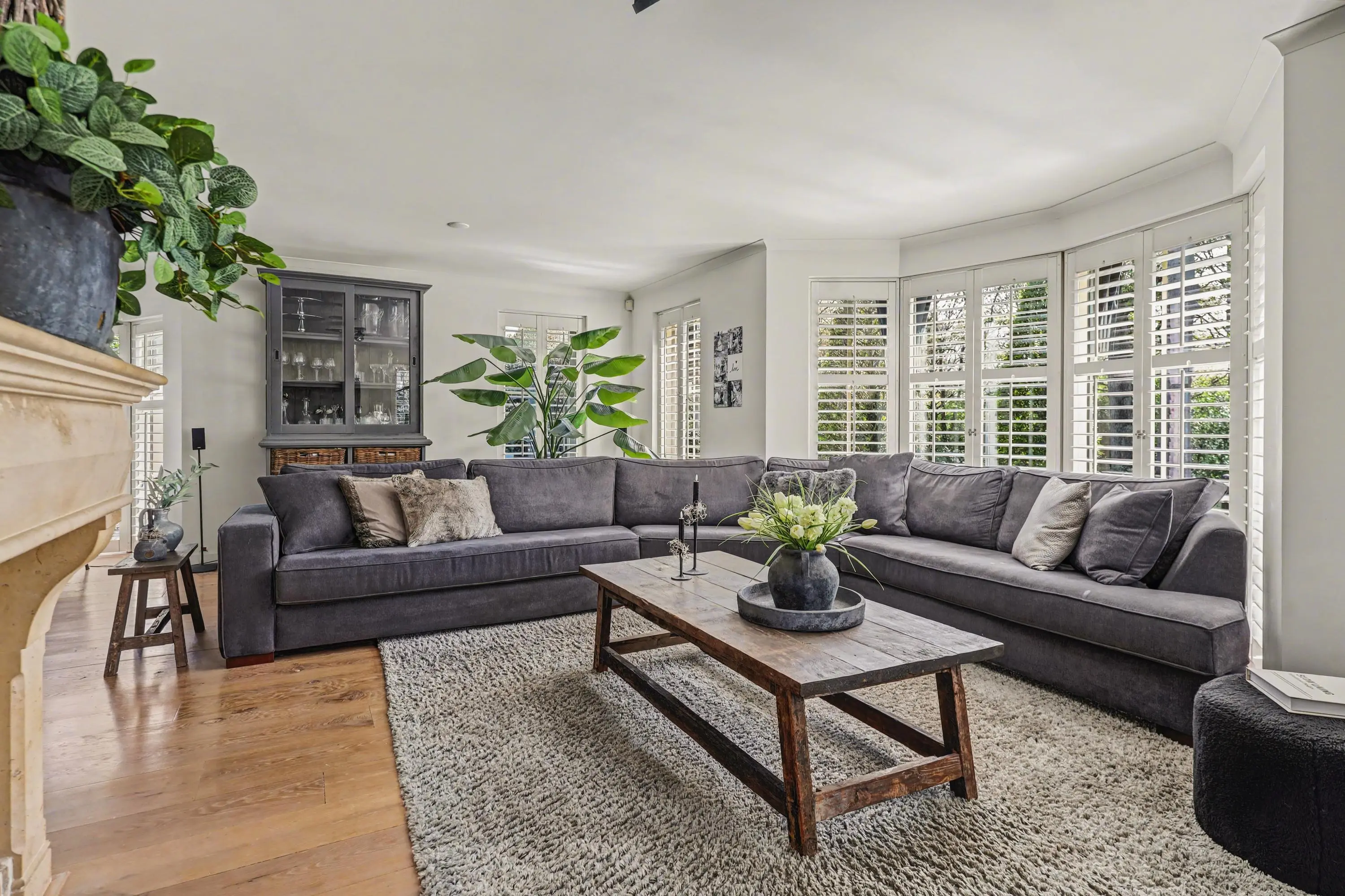 De ruim opgezette woonkamer met open haard heeft veel lichtinval door de raampartijen rondom, alle ramen in het woon- en eetgedeelte zijn afgewerkt met op maat gemaakte shutters.